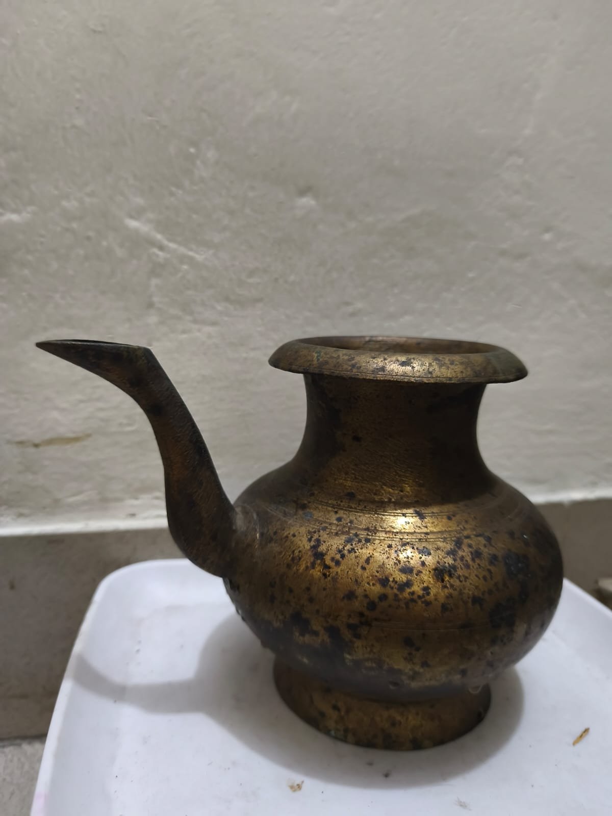 প্রাচীন ধাতব (সম্ভবত পিতল বা তামা) তৈরি লোটার মতো পাত্র, যার সামনে একটি লম্বা মুখ (spout) রয়েছে।