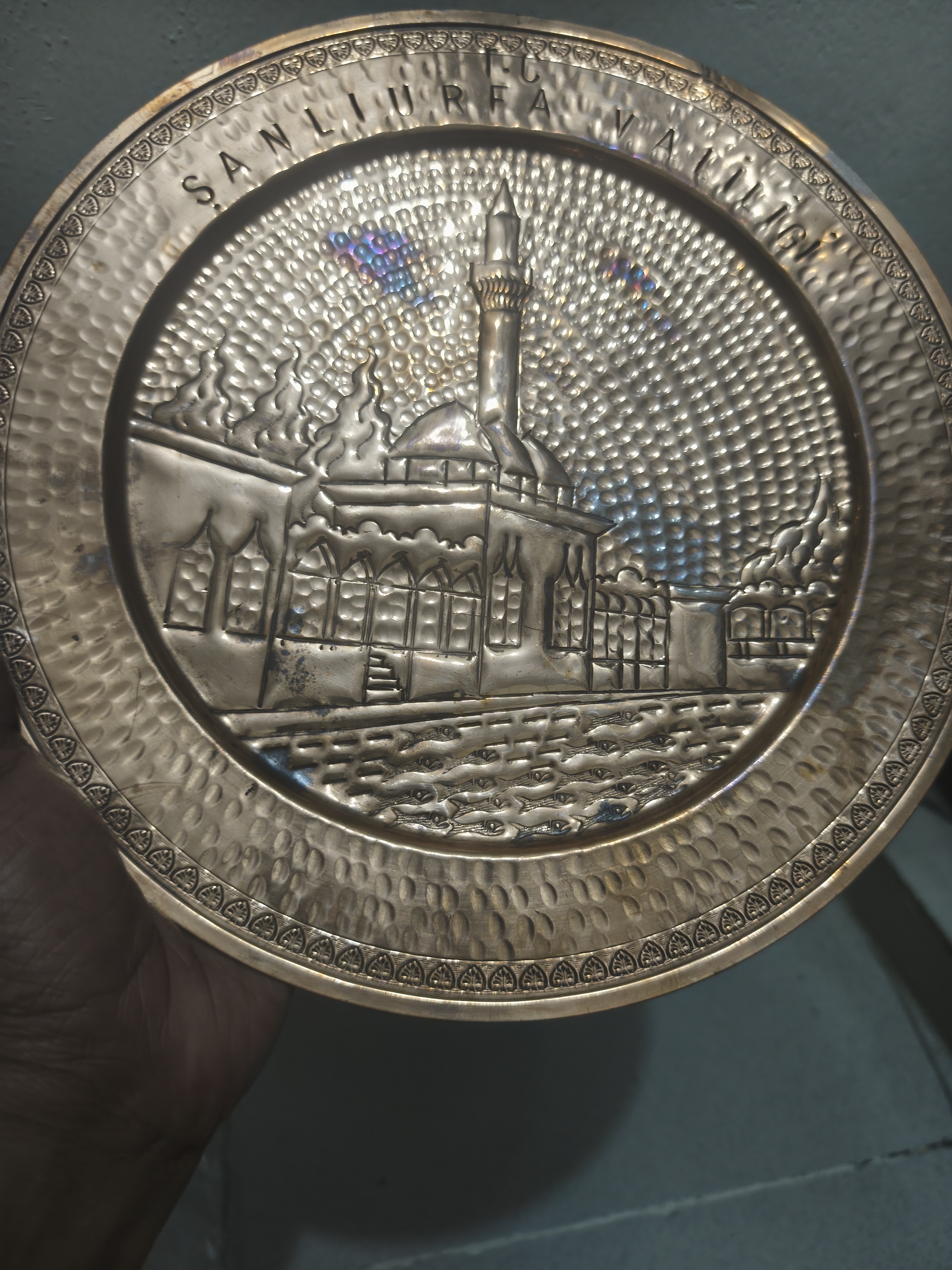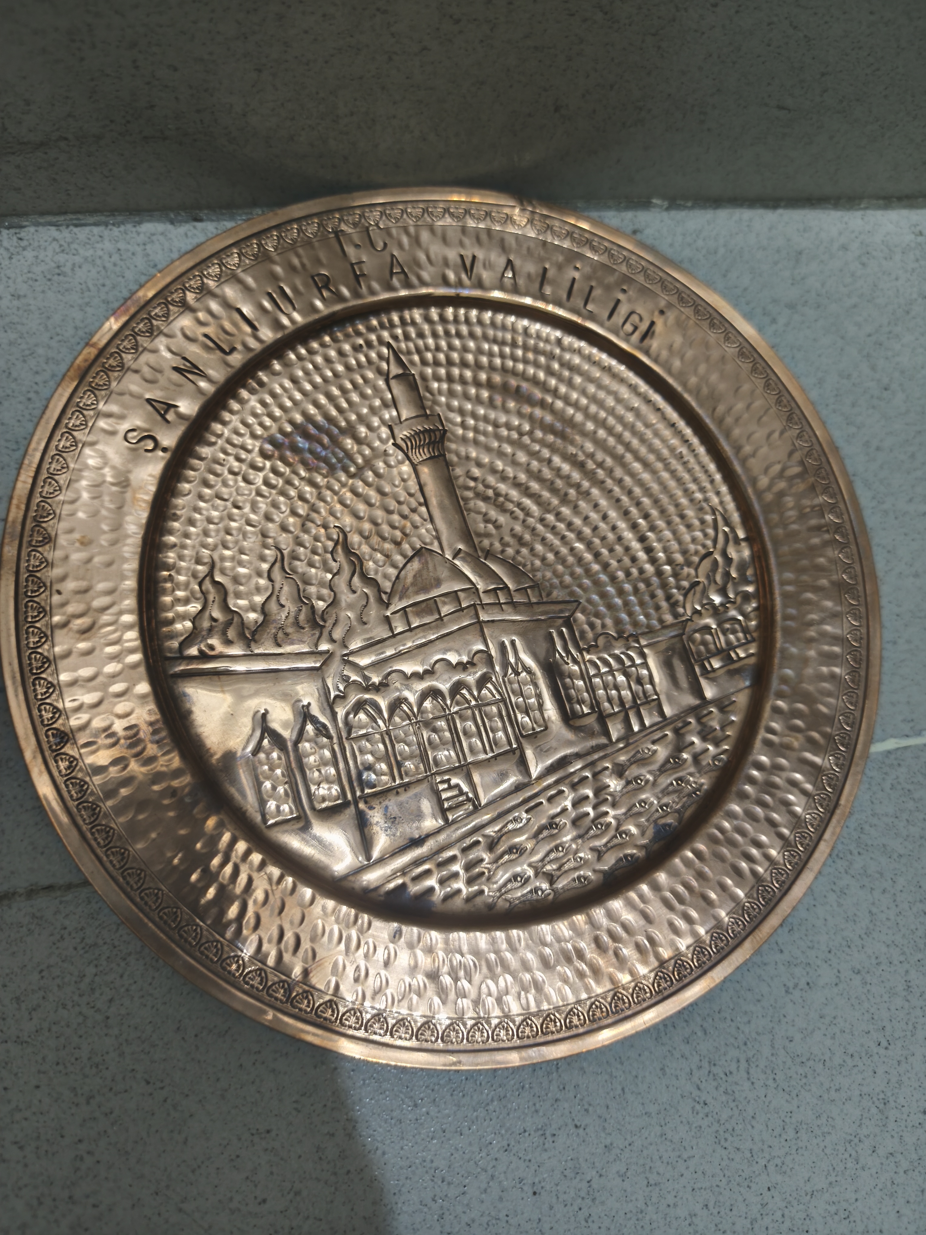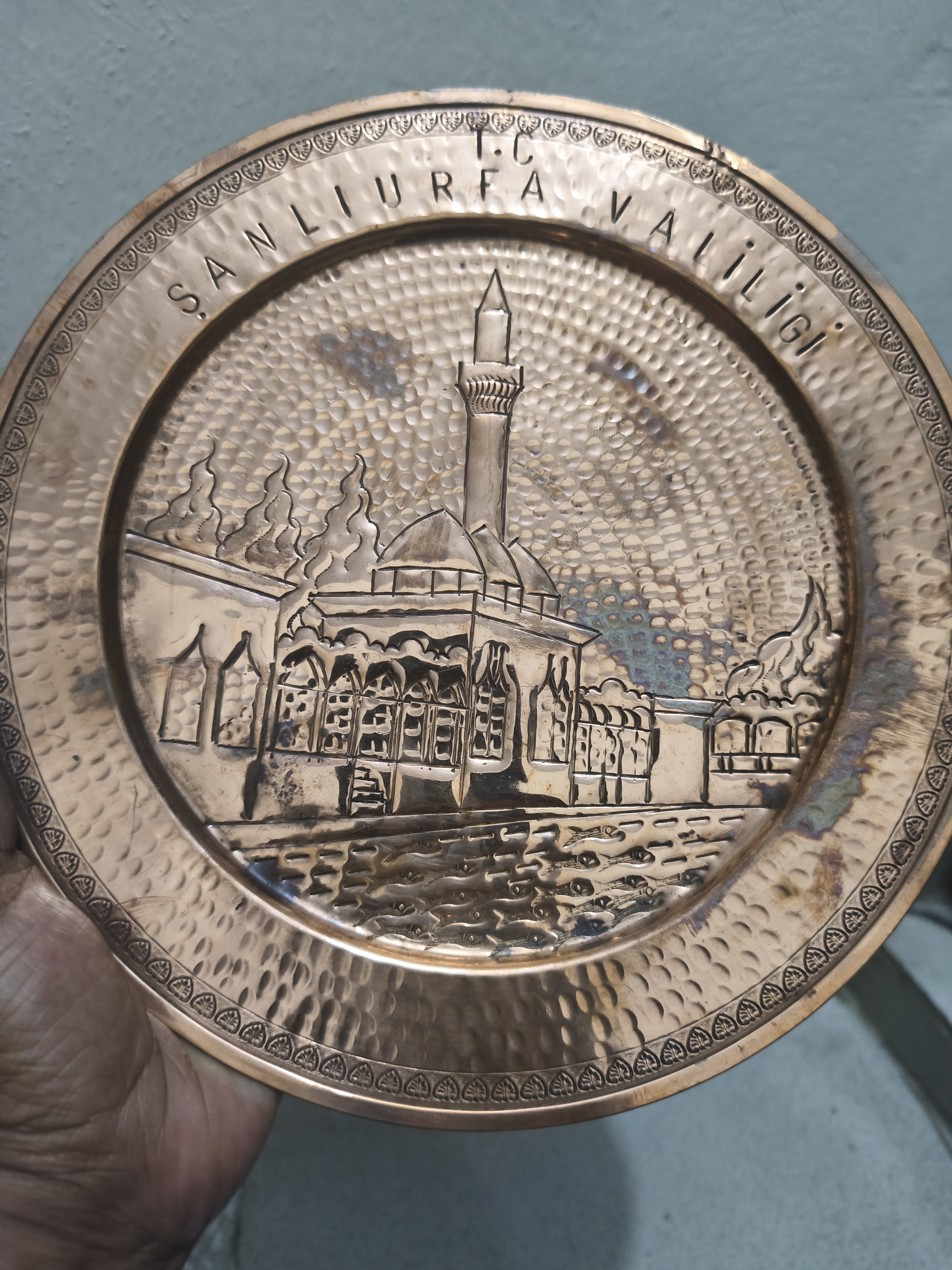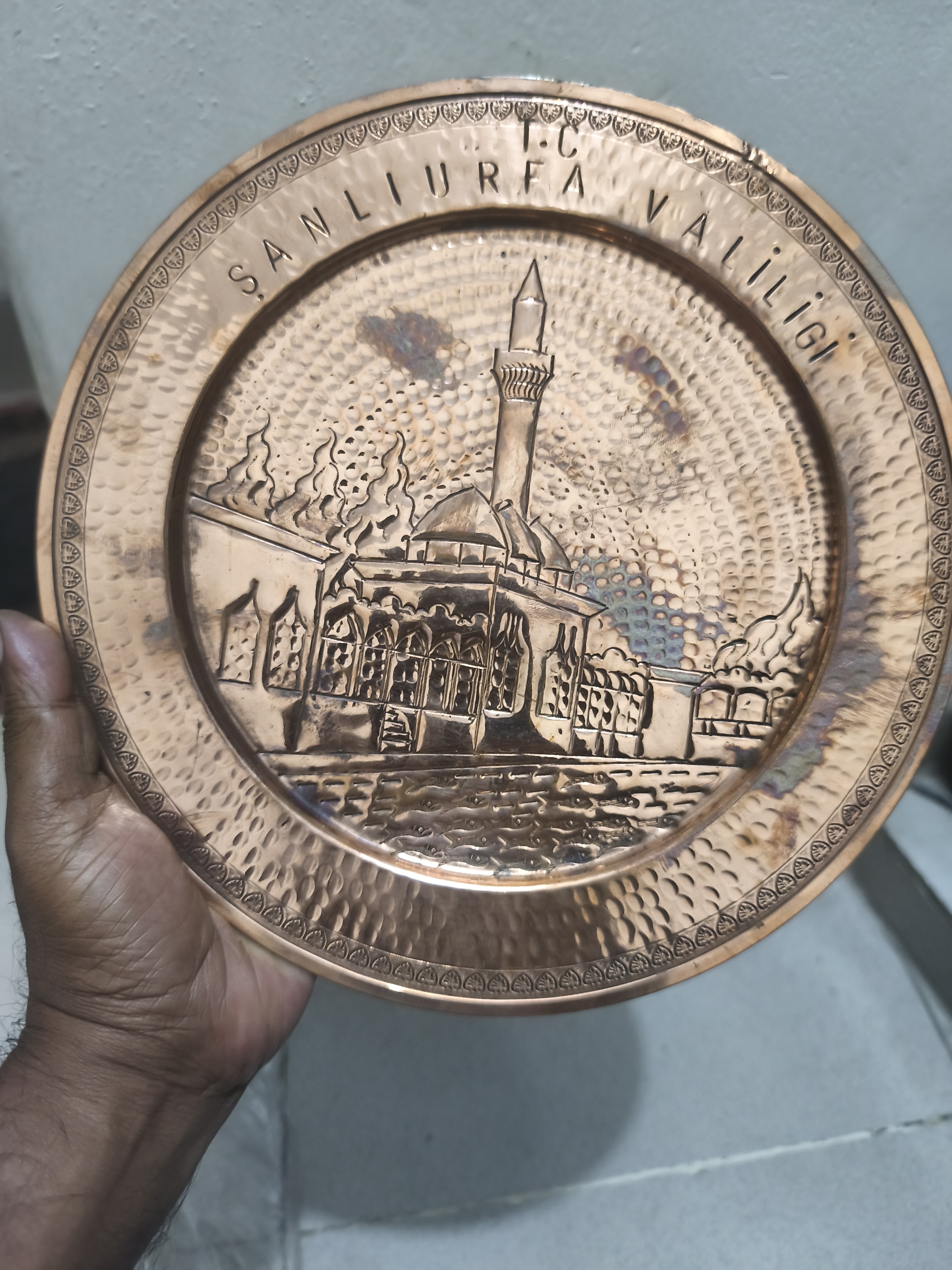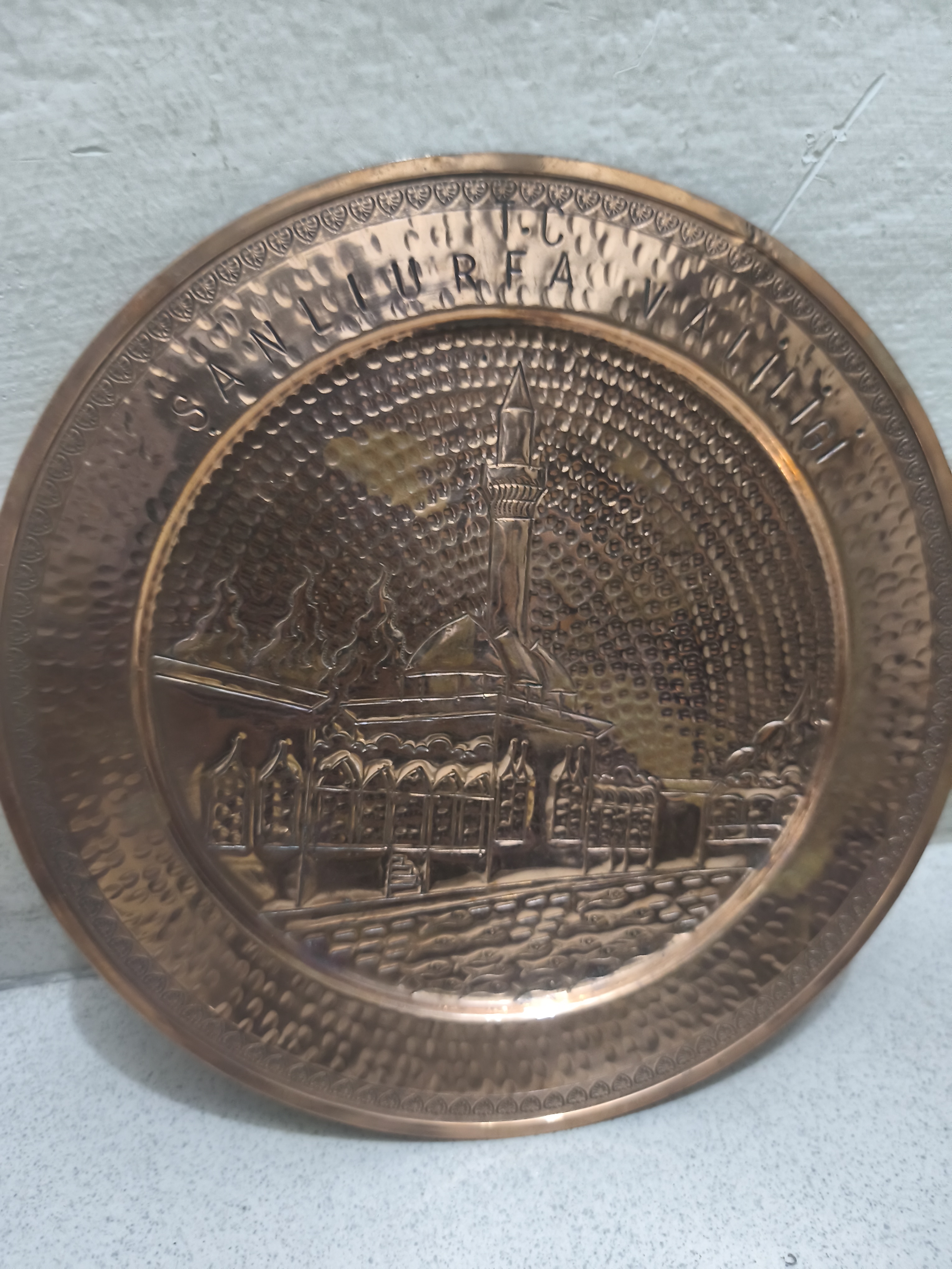 আলংকারিক তামার ওয়াল প্লেট/সানলিউরফা ভ্যালিজ/কেন্দ্রীয় মসজিদ এবং মিনার রয়েছে