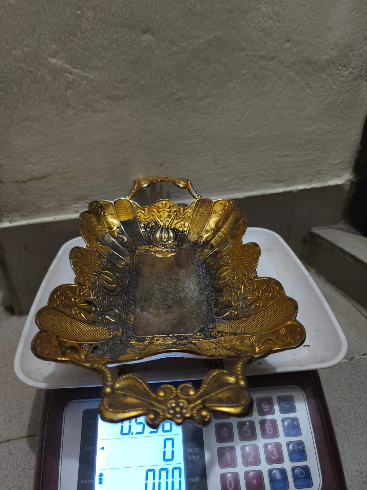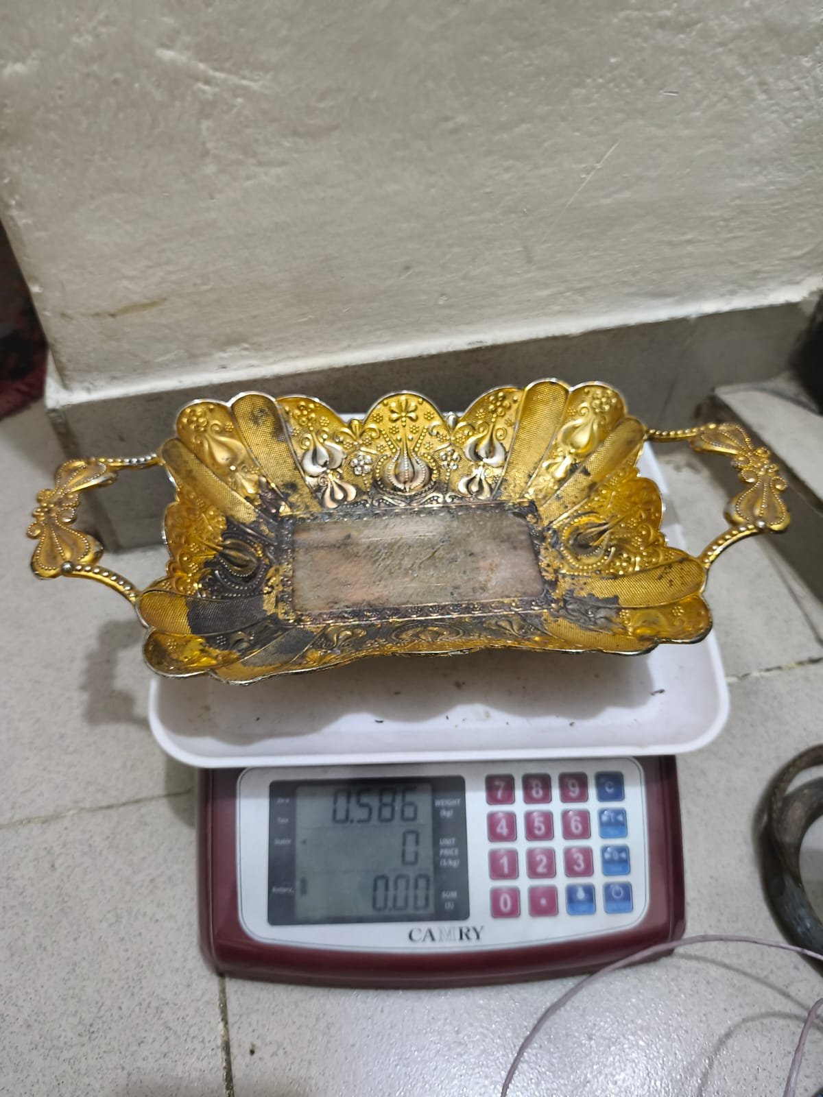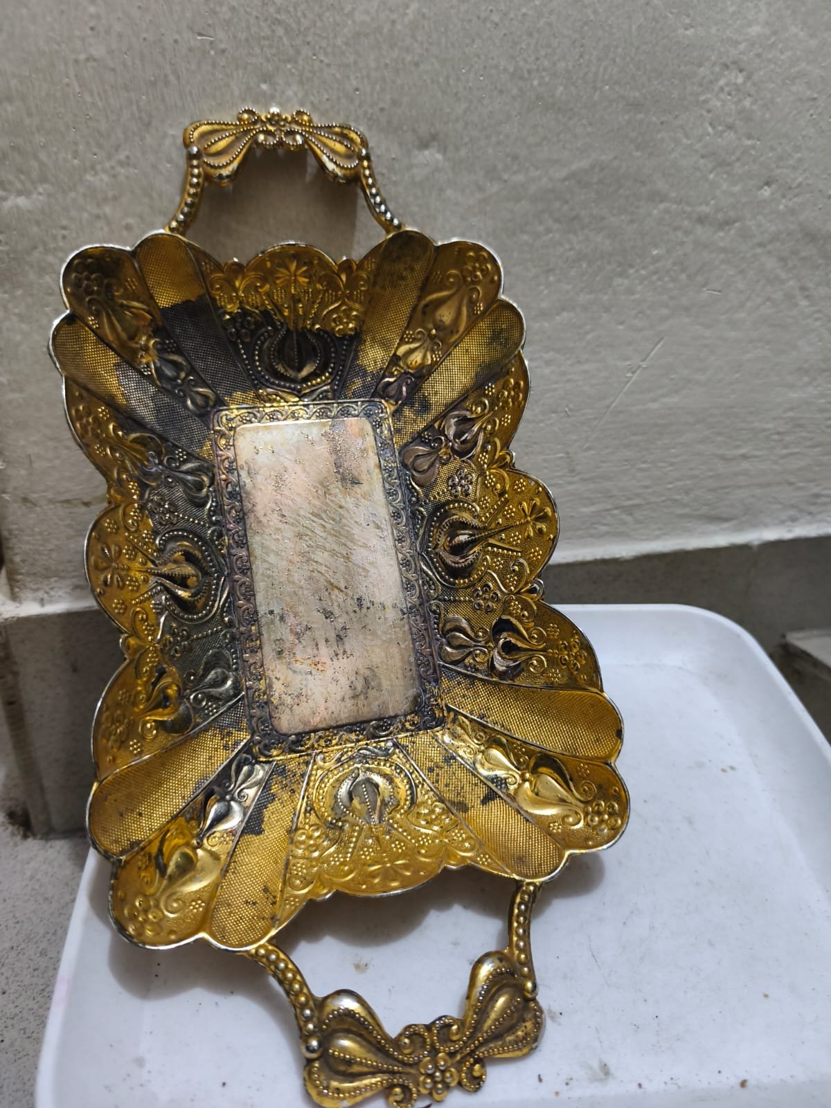 এটি একটি আলংকারিক ধাতব পরিবেশন ট্রে, সম্ভবত একটি ভিনটেজ ফ্লোরেনটাইন বা ভিনিস্বাসী ট্রে, যার নকশাটি অলঙ্কৃত, সোনালী। ট্রেটি প্রায়শই পরিবেশনের জন্য বা গয়নার মতো ছোট জিনিস রাখার জন্য সাজসজ্জার জিনিস হিসেবে ব্যবহৃত হয়।