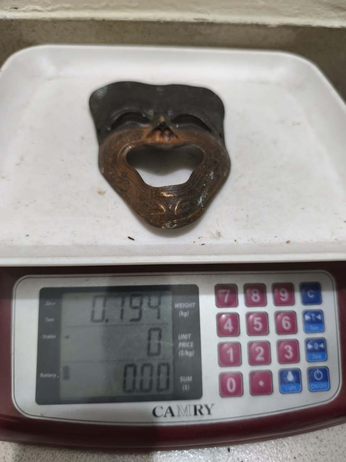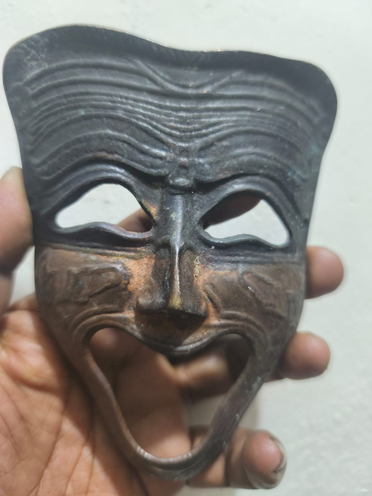 এই ধাতব মুখোশটি একটি উজ্জ্বল ও প্রাণবন্ত হাসির অভিব্যক্তি প্রকাশ করে। মুখের রেখাগুলো সূক্ষ্মভাবে খোদাই করা, যা আনন্দ ও উদ্দীপনার অনুভূতি জাগায়। এর বাদামি-তামাটে রঙ এবং পুরনো ধাতব আবরণ এটিকে একটি প্রাচীন শিল্পকর্মের আবহ দেয়। এটি ঘর সাজানোর উপকরণ হিসেবে বা নাট্যকলার প্রতীক হিসেবে ব্যবহারের উপযোগী।