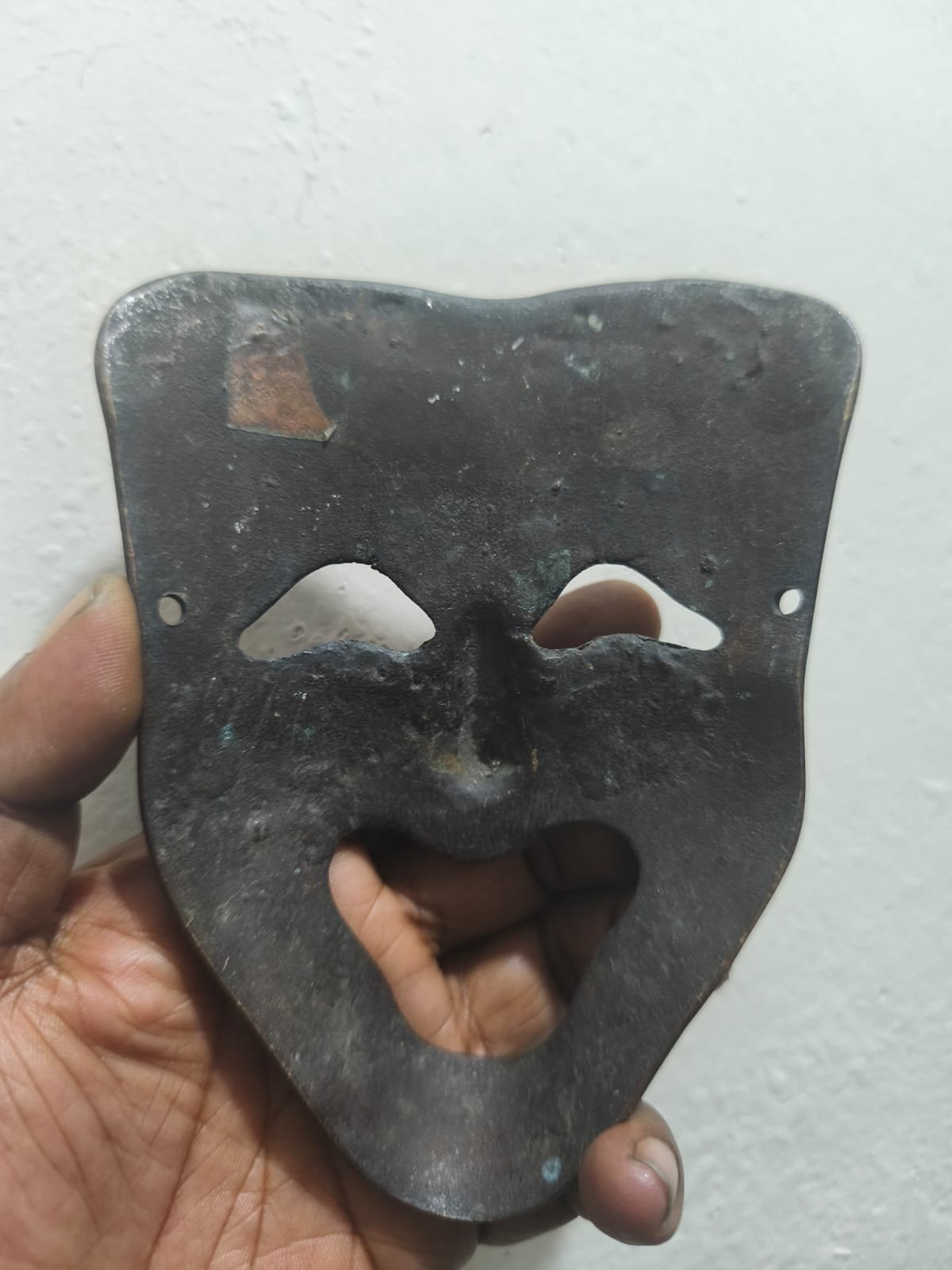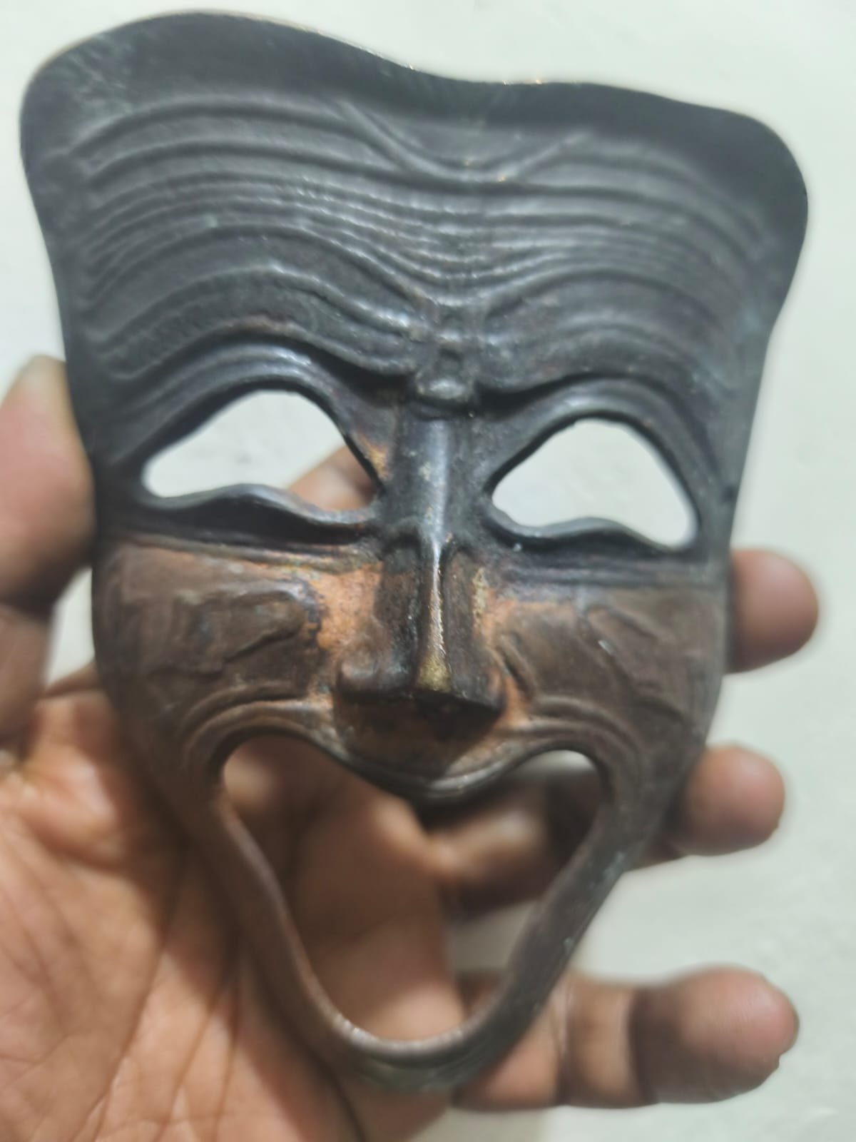 এটি একটি ধাতব মুখোশ (metal mask) — দেখতে মনে হচ্ছে এটি একটি কমেডি বা হাস্যরসাত্মক থিমের নাট্য মুখোশ, যা সাধারণত থিয়েটার বা শৈল্পিক প্রদর্শনীর প্রতীক হিসেবে ব্যবহৃত হয়।