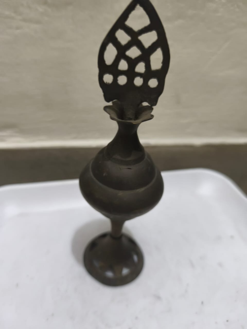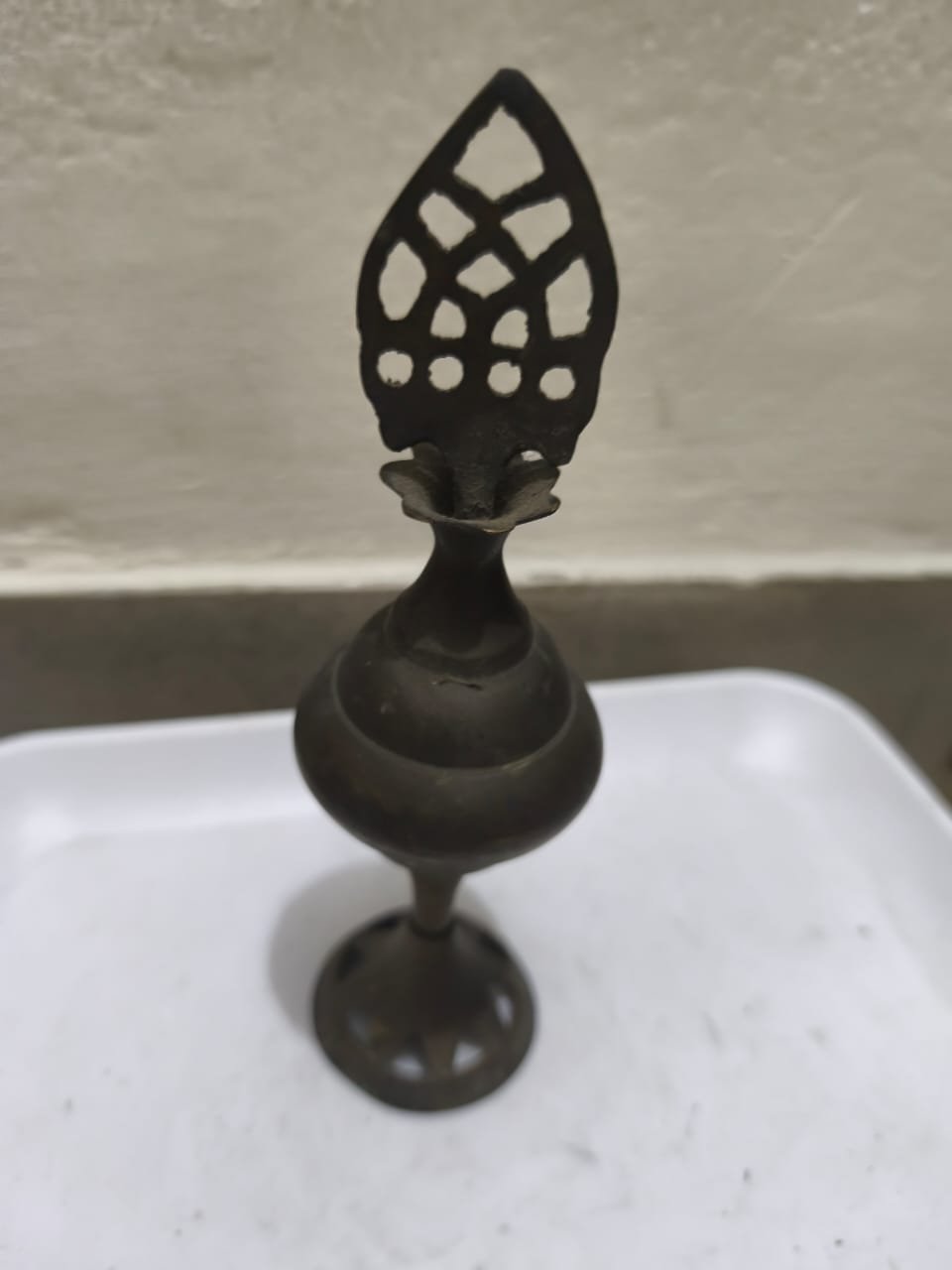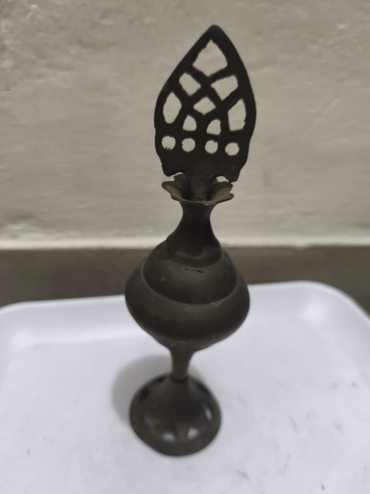 - নকশা: ধারকটি প্রায়শই হস্তনির্মিত এবং এতে একটি প্রাচীন বা ঐতিহ্যবাহী নকশা থাকে, যেমন পাতার আকৃতির শীর্ষটি ছবিতে দেখা জালির নকশা সহ।
