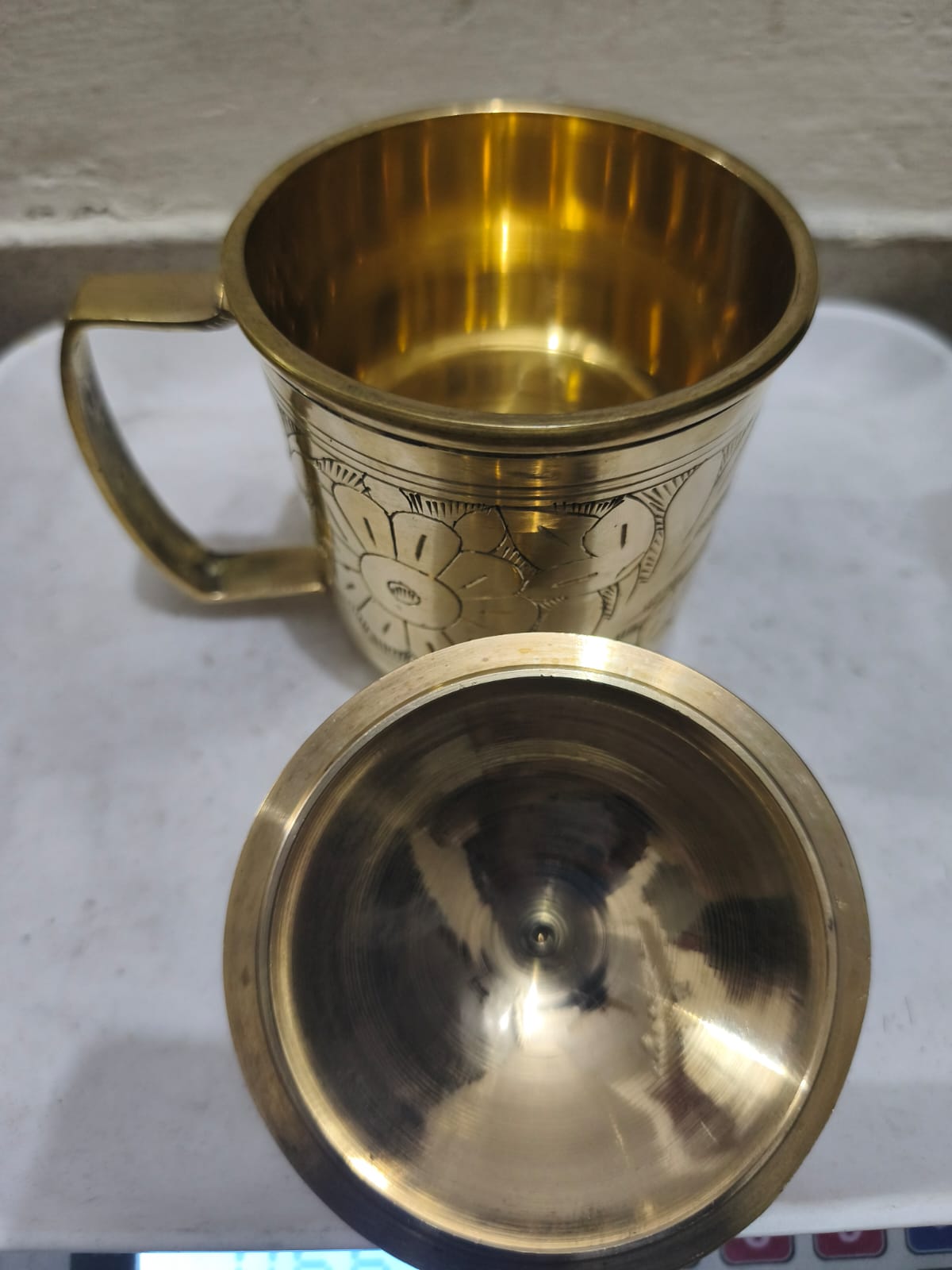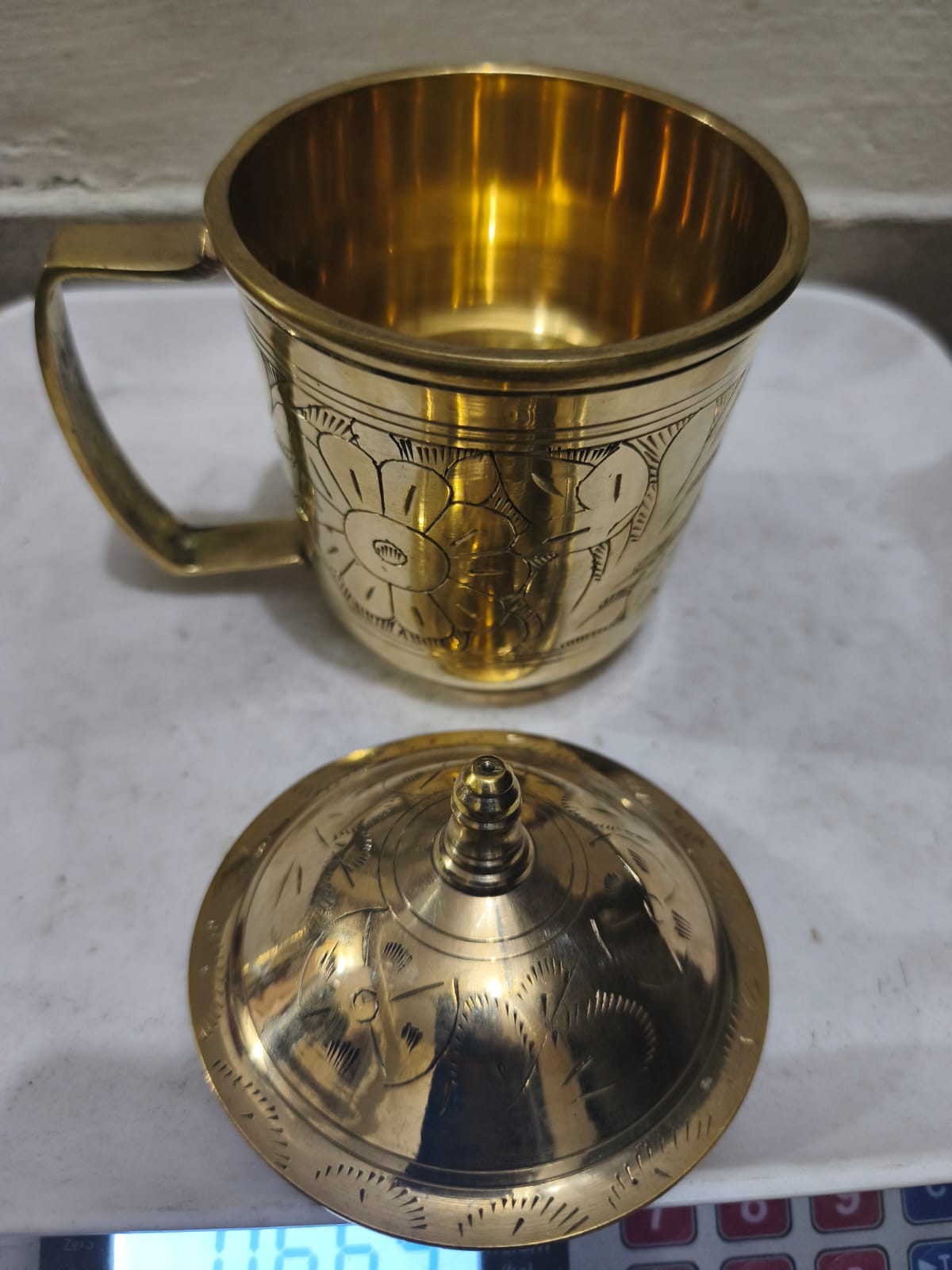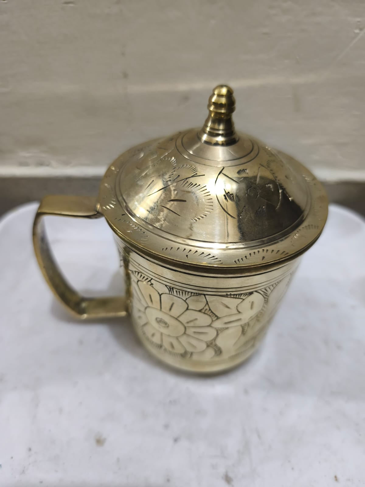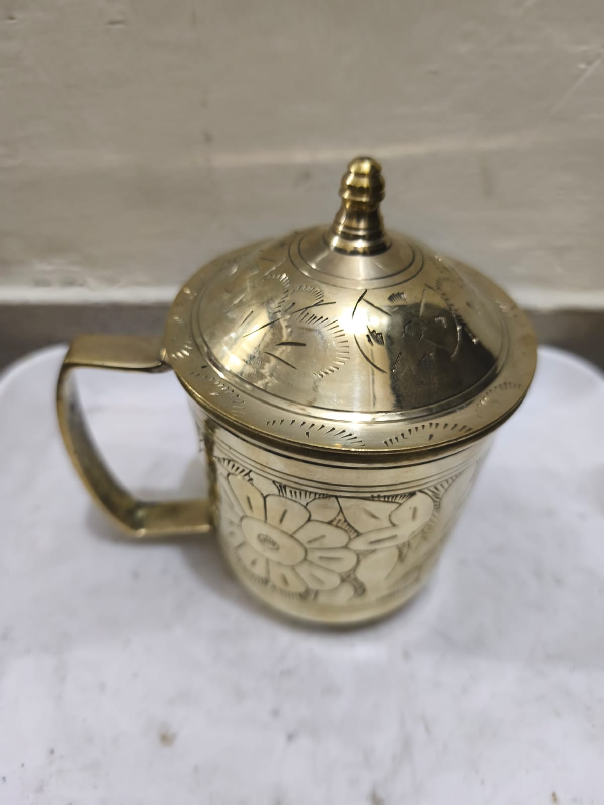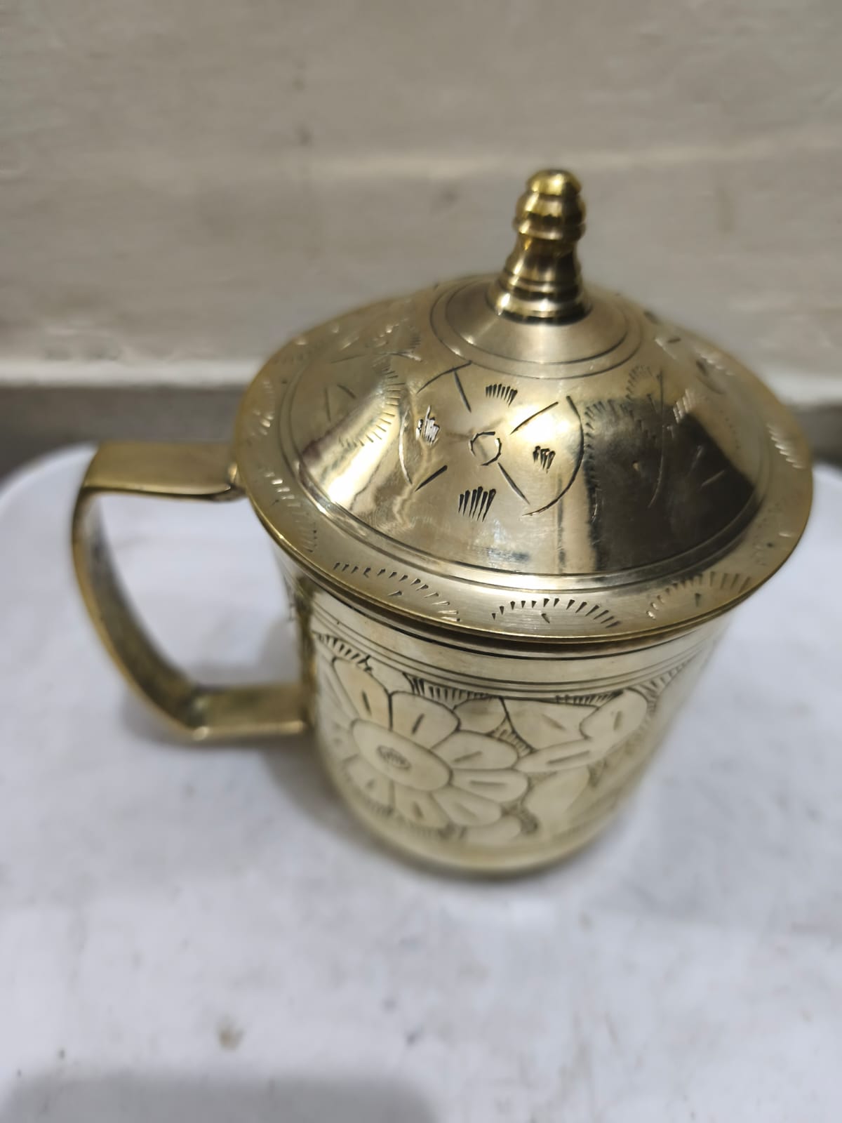 একটি পিতলের ঢাকনাসহ জলের মগ