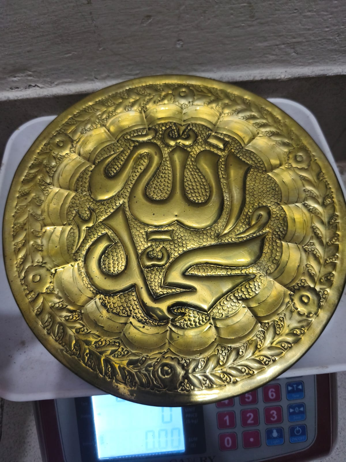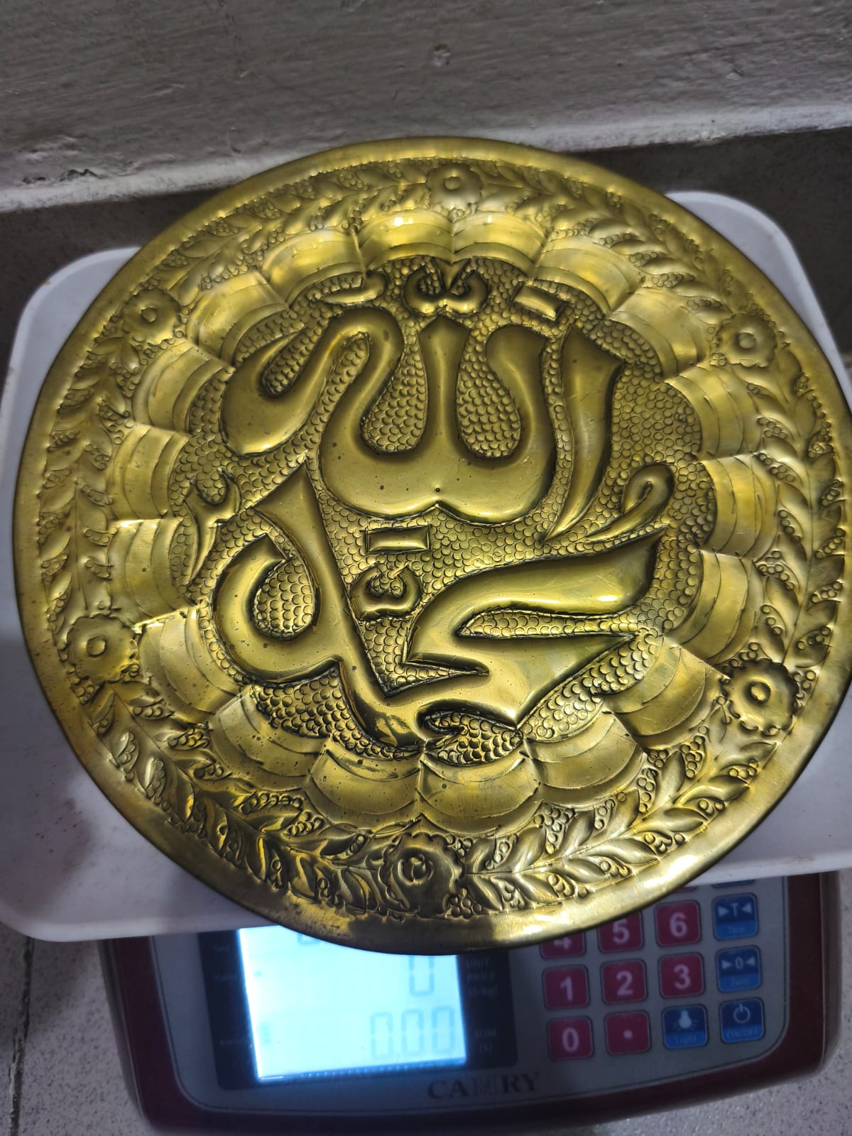 একটি পিতলের তৈরি ইসলামিক ক্যালিগ্রাফি প্লেট. এতে আরবি হরফে "আল্লাহ" (উপরে) এবং "মুহাম্মদ" (নিচে) লেখা রয়েছে