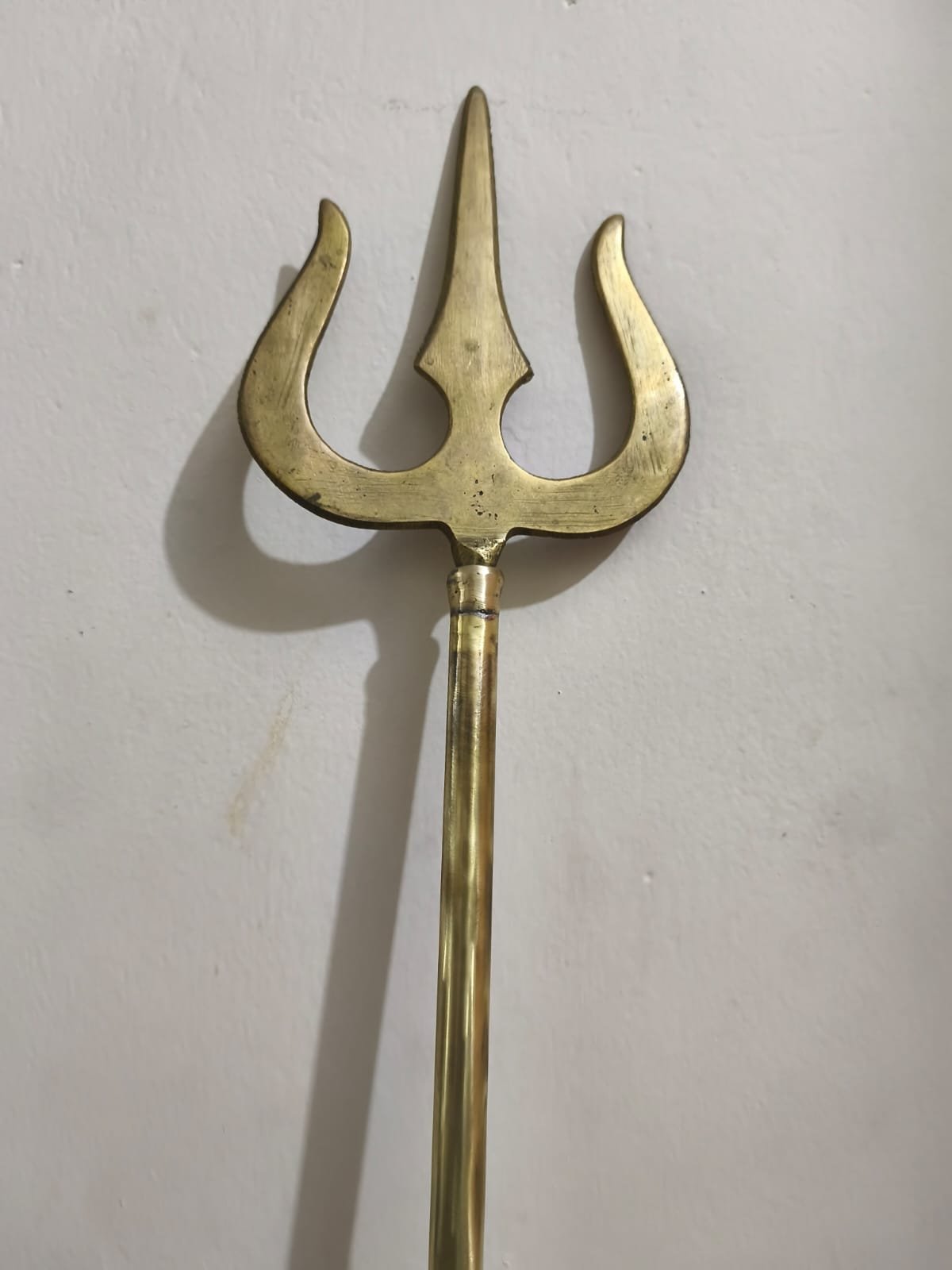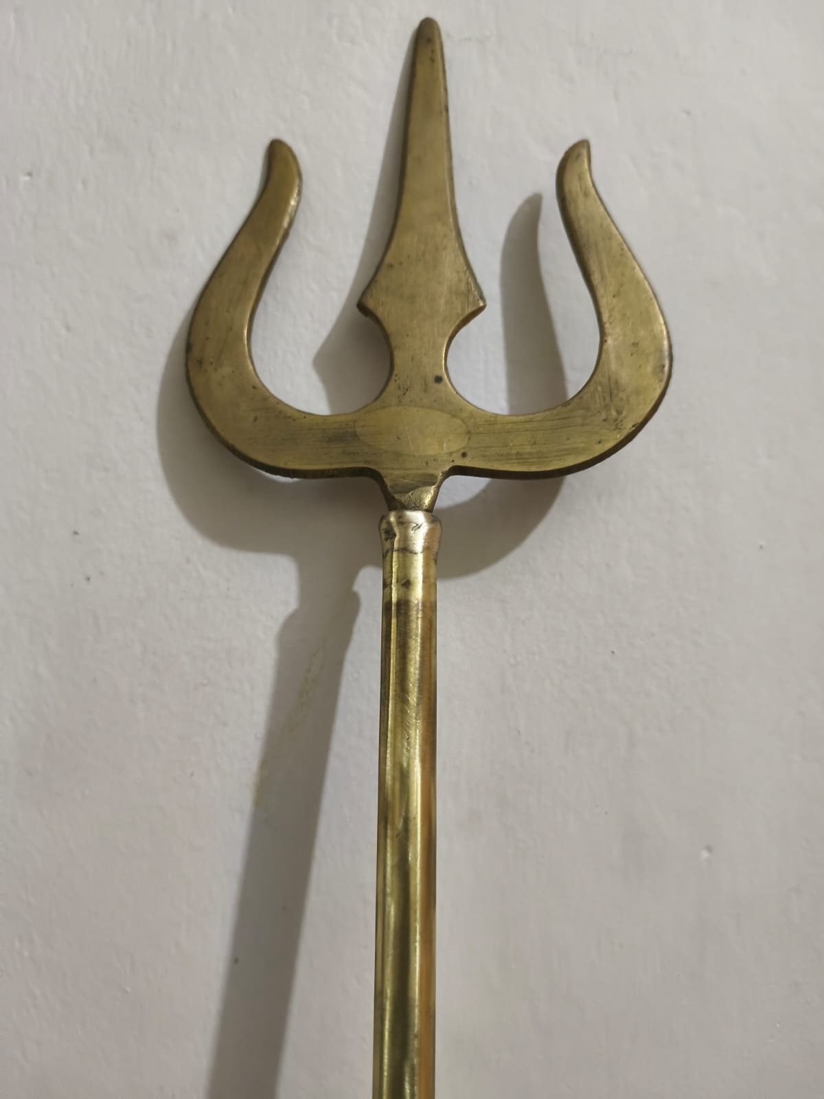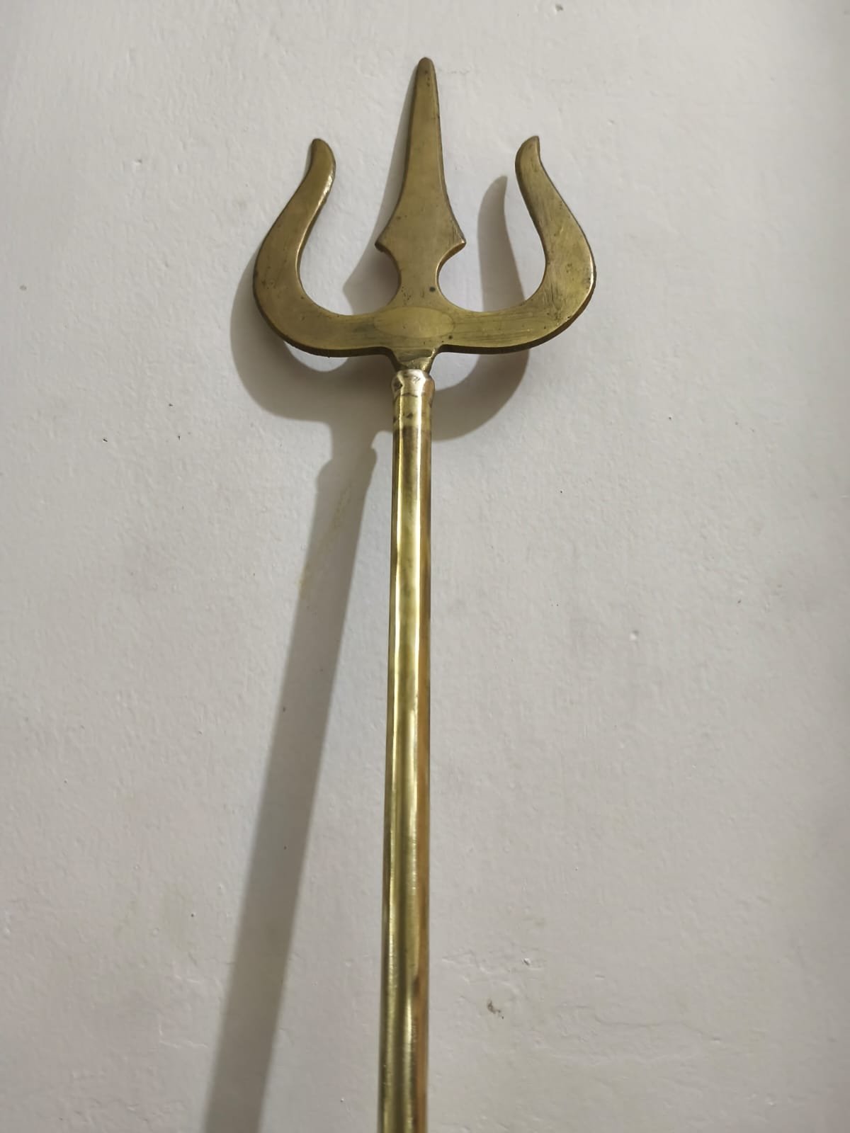 একটি পিতলের ত্রিশূল, যা একটি ত্রিশূল। হিন্দু ধর্মে ত্রিশূল একটি গুরুত্বপূর্ণ প্রতীক, যা ভগবান শিবের অস্ত্রের প্রতিনিধিত্ব করে।