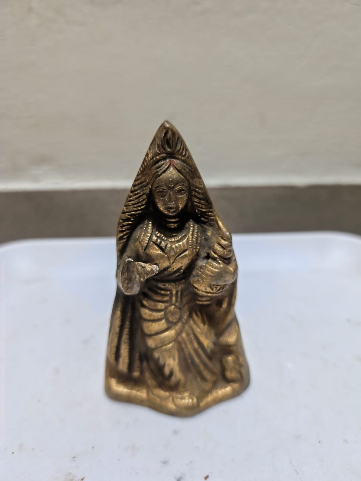 এটি একটি পিতলের দেবীমূর্তি, যা সাধারণত লক্ষ্মী বা পার্বতী দেবীর রূপে গঠিত। দেবী আসনে বসা অবস্থায় আছেন, এক হাতে আশীর্বাদমুদ্রা এবং অপর হাতে সম্ভবত পদ্ম বা অন্যান্য প্রতীকধারণ করেছেন। মূর্তিটির পোশাক ও অলঙ্কারে লালচে রঙের আভা দেওয়া আছে, যা সৌন্দর্য বাড়িয়েছে।