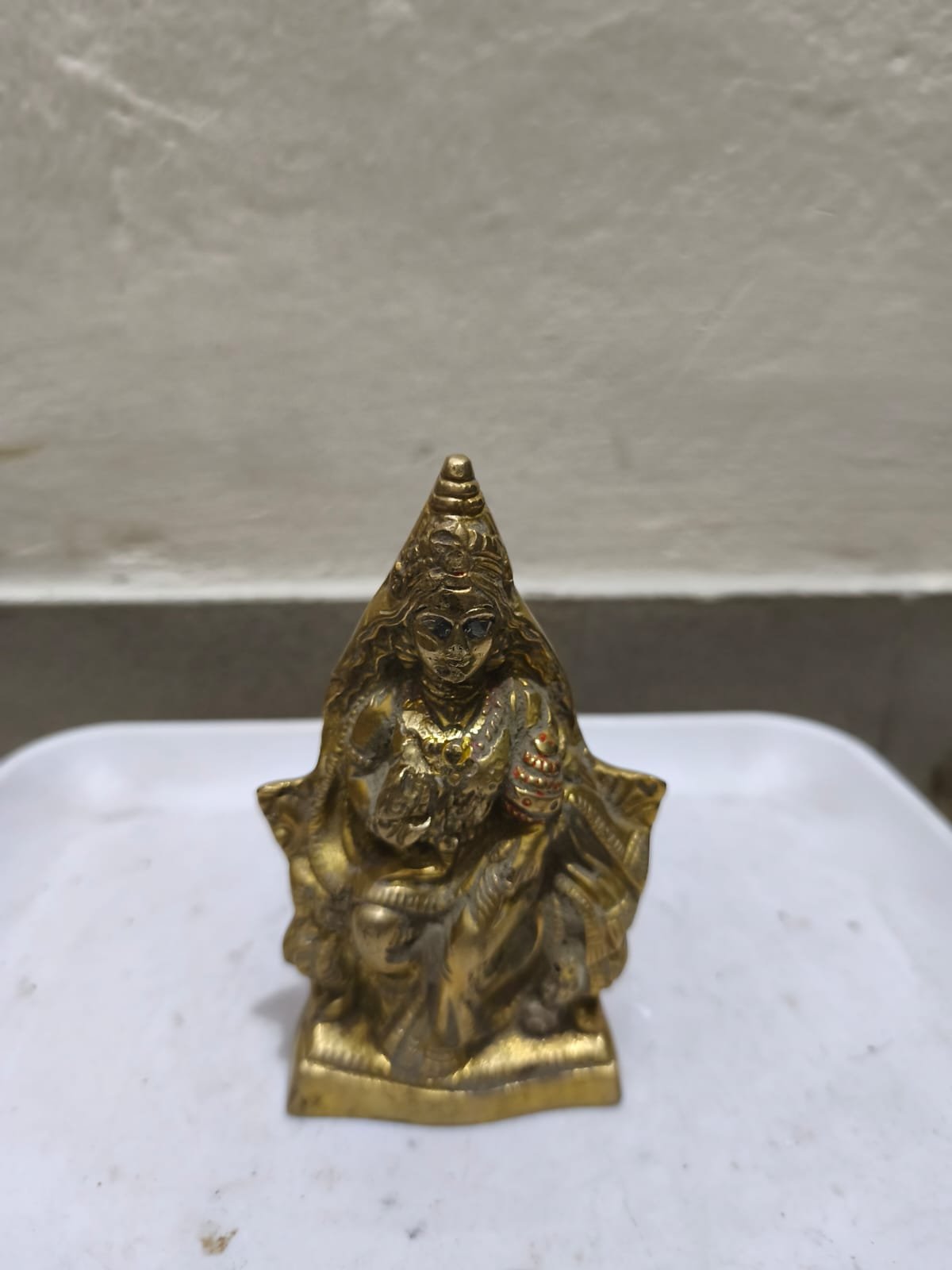 একটি পিতলের দেবীমূর্তি। মূর্তিটি সূক্ষ্মভাবে খোদাই করা, এবং এর গায়ে অলঙ্কার, পোশাক ও মুখাবয়বের নিখুঁত কারুকাজ লক্ষণীয়।