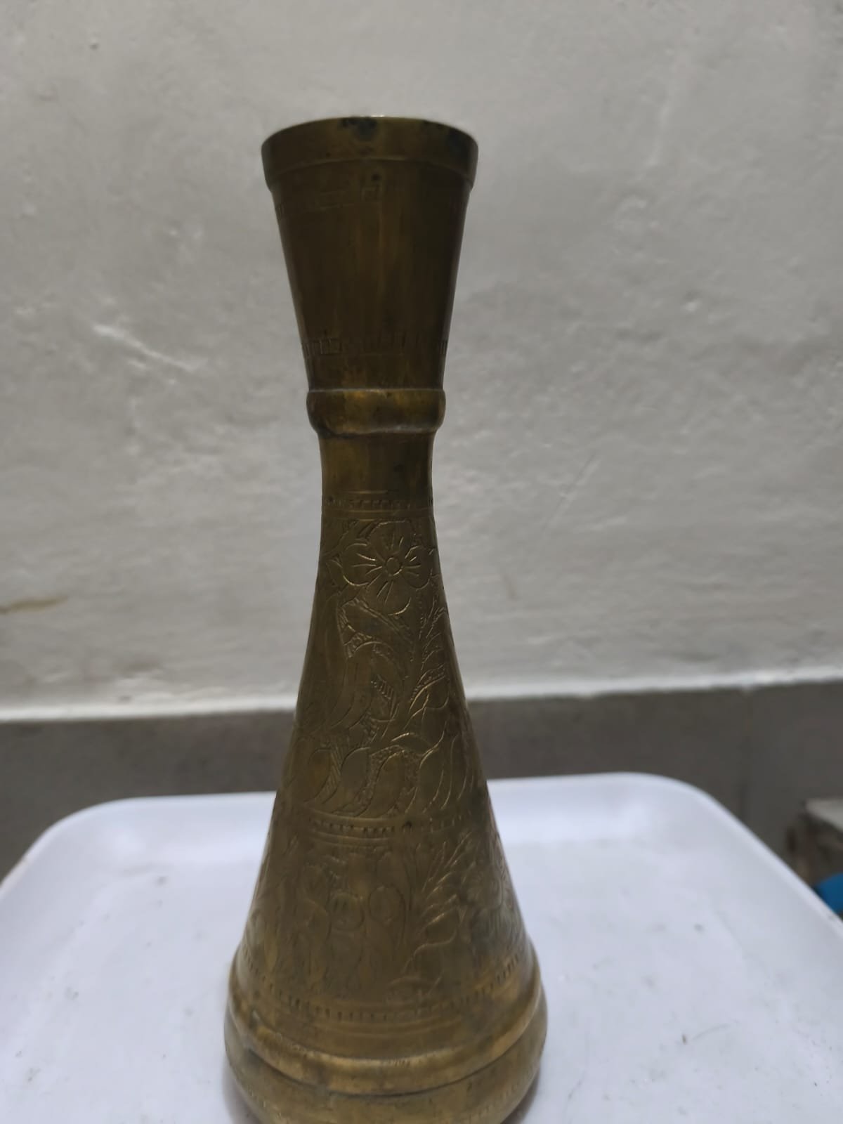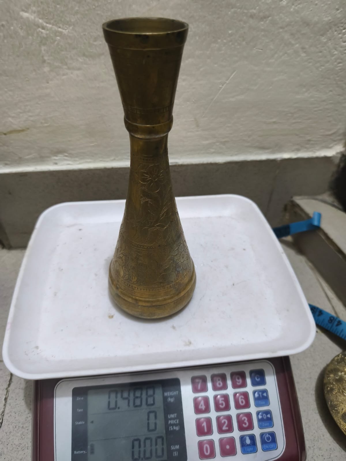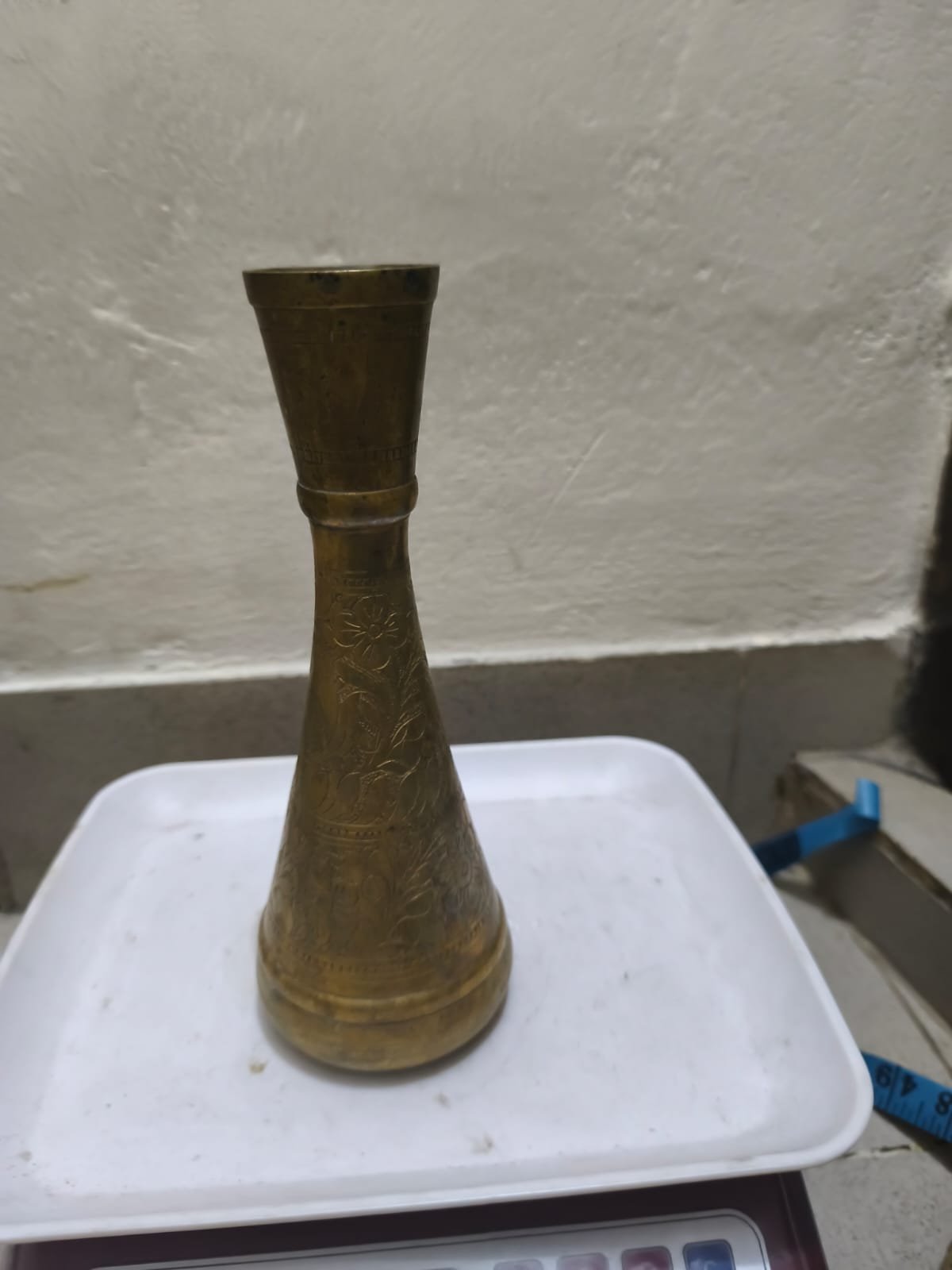 এই পাত্রটি একটি পিতলের খোদাই করা অলংকার সামগ্রী। এর নিচের অংশ চওড়া ও উপরের অংশ সরু, মাঝখানে হালকা বেল্টের মতো মোটা রিং আকৃতি রয়েছে। গায়ে সূক্ষ্মভাবে ফুল ও লতাপাতার নকশা খোদাই করা, যা হাতে তৈরি কারুকাজের নিদর্শন।