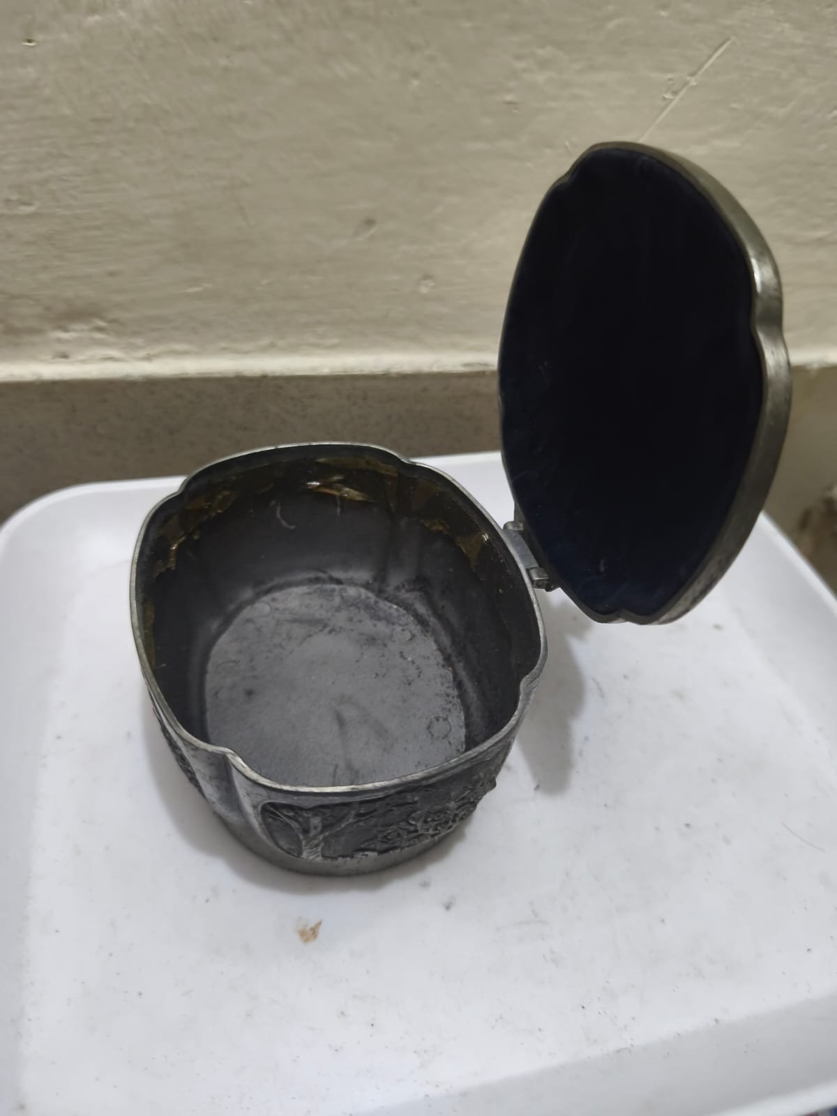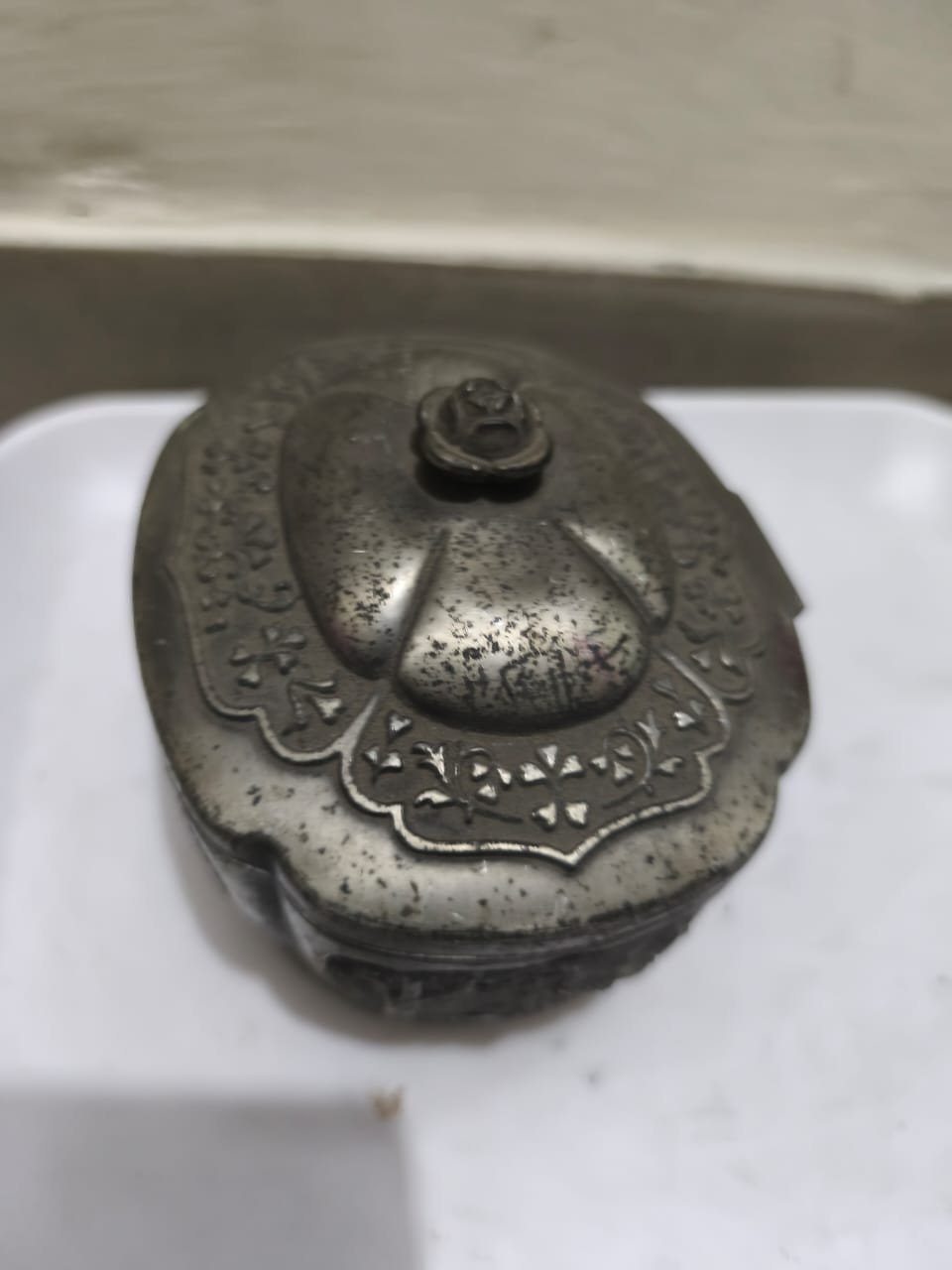 একটি পুরোনো এবং অলংকৃত ধাতব বাক্স। এটি একটি অ্যান্টিক বা ভিনটেজ ট্রিনকেট বক্স বা জুয়েলারি বক্স।
