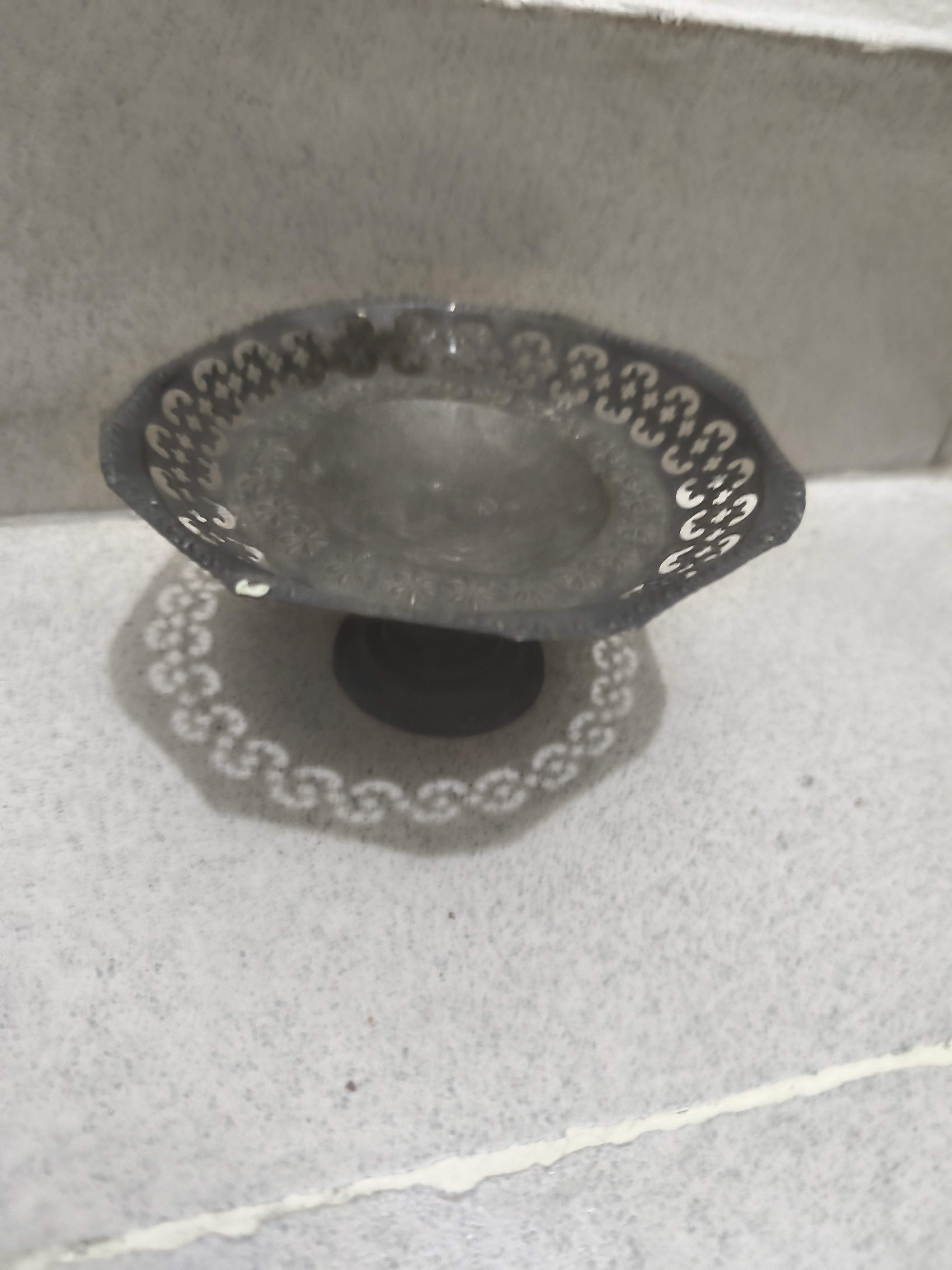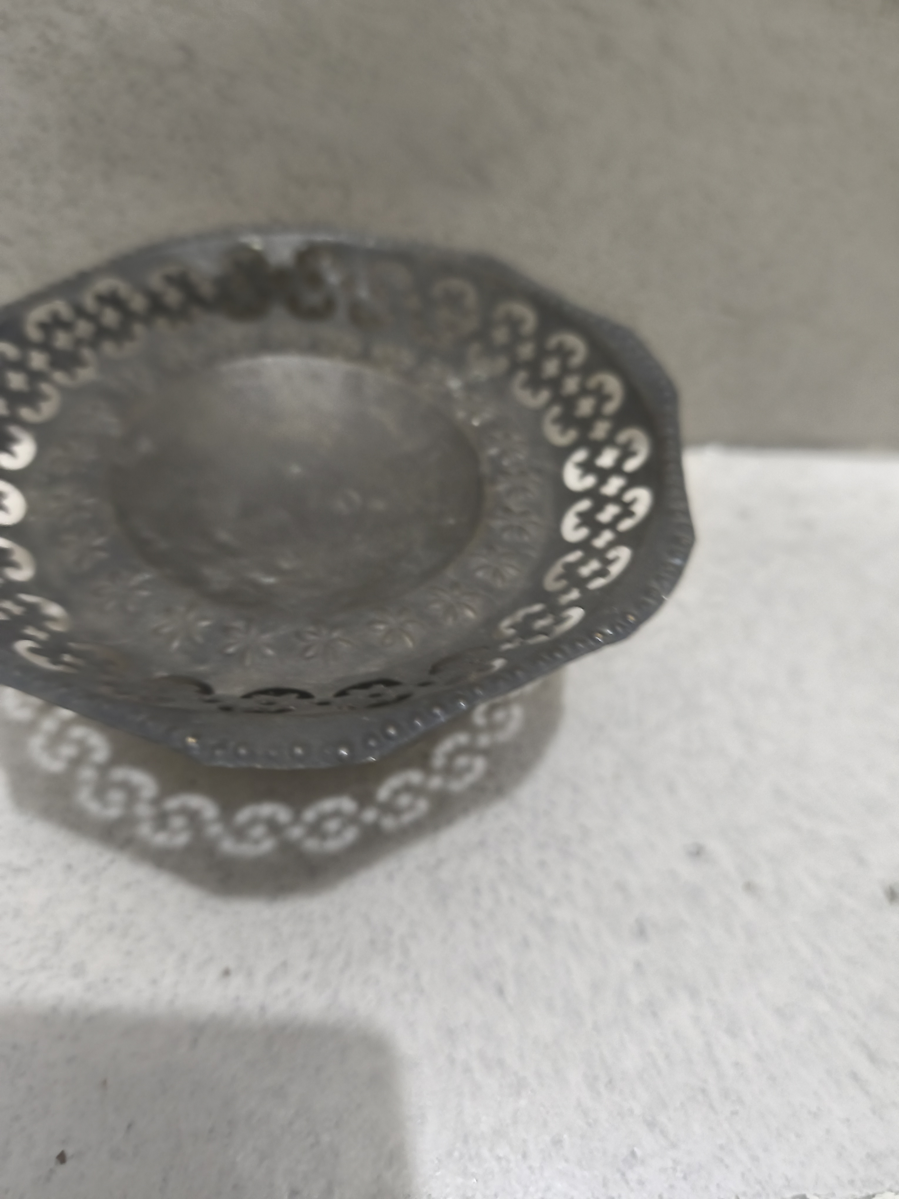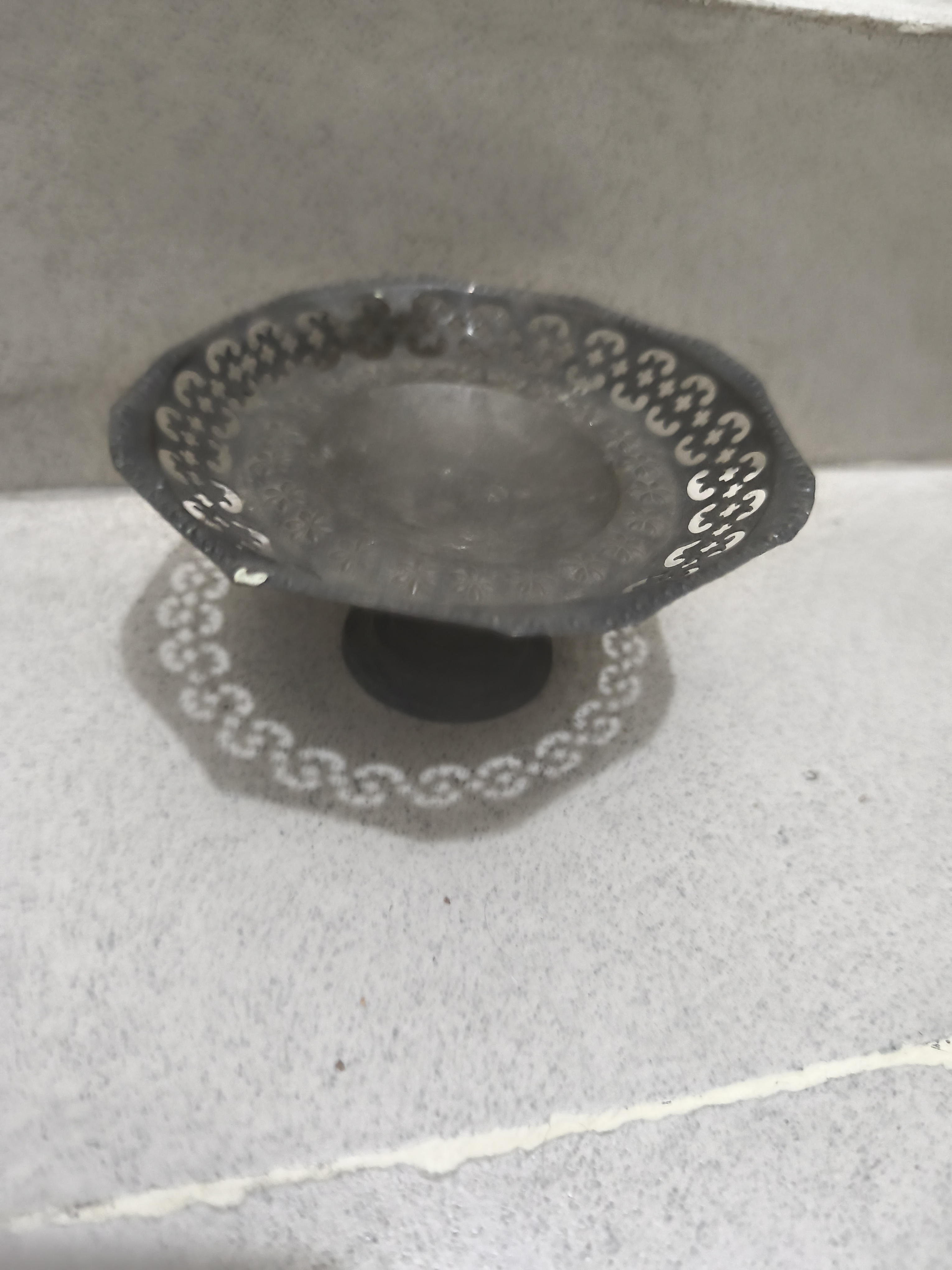 একটি পুরোনো দিনের ধাতব থালা বা ছোট বাটি, যার কিনারাটি কারুকার্যময়, ছিদ্রযুক্ত বা তারের কাজের মতো করে সাজানো। এর নকশা ও জীর্ণতা দেখে মনে হয়, এটি দৈনন্দিন ব্যবহারের চেয়ে বরং একটি আলংকারিক সংগ্রহযোগ্য বস্তু হিসেবেই বেশি ব্যবহৃত হয়।