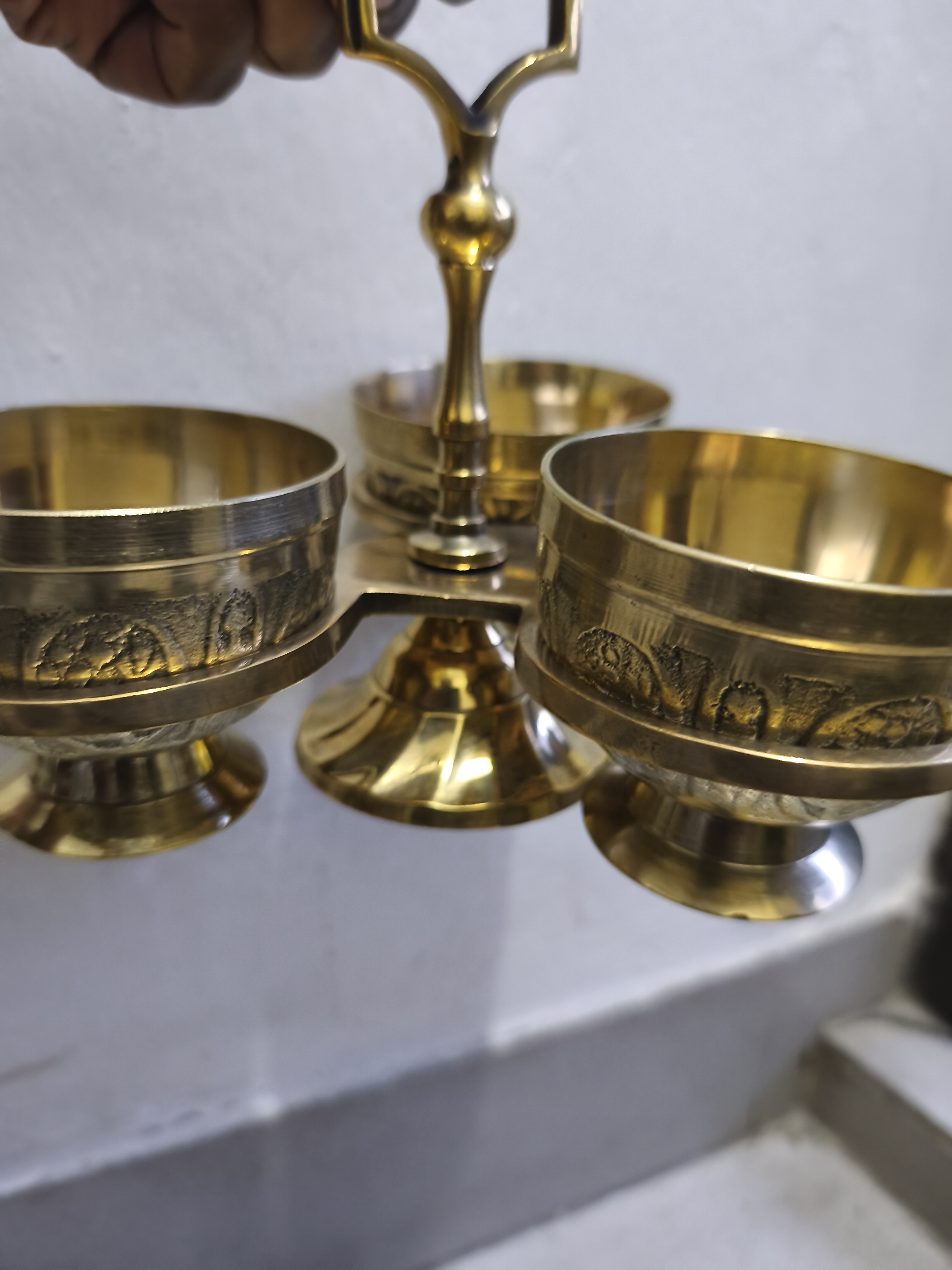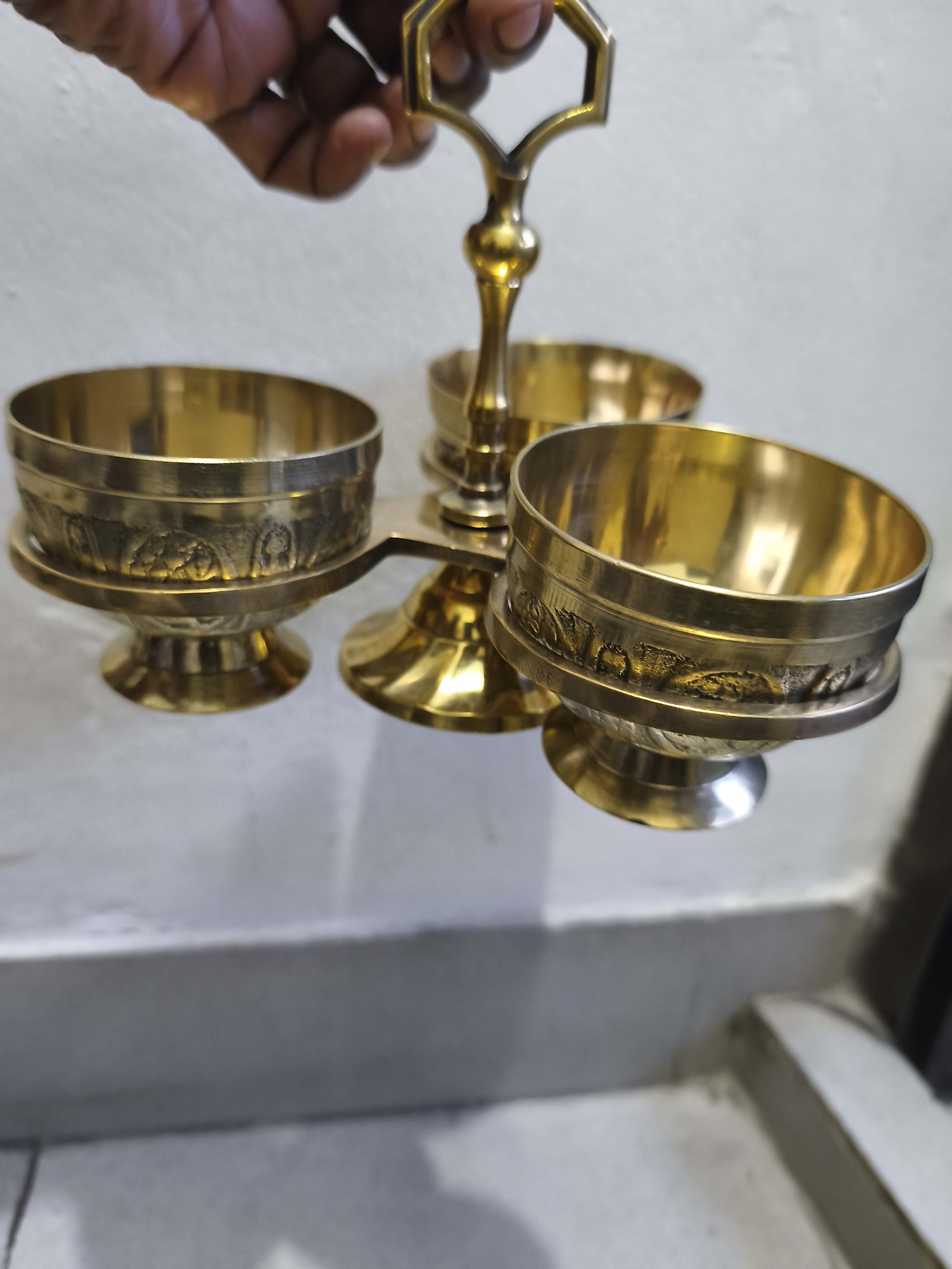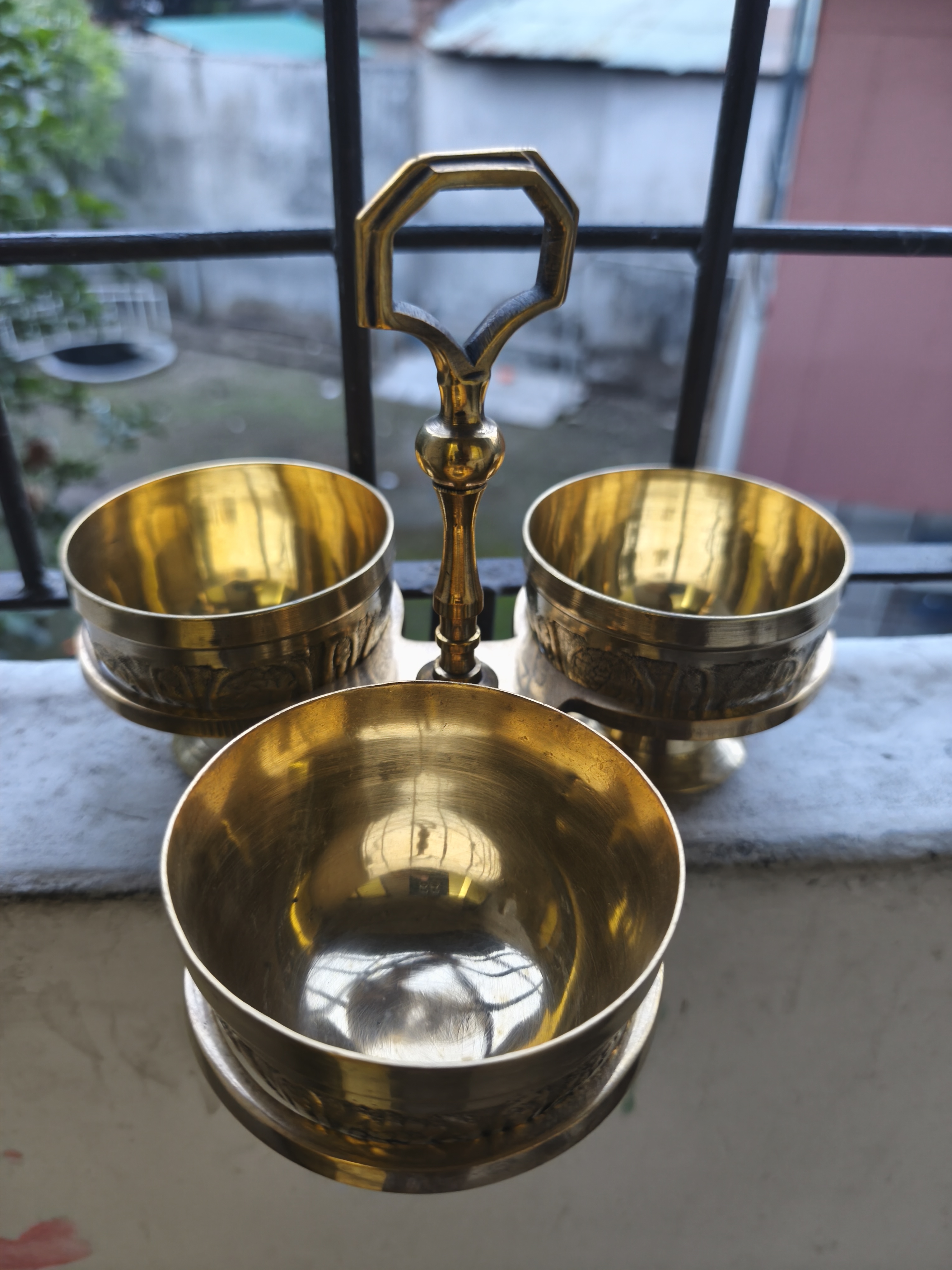 - উপাদান: এটি পিতল দিয়ে তৈরি এবং এর বাটিগুলোতে খোদাই করা আলংকারিক নকশা রয়েছে।