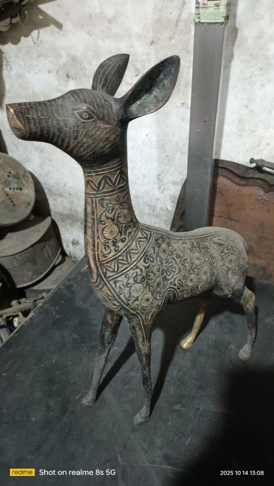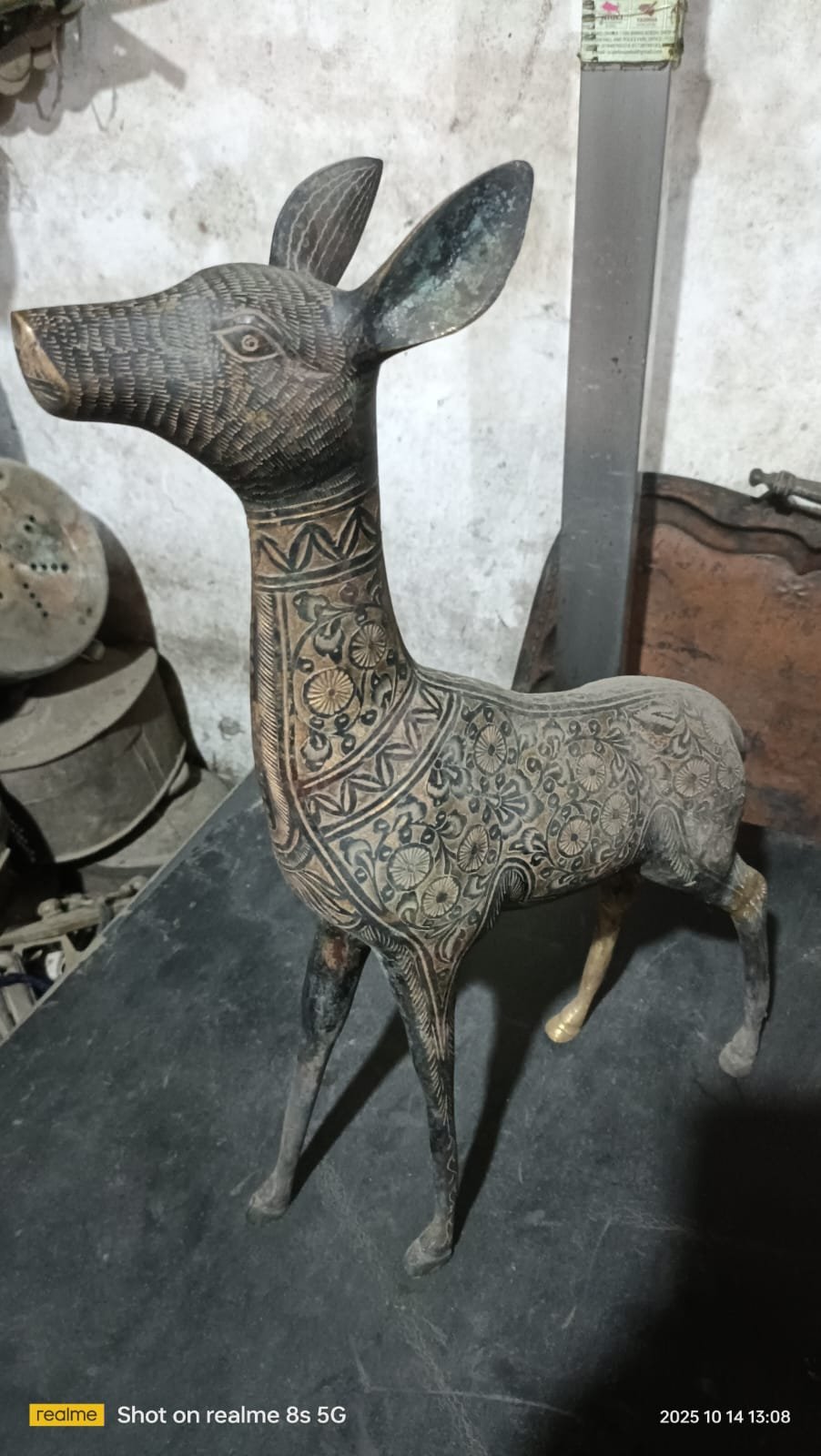 একটি প্রাচীন পিতলের হরিণের মূর্তি দেখানো হয়েছে।