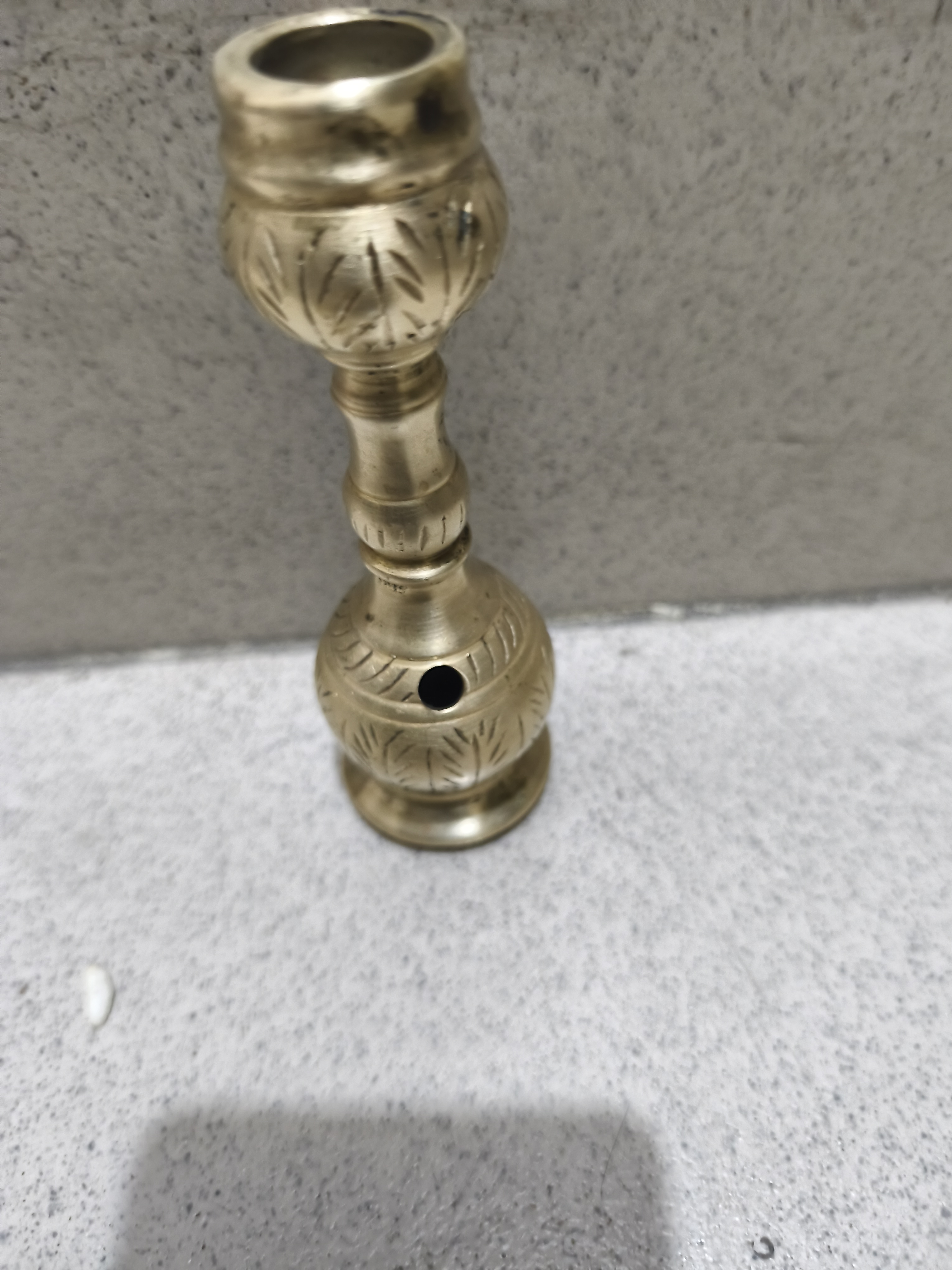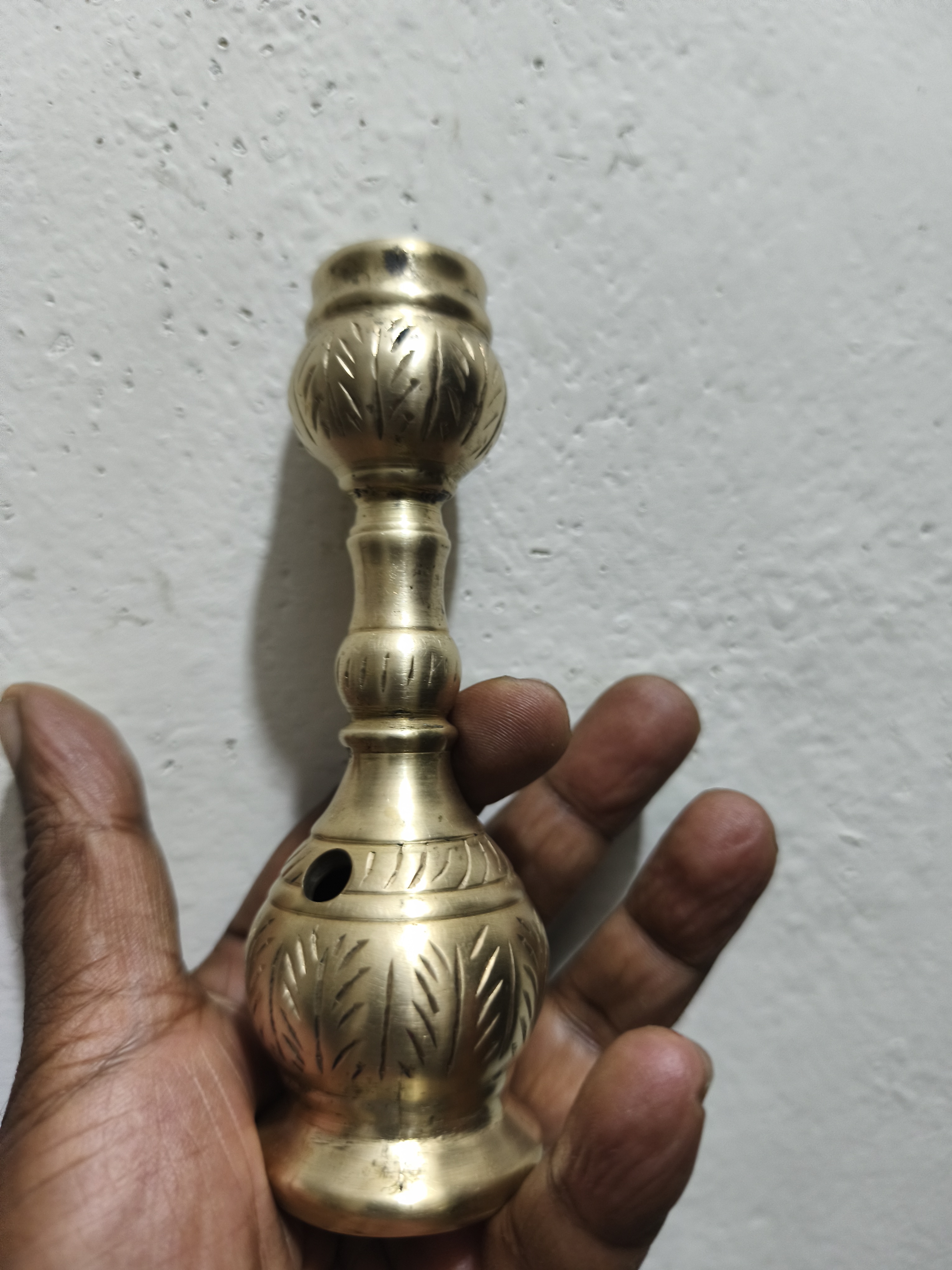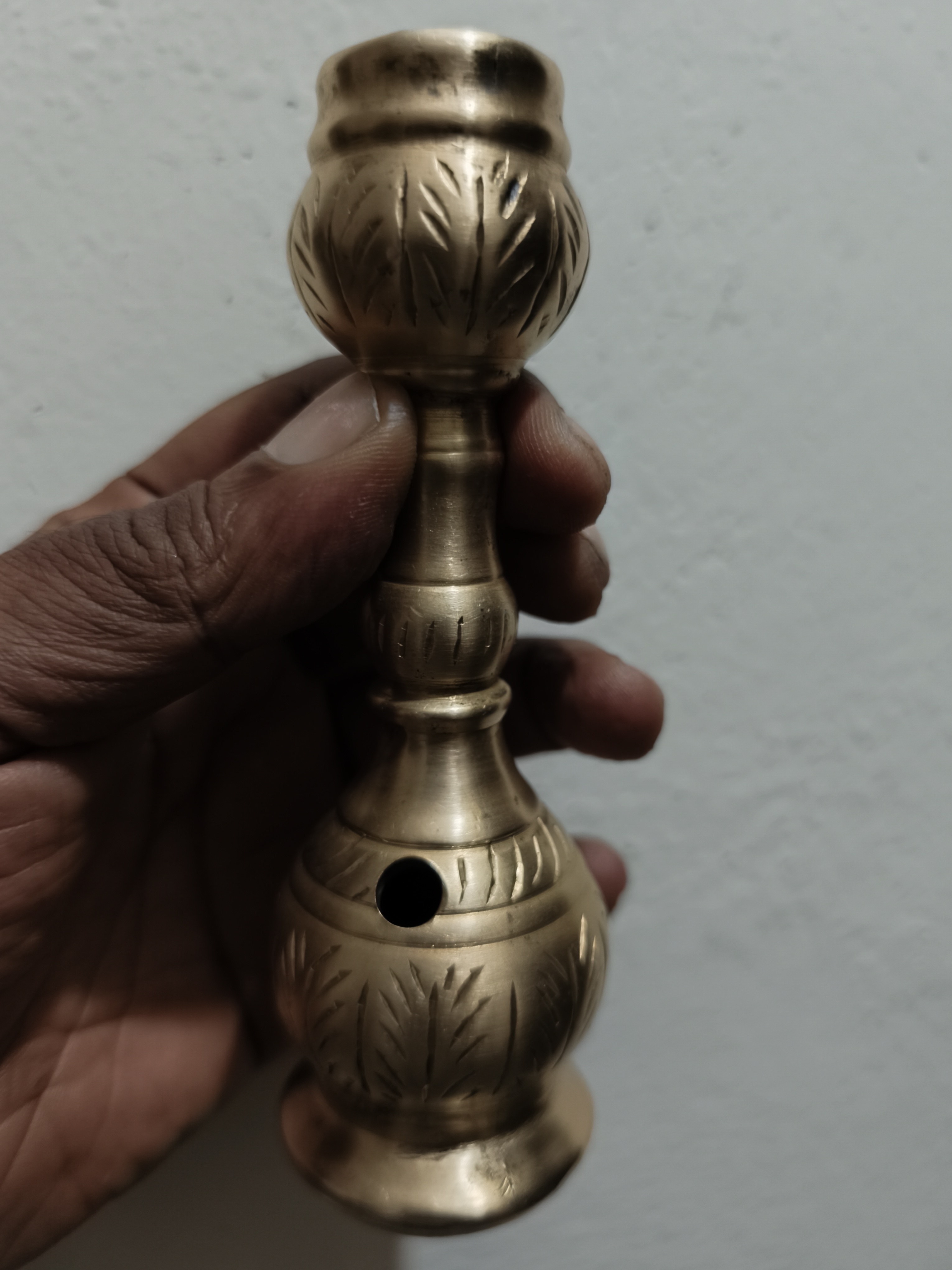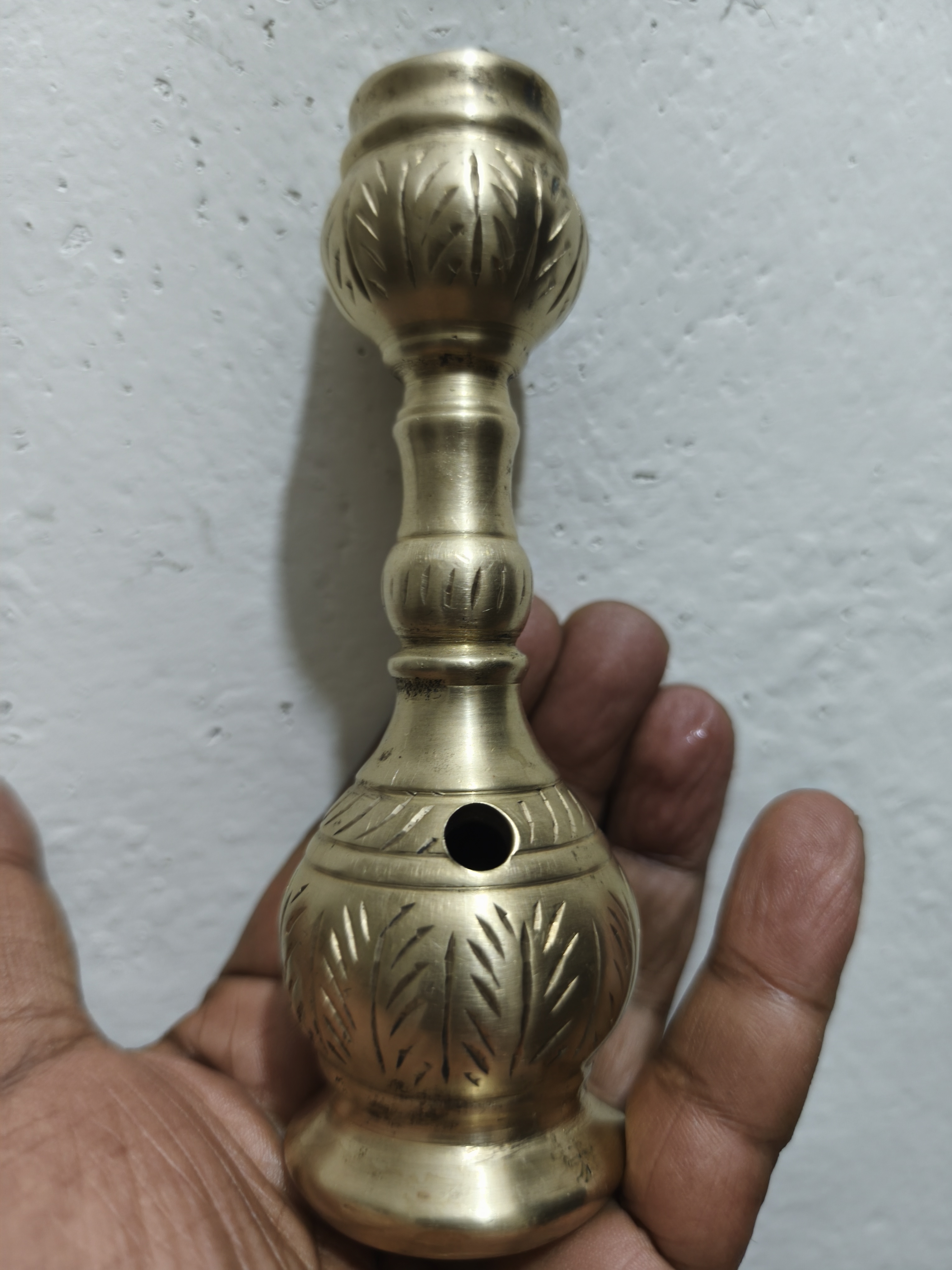 - বর্ণনা: মনে হচ্ছে এই মূর্তিটি ধাতু দিয়ে তৈরি, পিতল দিয়ে তৈরি, এবং এর বডি এবং বাটিতে জটিল খোদাই বা রিপুসে কাজ রয়েছে। এর উপরে একটি ছোট, আলংকারিক বাটি এবং একটি কাণ্ড রয়েছে যা একটি পাইপের সাথে সংযুক্ত।