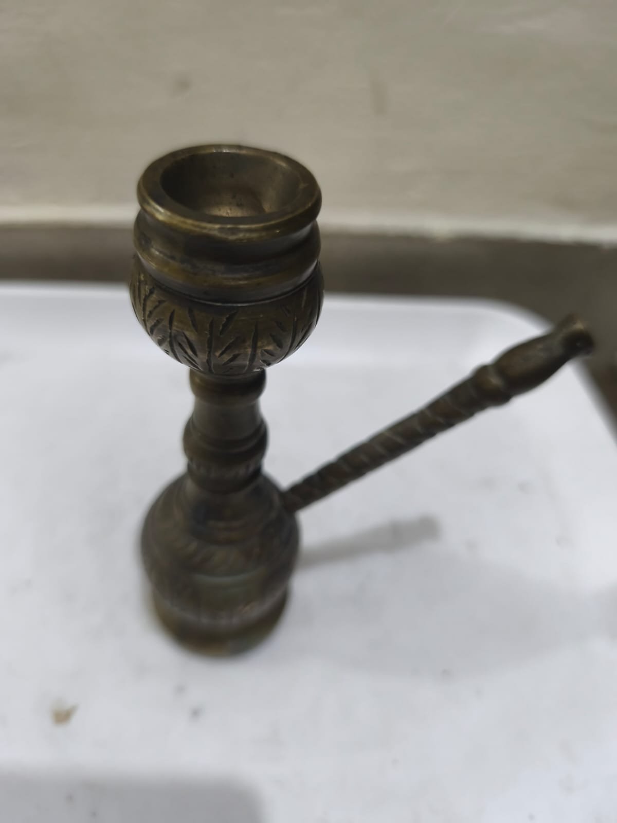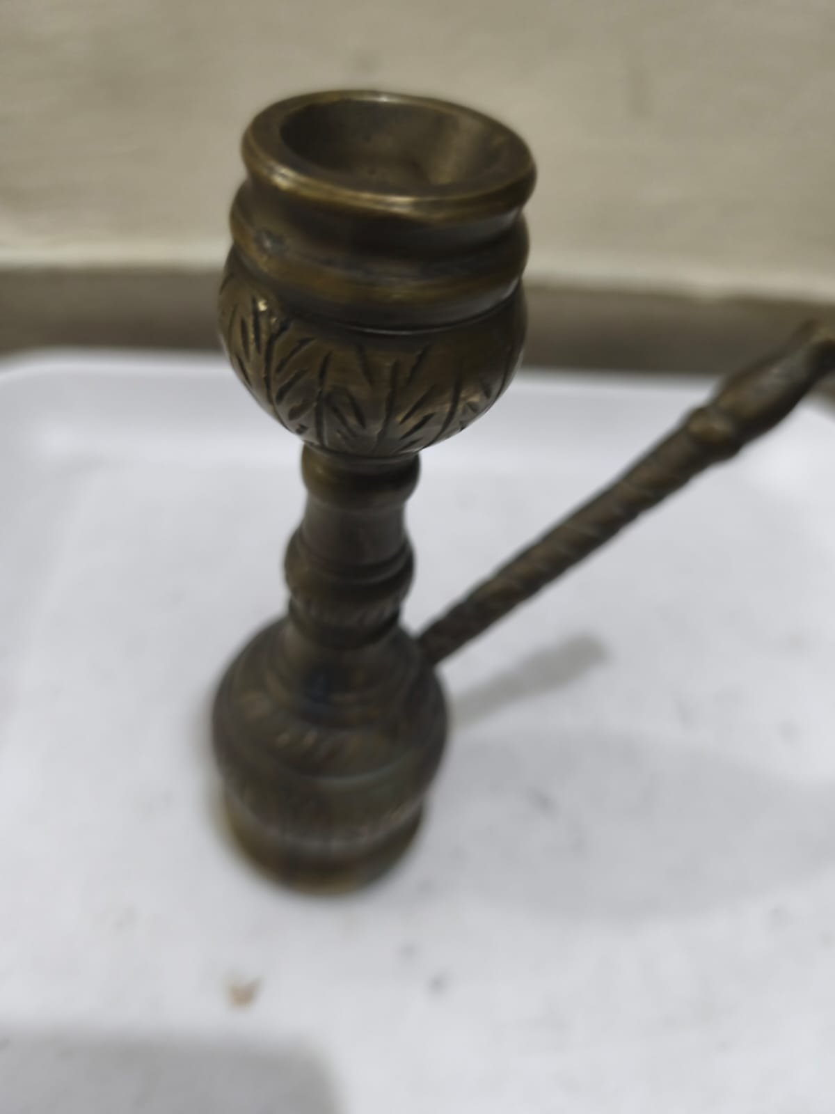 - বর্ণনা: মনে হচ্ছে এই মূর্তিটি ধাতু দিয়ে তৈরি, পিতল দিয়ে তৈরি, এবং এর বডি এবং বাটিতে জটিল খোদাই বা রিপুসে কাজ রয়েছে। এর উপরে একটি ছোট, আলংকারিক বাটি এবং একটি কাণ্ড রয়েছে যা একটি পাইপের সাথে সংযুক্ত।