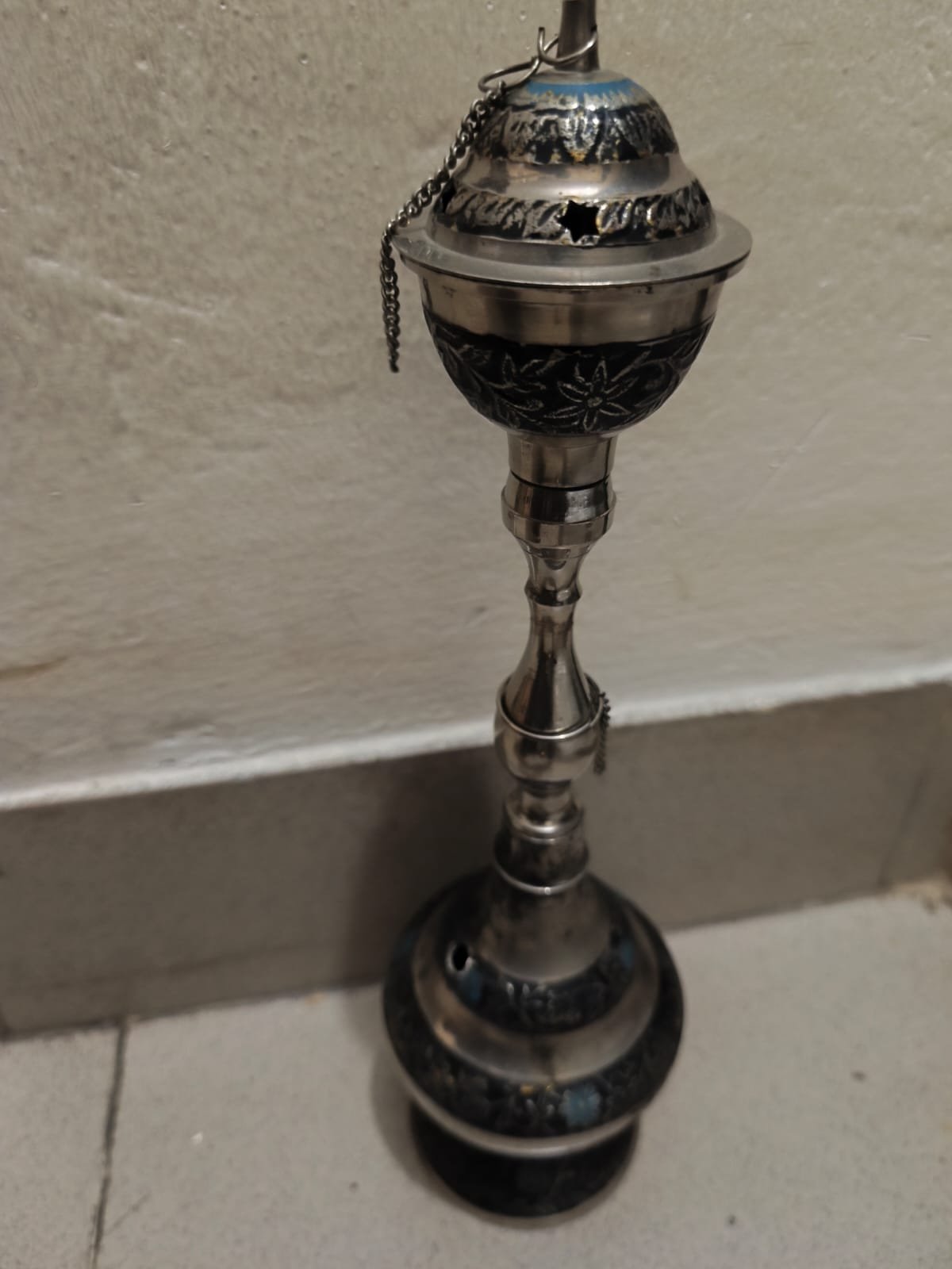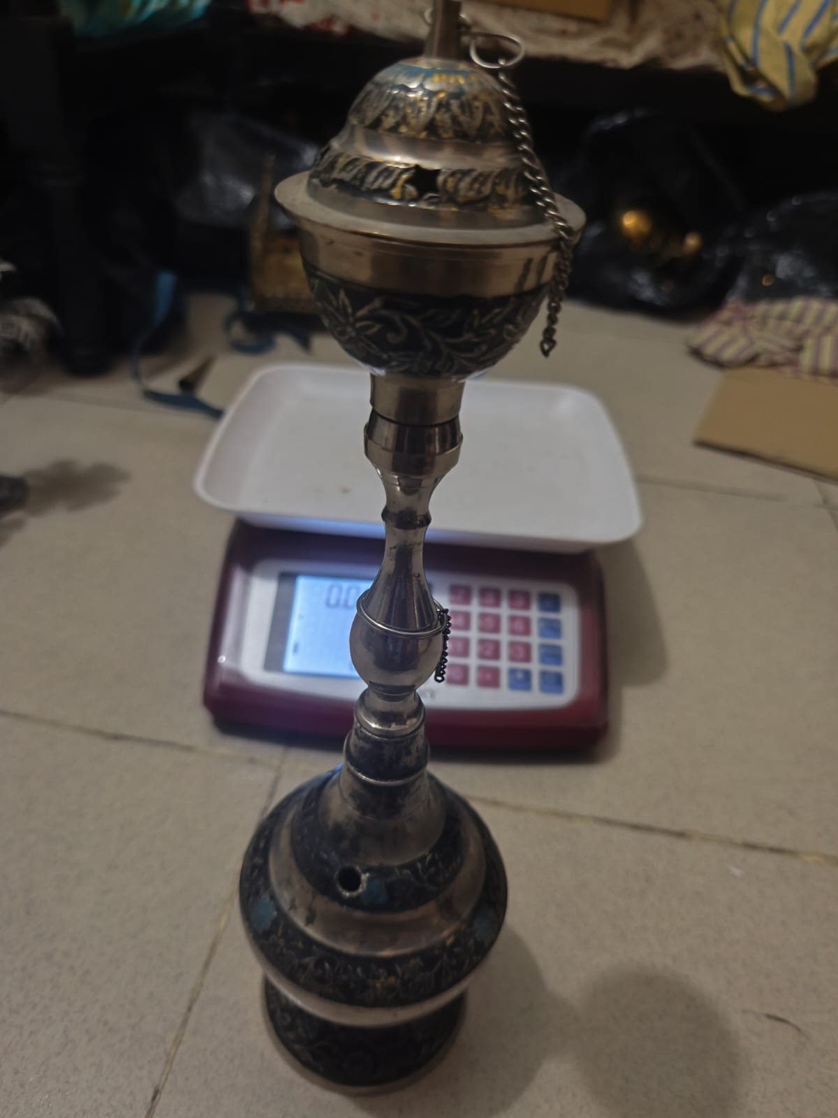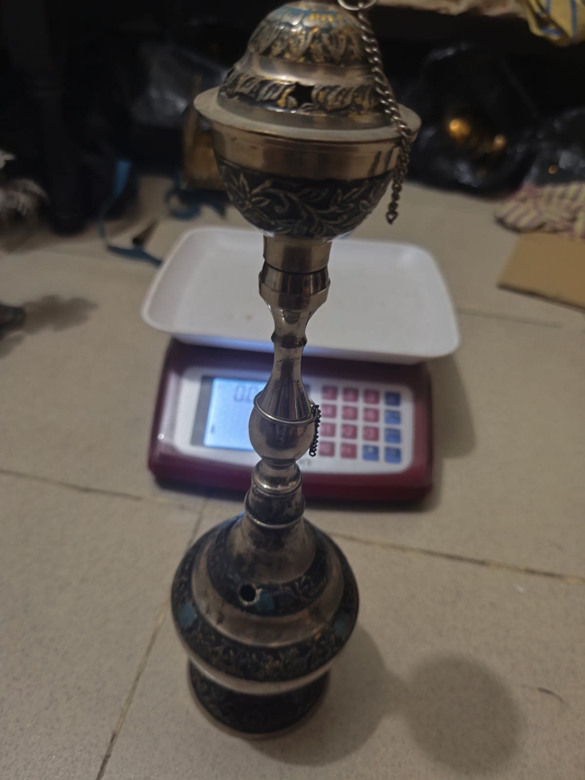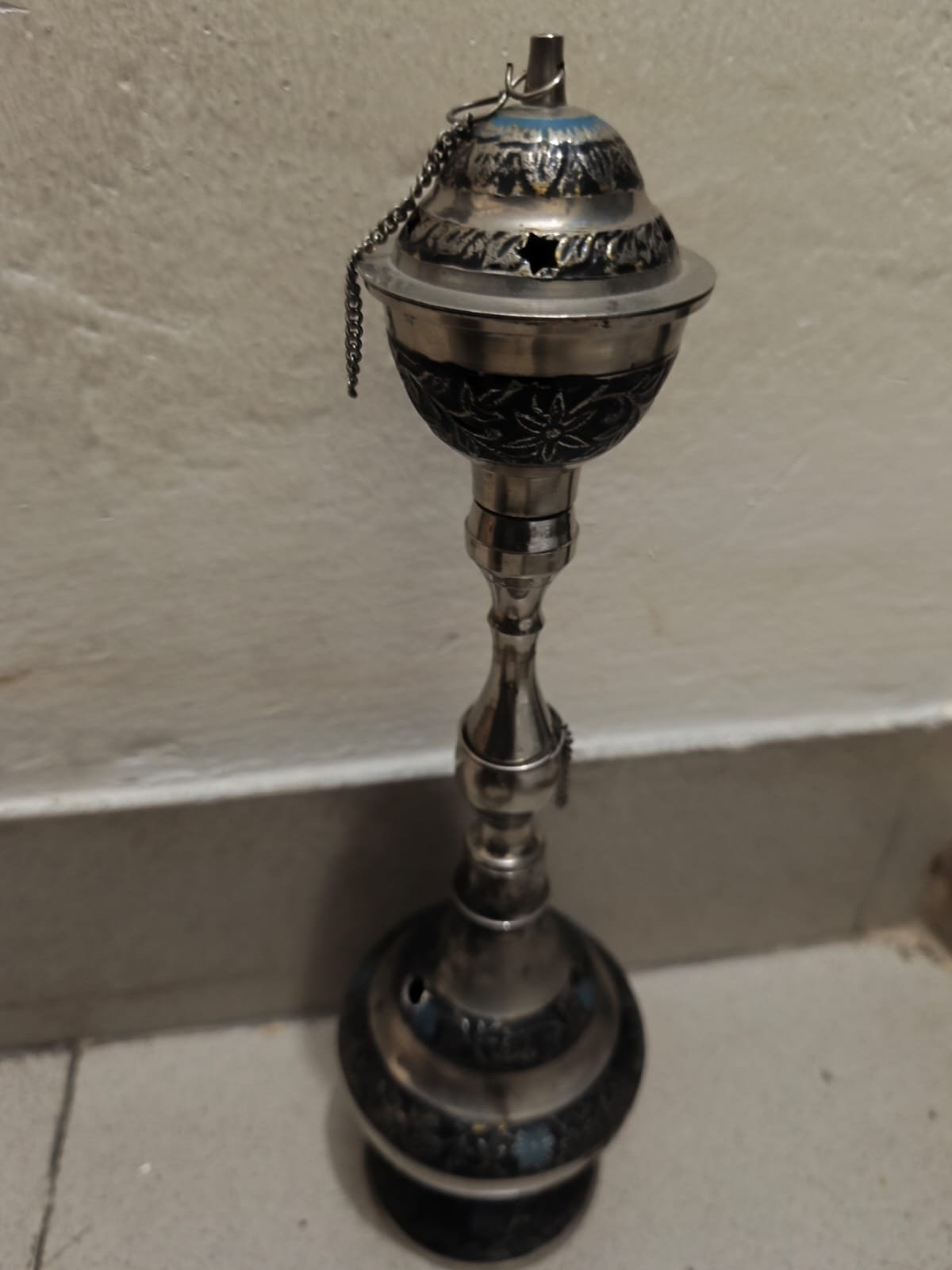 - বর্ণনা: মনে হচ্ছে এই মূর্তিটি ধাতু দিয়ে তৈরি, পিতল দিয়ে তৈরি, এবং এর বডি এবং বাটিতে জটিল খোদাই বা রিপুসে কাজ রয়েছে। এর উপরে একটি ছোট, আলংকারিক বাটি এবং একটি কাণ্ড রয়েছে যা একটি পাইপের সাথে সংযুক্ত।