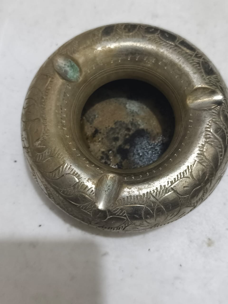 একটি ভিনটেজ বা অ্যান্টিক পিতলের অ্যাশট্রে দেখানো হয়েছে যার উপর খোদাই করা ফুল বা পাতার নকশা রয়েছে।