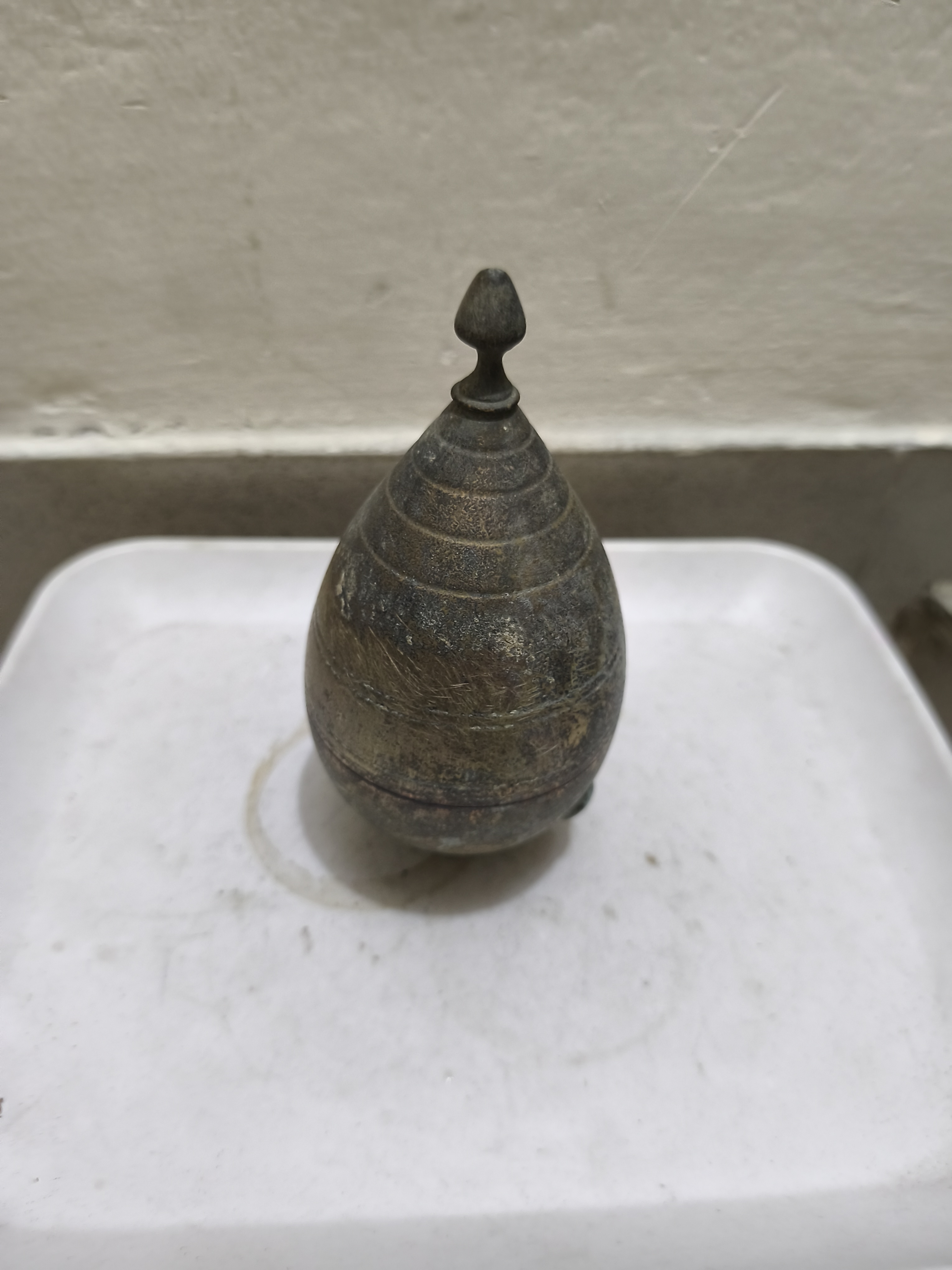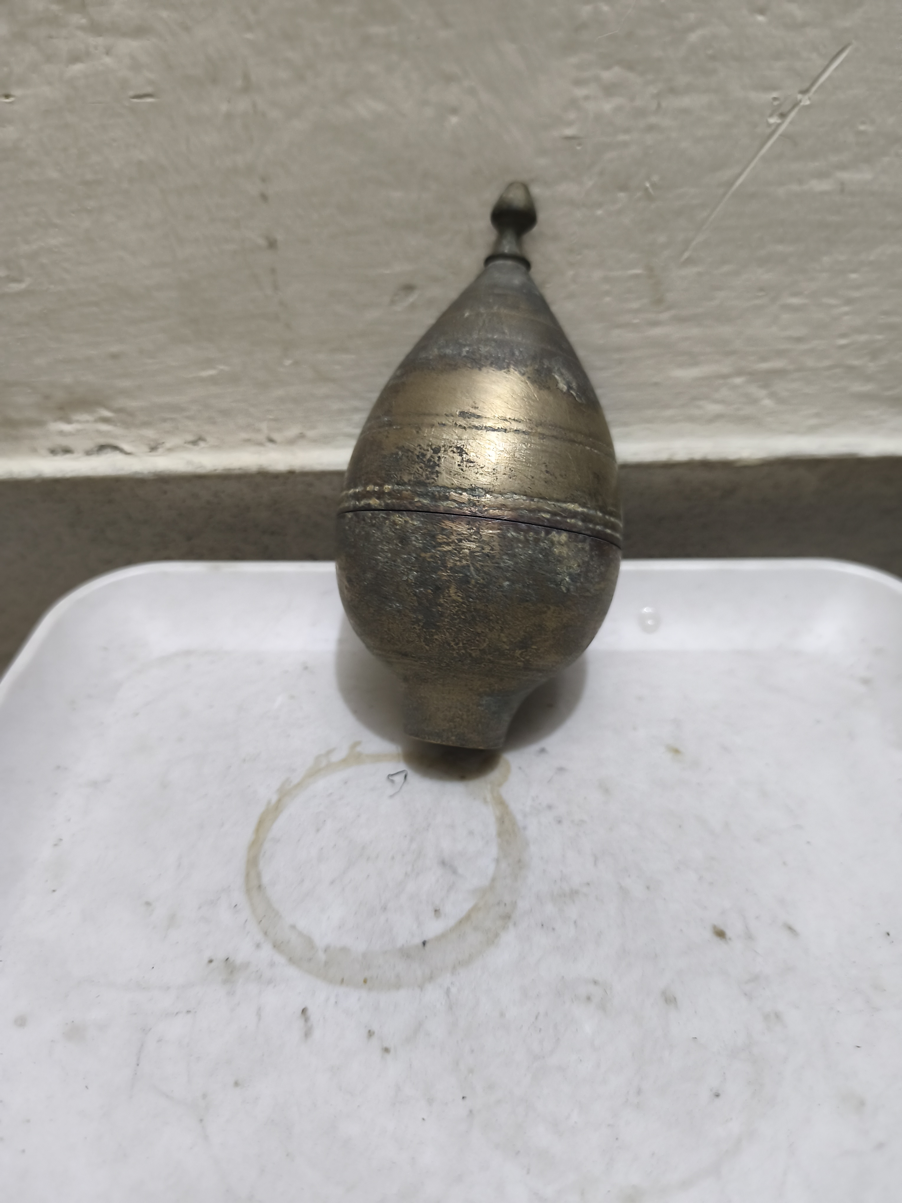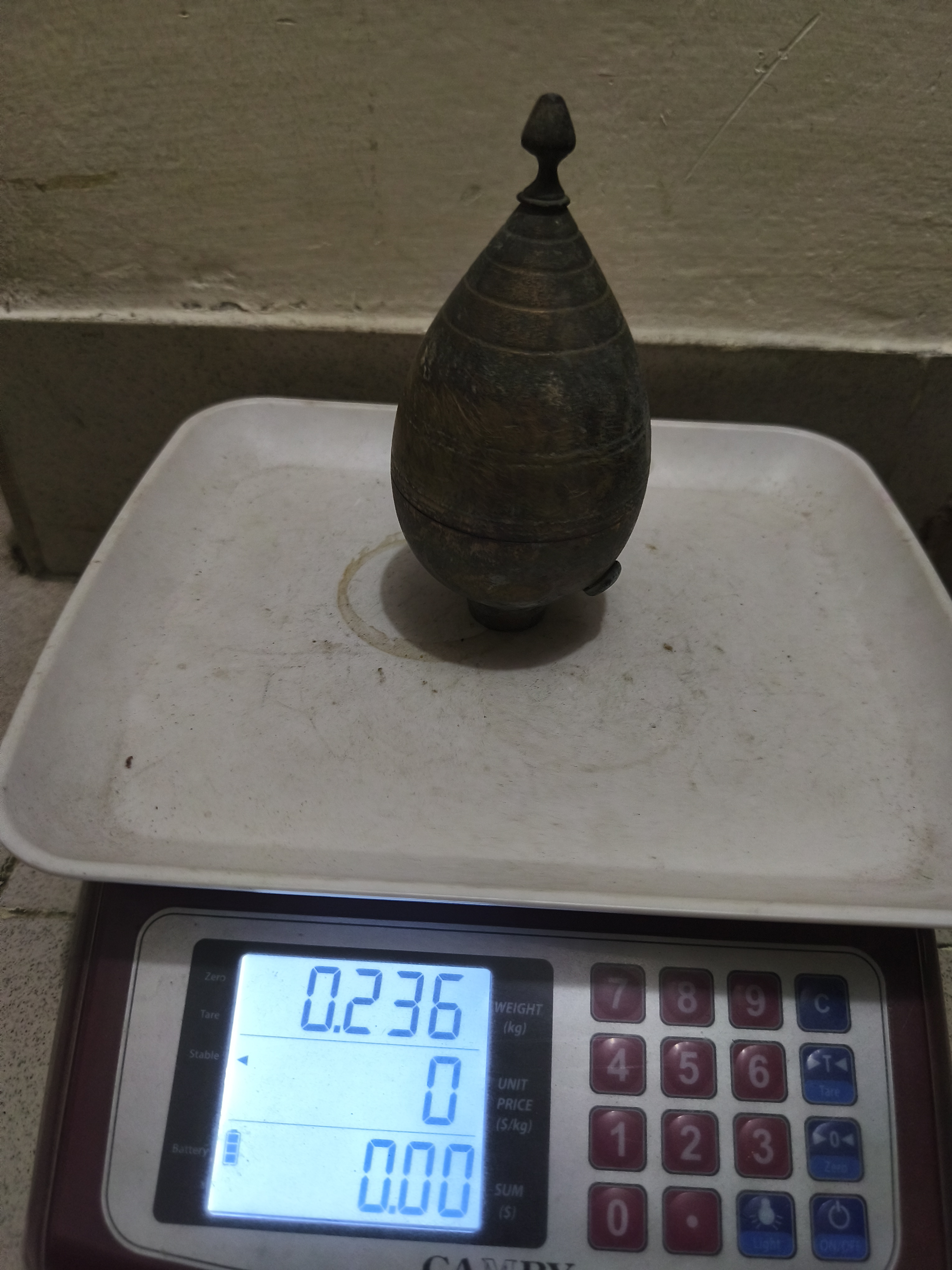 - উপাদান: এটি পিতল দিয়ে তৈরি এবং এর বয়স নির্দেশ করে একটি সমৃদ্ধ প্যাটিনা রয়েছে।