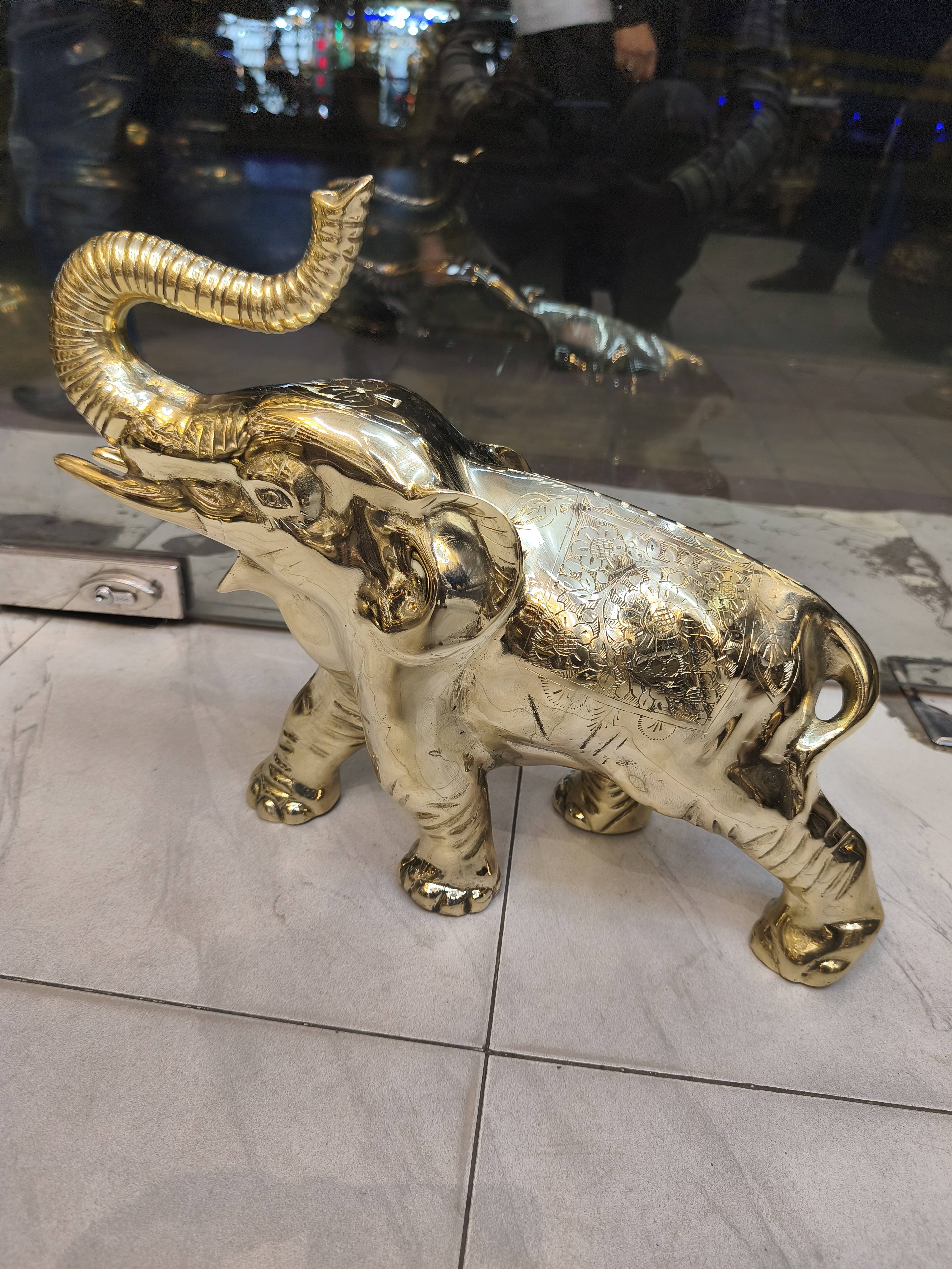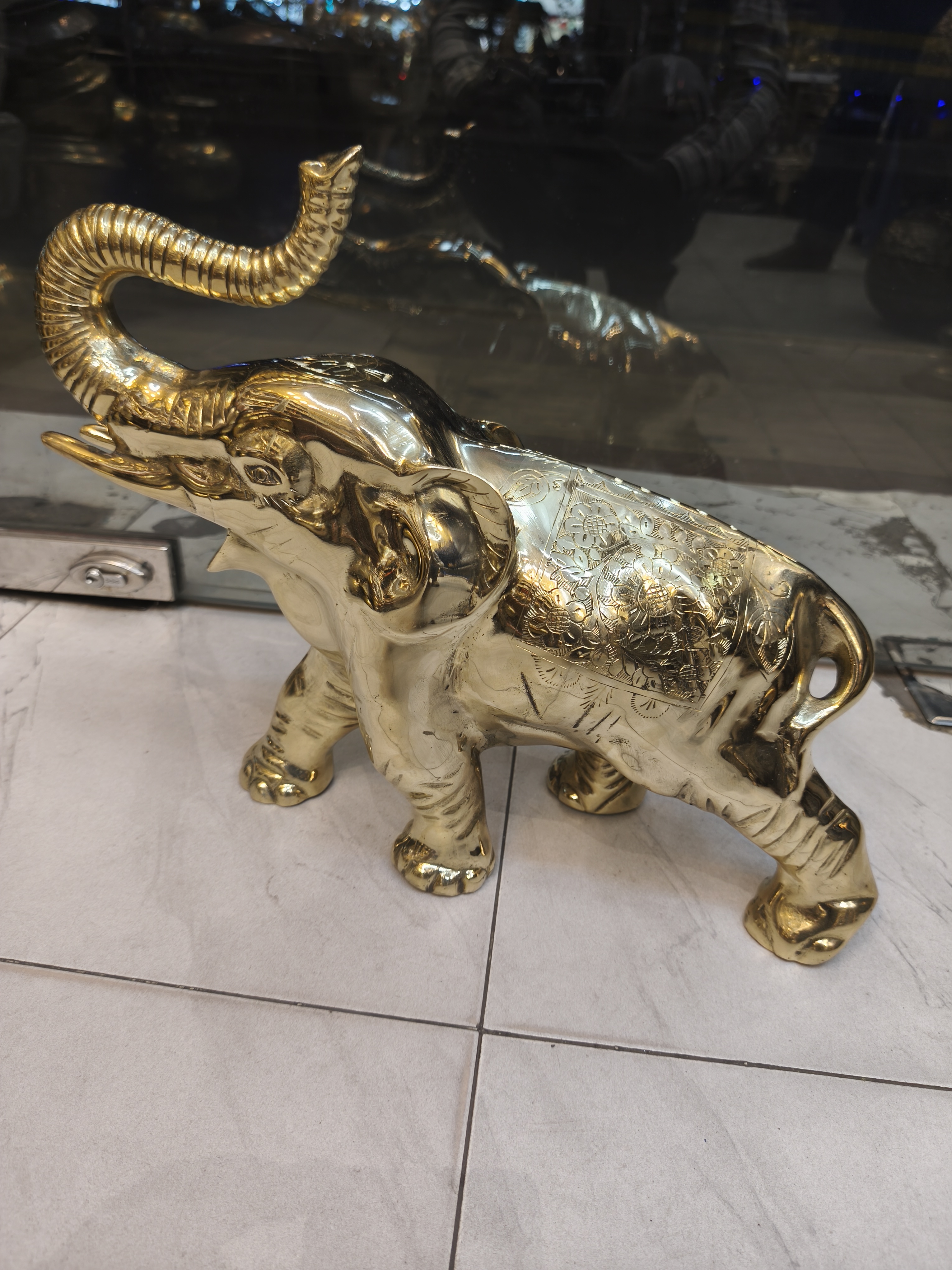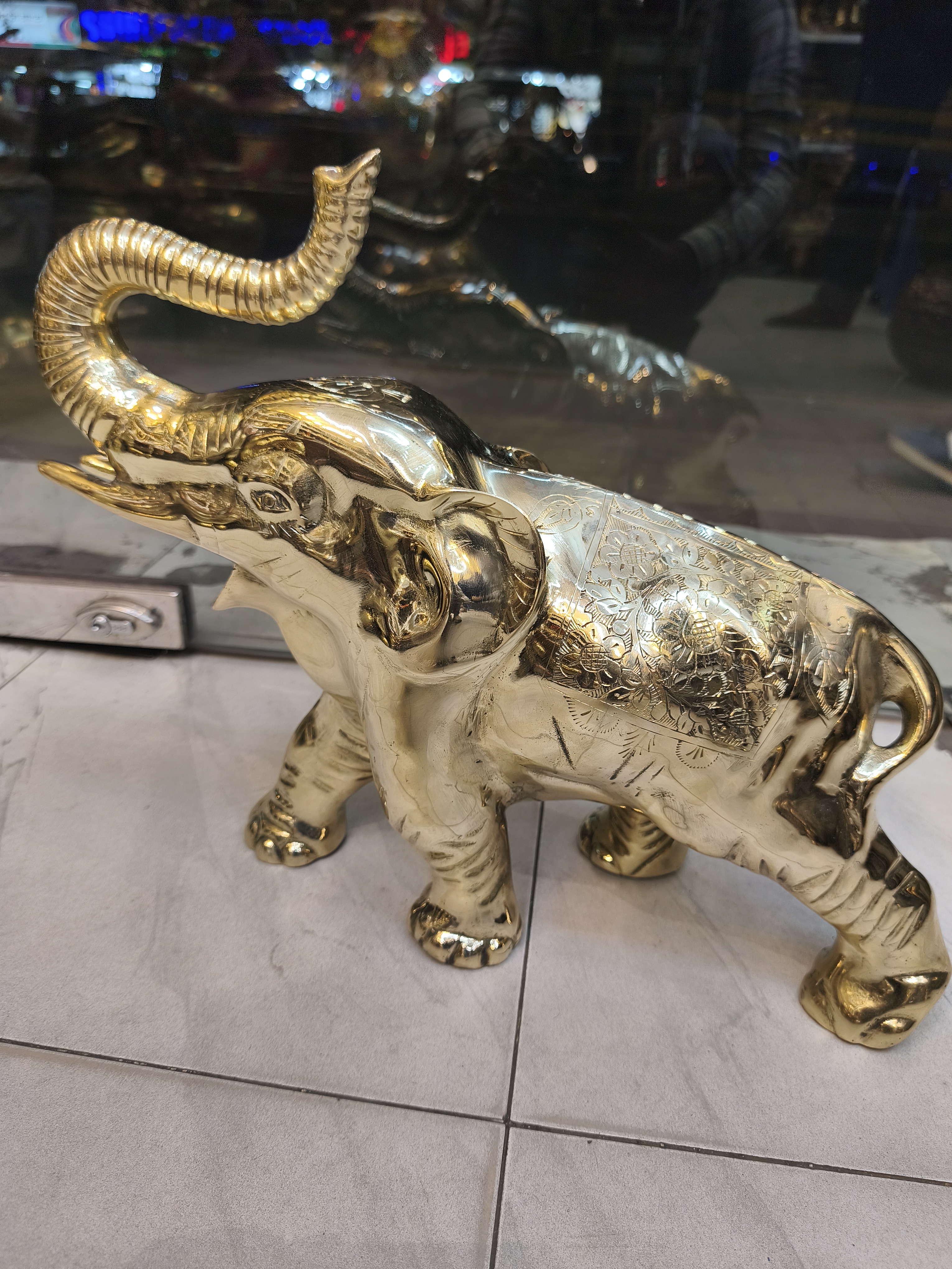 এটি একটি মনোমুগ্ধকর পিতলের তৈরি হাতির মূর্তি—শক্তি, সৌভাগ্য ও সমৃদ্ধির প্রতীক। সোনালি ঝিলমিলে গায়ে সূক্ষ্ম নকশা খোদাই করা, যা এর কারুশিল্পের নিখুঁত সৌন্দর্যকে আরও উজ্জ্বল করে তুলেছে। উঁচু করে তোলা শুঁড়টি যেন আনন্দ ও বিজয়ের বার্তা বহন করছে, আর দৃঢ় ভঙ্গিতে দাঁড়িয়ে থাকা চারটি পা প্রকাশ করে স্থিরতা ও আত্মবিশ্বাস।