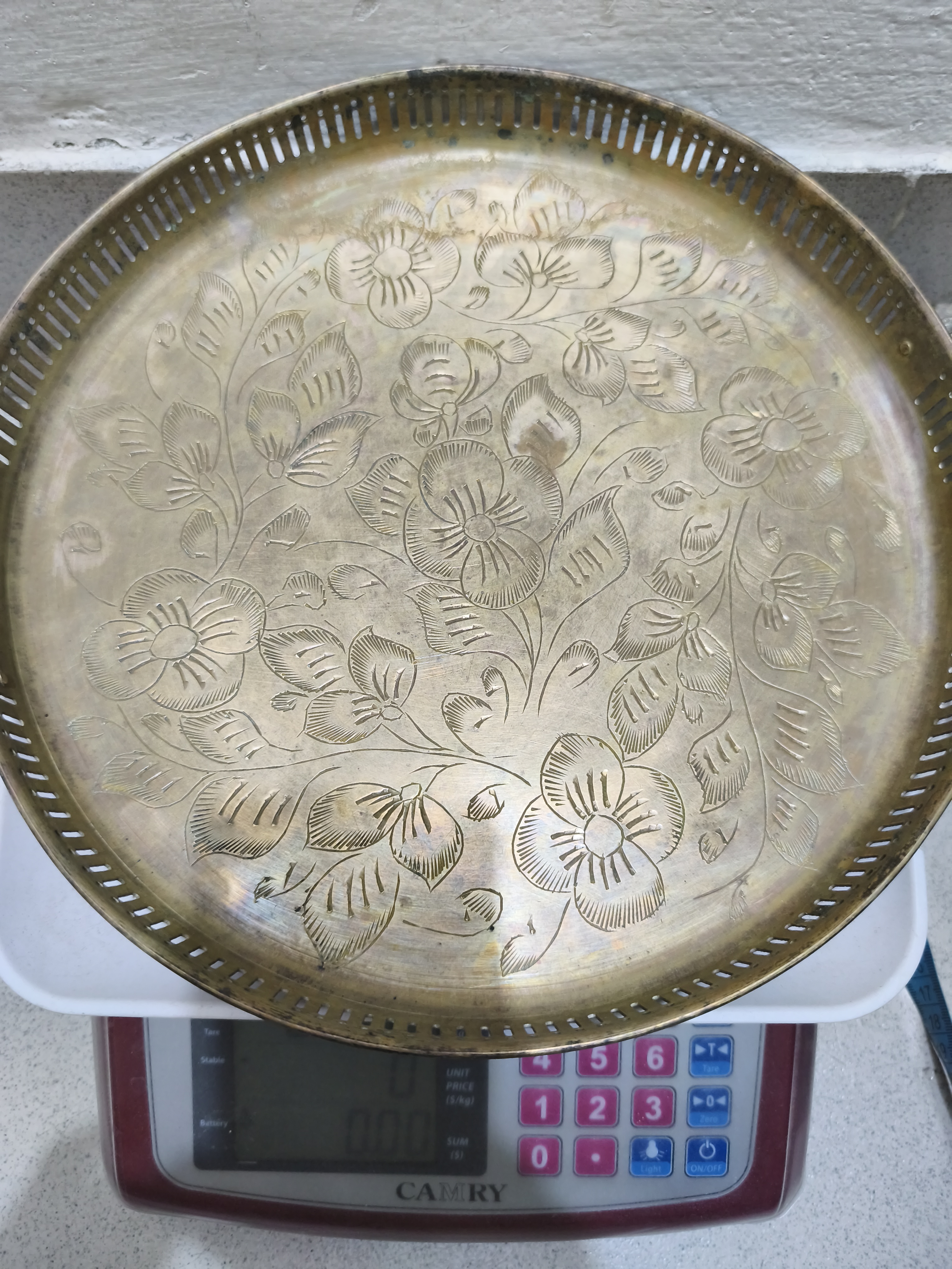 একটি সংগ্রহযোগ্য ভিনটেজ পিতলের পরিবেশন ট্রে বা আলংকারিক প্লেট যাতে জটিল হাতে খোদাই করা ফুলের নকশা এবং একটি ছিদ্রযুক্ত প্রান্ত নকশা রয়েছে।