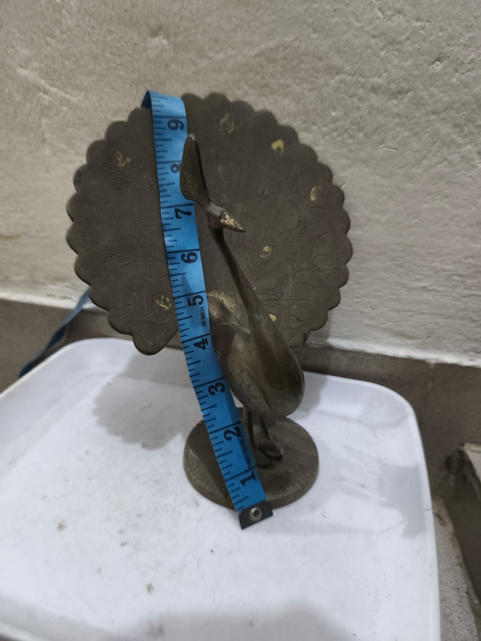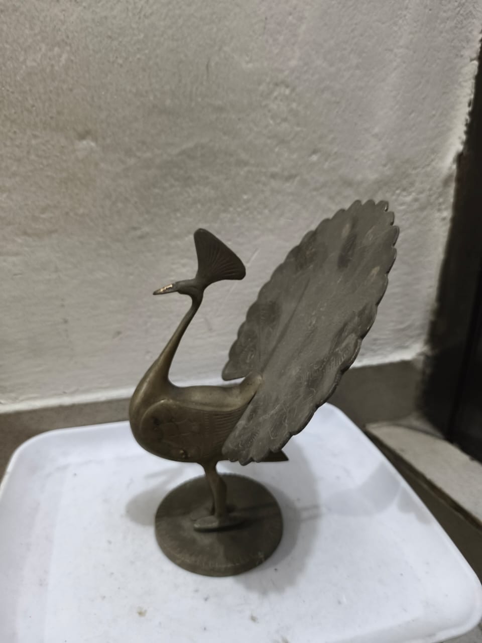 এটি একটি পিতলতৈরি ময়ূরের মূর্তি।