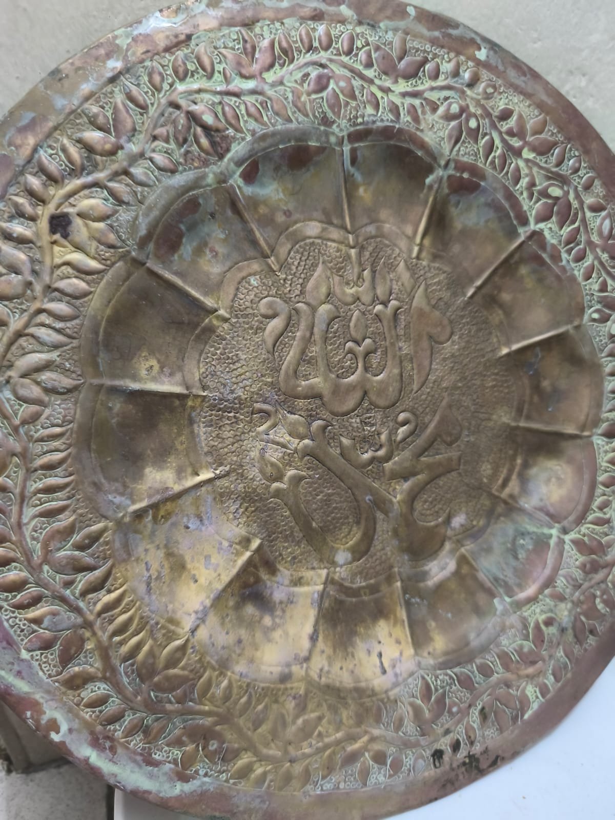 এই প্লেটটির মাঝখানে খোদাই করা আছে “আল্লাহ” (الله) শব্দটি আরবি ক্যালিগ্রাফিতে, এবং তার চারপাশে রয়েছে ফুল ও লতাপাতার নকশা— যা ইসলামিক অলংকরণের খুবই প্রচলিত মোটিফ। চারপাশের পাতার ও ফুলের নকশা ঘূর্ণায়মানভাবে সাজানো, যা মধ্যপ্রাচ্য ও দক্ষিণ এশিয়ার ইসলামিক শিল্পশৈলীর প্রভাব বোঝায়।