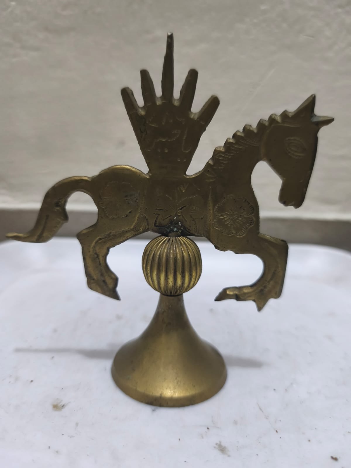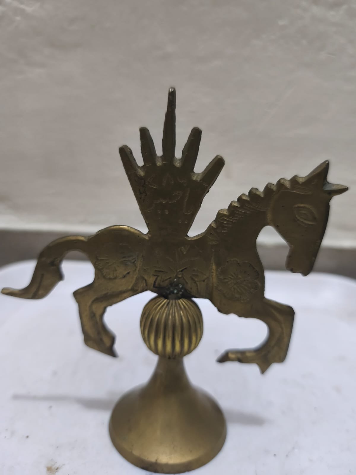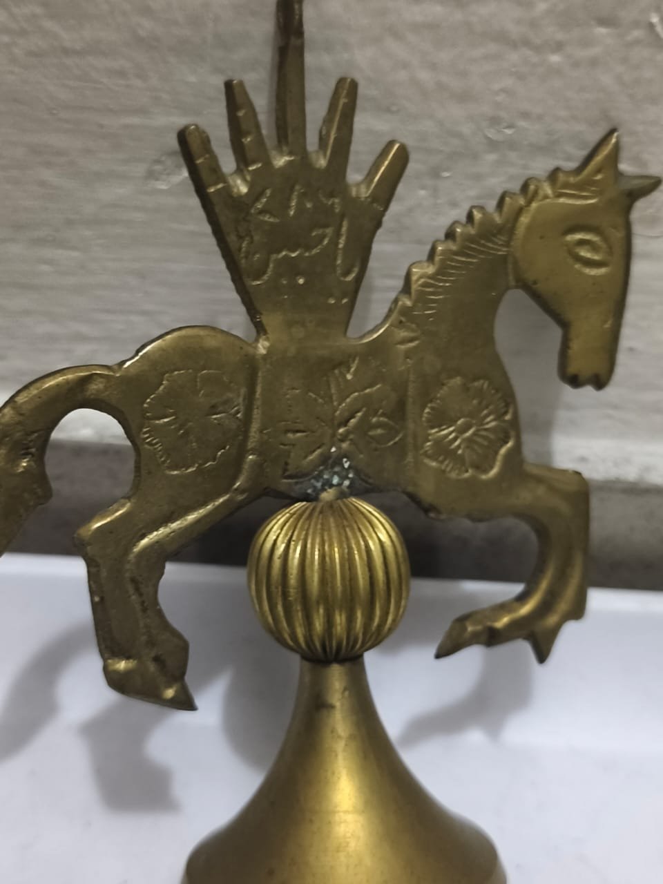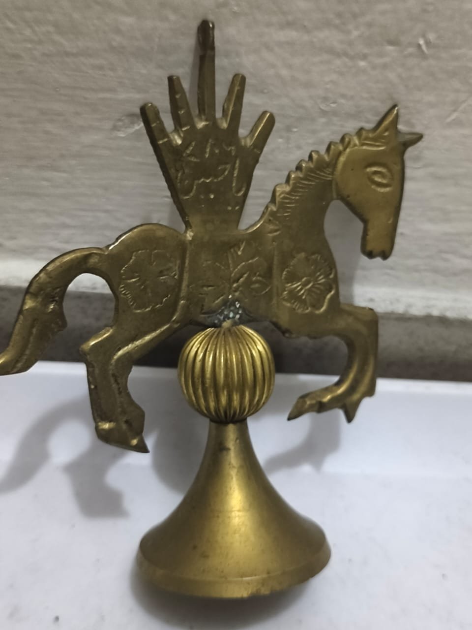 কটা পিতলের তৈরি ছোট শোপিস বা ধর্মীয় প্রতীক বলে মনে হচ্ছে। ঘোড়া আর তার ওপরে একটি হাতের চিহ্ন আছে। দক্ষিণ এশীয় সংস্কৃতিতে—বিশেষ করে শিয়া মুসলিম সম্প্রদায়ে—এই ধরনের নকশা অনেক সময় ধর্মীয় প্রতীকের অংশ হিসেবে ব্যবহৃত হয়। হাতের প্রতীকটিকে অনেকে পাঞ্জা বা আলম বলে থাকে।ছবির বস্তুটি সম্ভবত একটি পিতলের "আলম" (Alam) বা পাঞ্জা–যা শিয়া মুসলিম সম্প্রদায়ে ধর্মীয় প্রতীক হিসেবে ব্যবহৃত হয়।