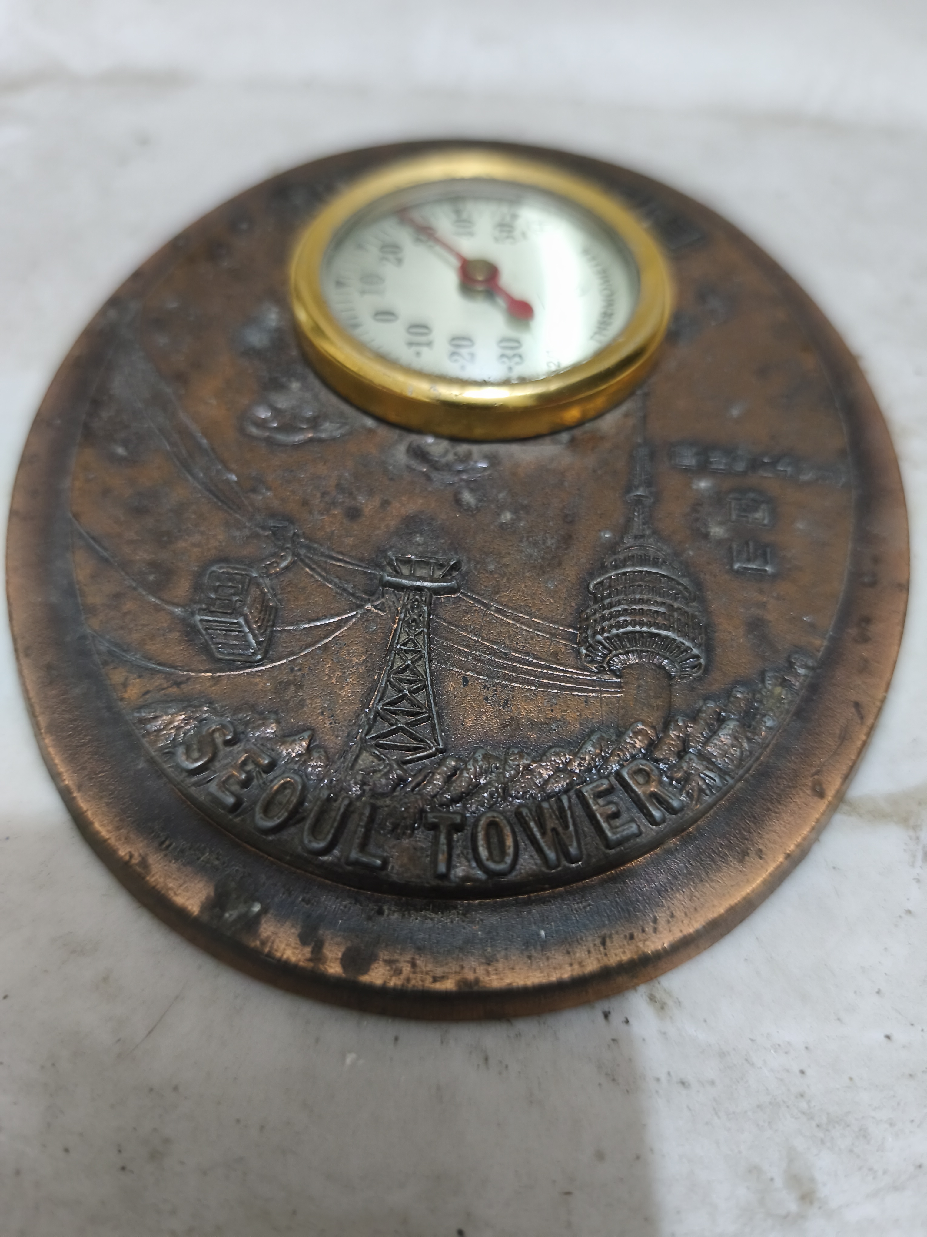- বিবরণ: থার্মোমিটারটি একটি গোলাকার তামাটে মেটাল প্লেটের ওপর বসানো। এর ওপর সিউল টাওয়ারের ছবি এবং কোরিয়ান ভাষায় '서울타워관광기념' (সিউল টাওয়ার ভ্রমণ স্মারক) খোদাই করা আছে।