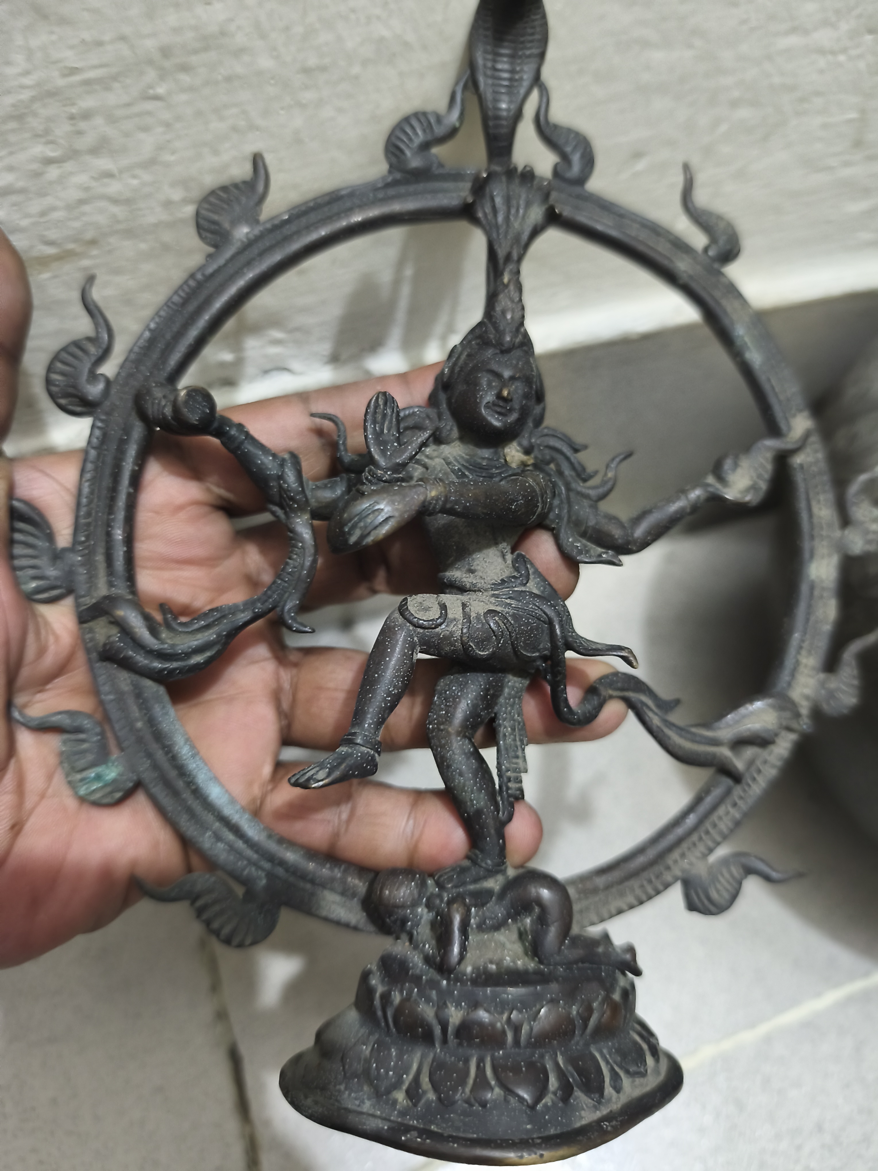 - আকৃতি: ঐতিহ্যগতভাবে এই মূর্তিতে শিবকে চতুর্ভুজাকৃতিতে দেখানো হয়, যার উপরের ডান হাতে একটি ছোট ঢোল (ডমরু) এবং উপরের বাম হাতে একটি অগ্নিশিখা থাকে।