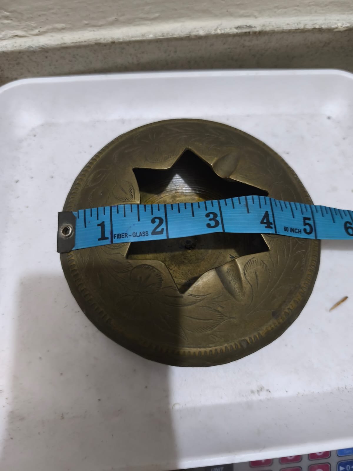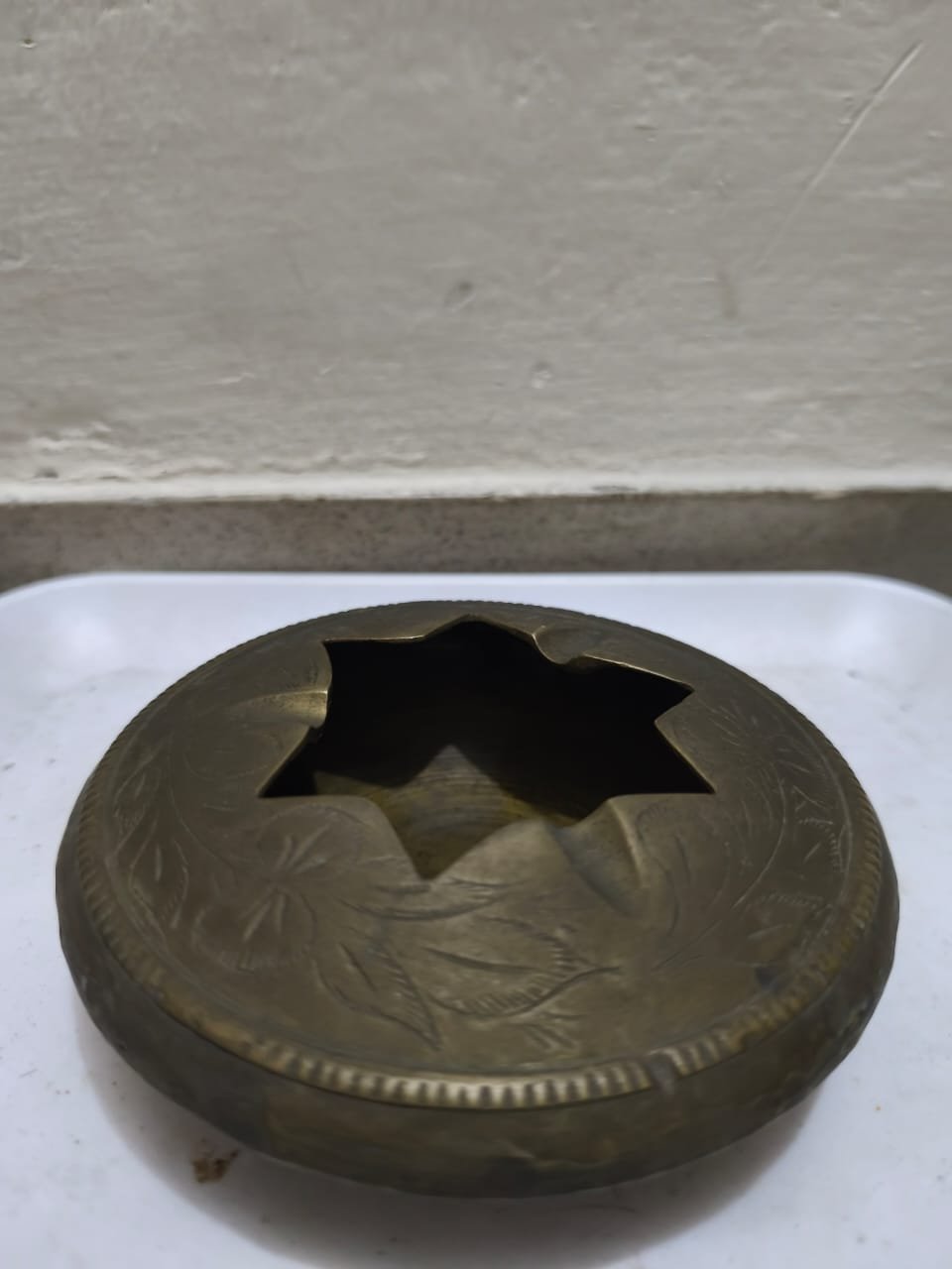 ছবিতে যে বস্তুটি দেখা যাচ্ছে তা হল একটি পিতলের অ্যাশট্রে। এটি একটি প্রাচীন বা ভিনটেজ জিনিস, যার মধ্যে প্রায়শই জটিল খোদাই এবং একটি তারা আকৃতির খোলা অংশ থাকে।