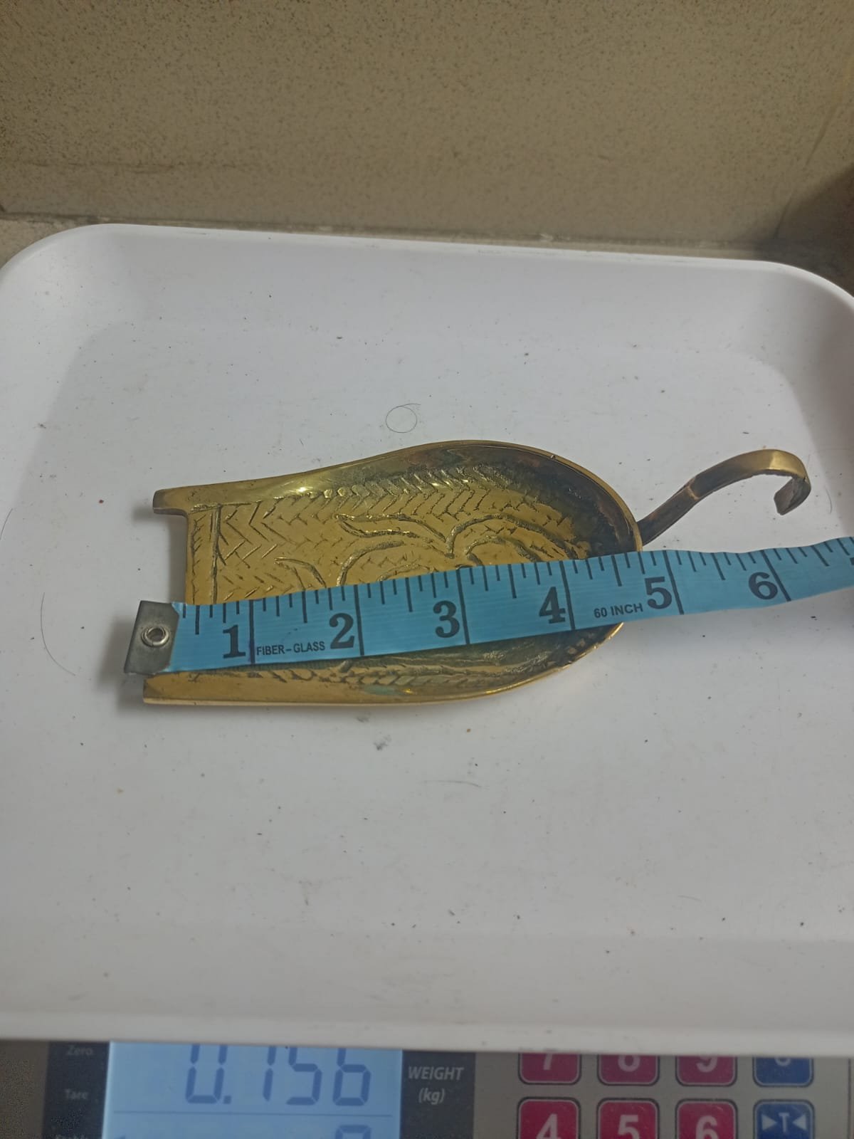 একটি পিতলের তৈরি পূজা সামগ্রী। ছবিতে দেখা যাচ্ছে এটি অনেকটা ছোট খড়ম মতো, তবে পেছনে একটি হুক (বাঁকা অংশ) দেওয়া আছে, যাতে এটি ঝোলানো বা কোথাও আটকা