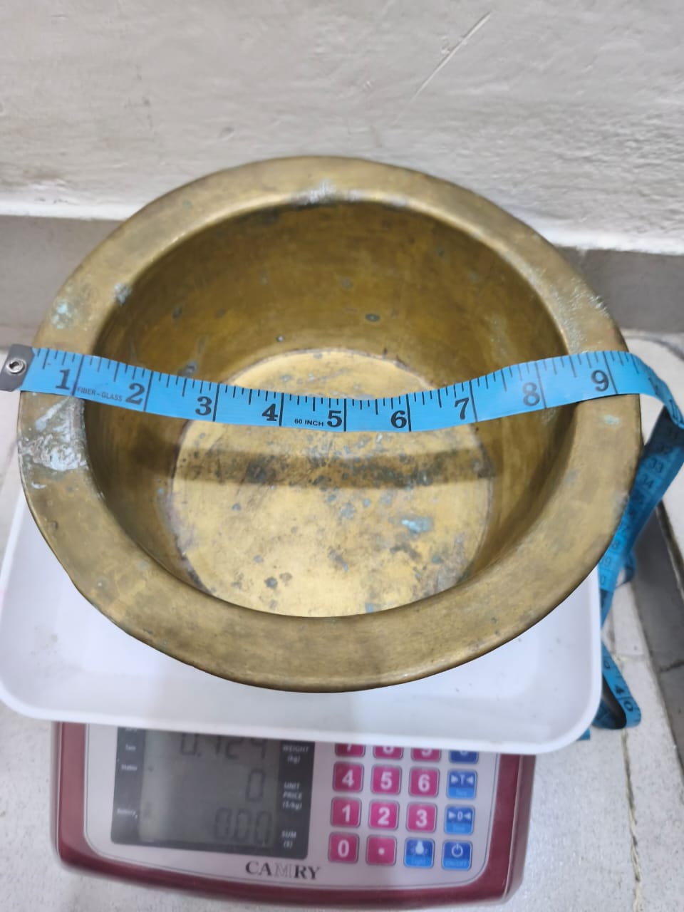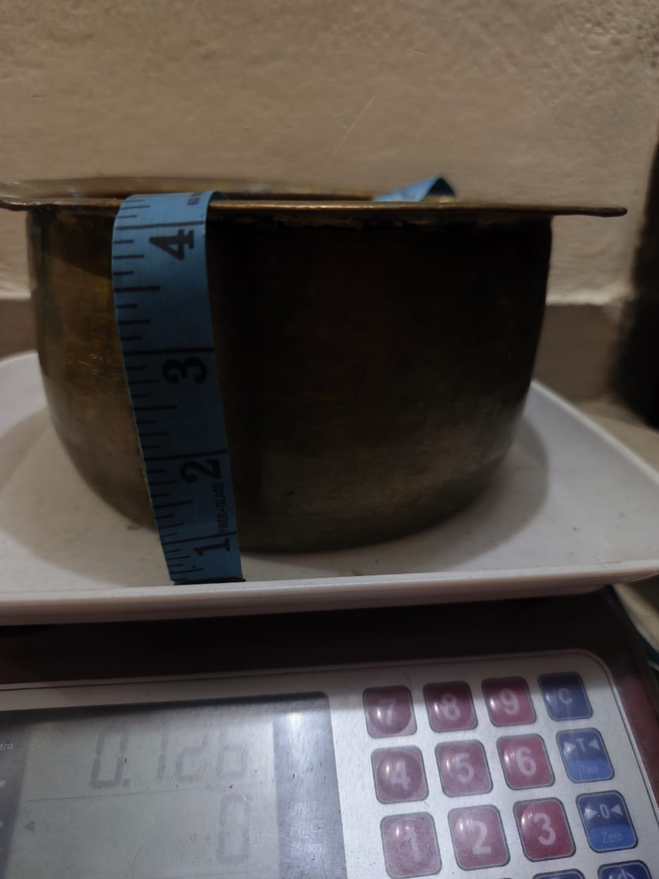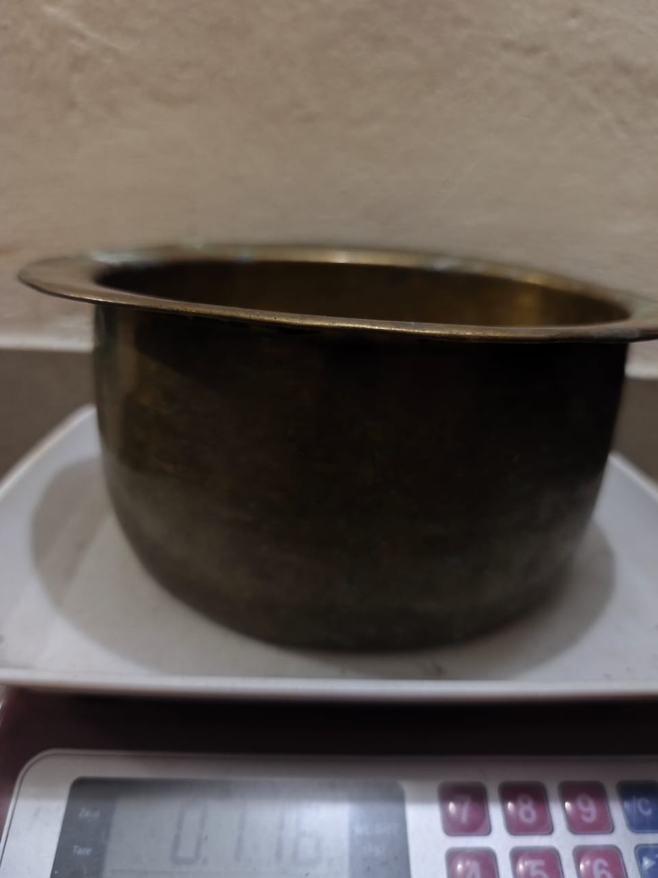 ছবিতে দেখা যাচ্ছে একটি ভারি ও মজবুত পিতলের পুরনো বাটি, যা একটি ডিজিটাল ওজন মেশিনের ওপর রাখা। বাটিটি সম্পূর্ণ গোলাকার এবং গভীর আকৃতির। এর গায়ের উপর হালকা সবুজাভ দাগ ও কালচে ছোপ দেখা যাচ্ছে—যা সাধারণত পুরনো পিতলে সময়ের সাথে অক্সিডেশন বা সবুজ প্যাটিনা তৈরি হলে হয়ে থাকে।