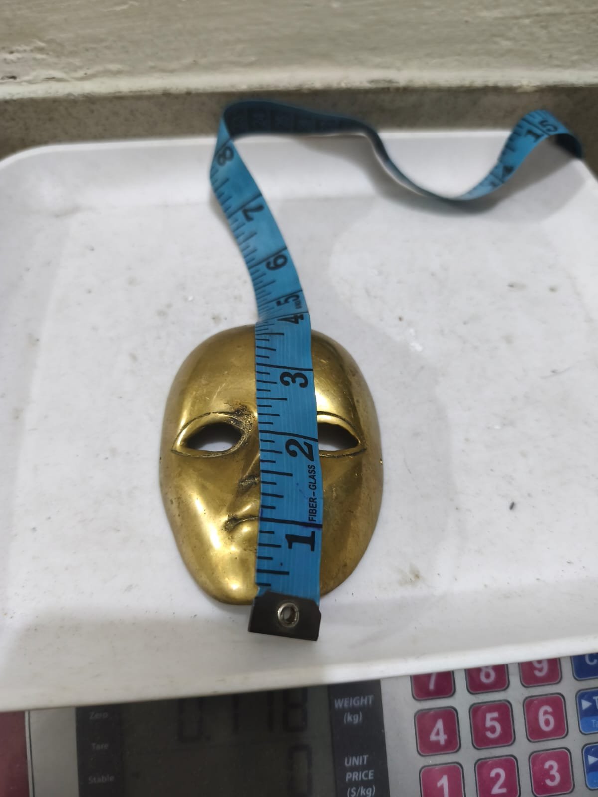 একটি ছোট, শক্ত পিতলের মুখোশ দেখানো হয়েছে, সম্ভবত এটি একটি সাজসজ্জার বা সংগ্রহযোগ্য জিনিস।