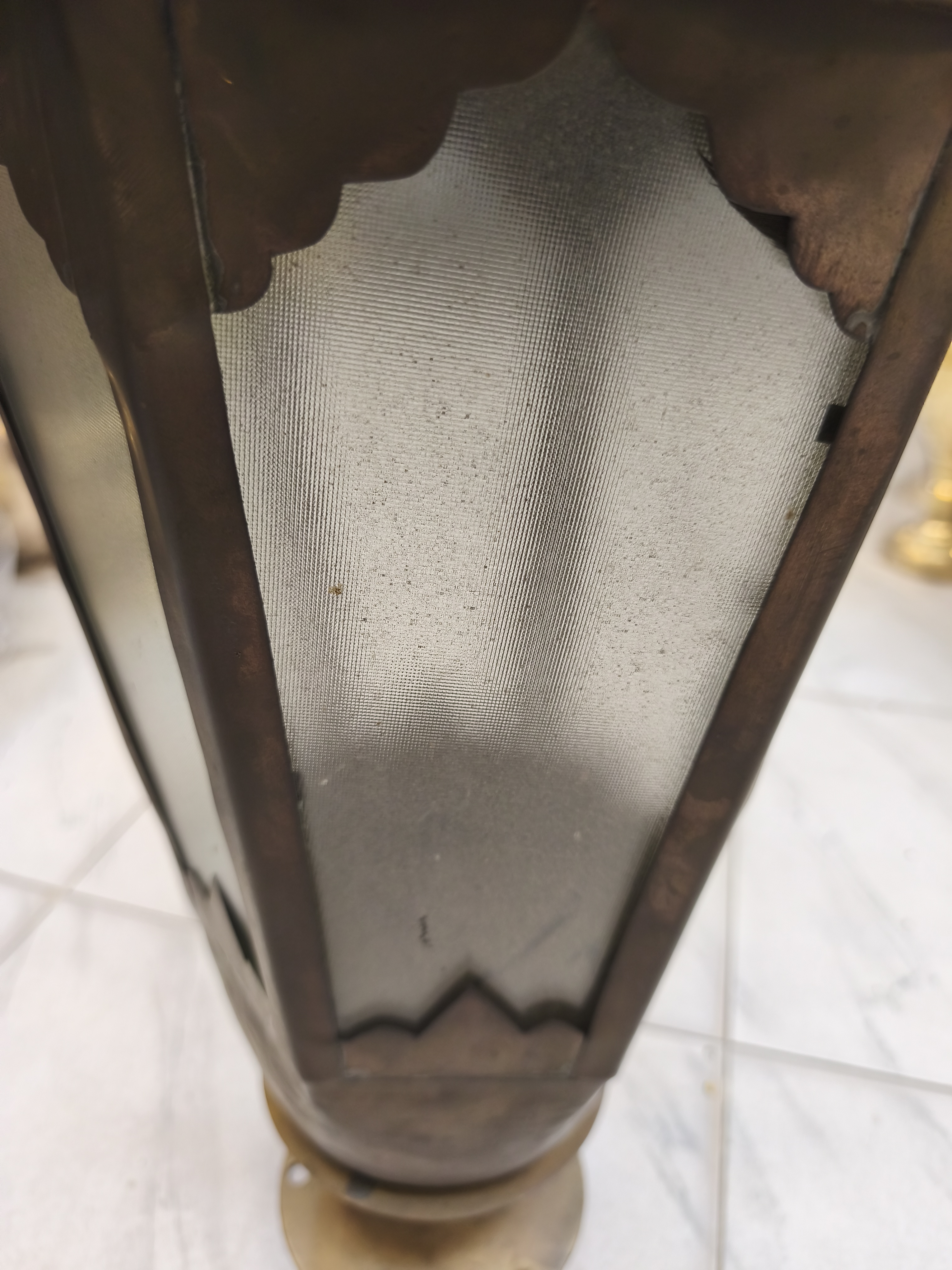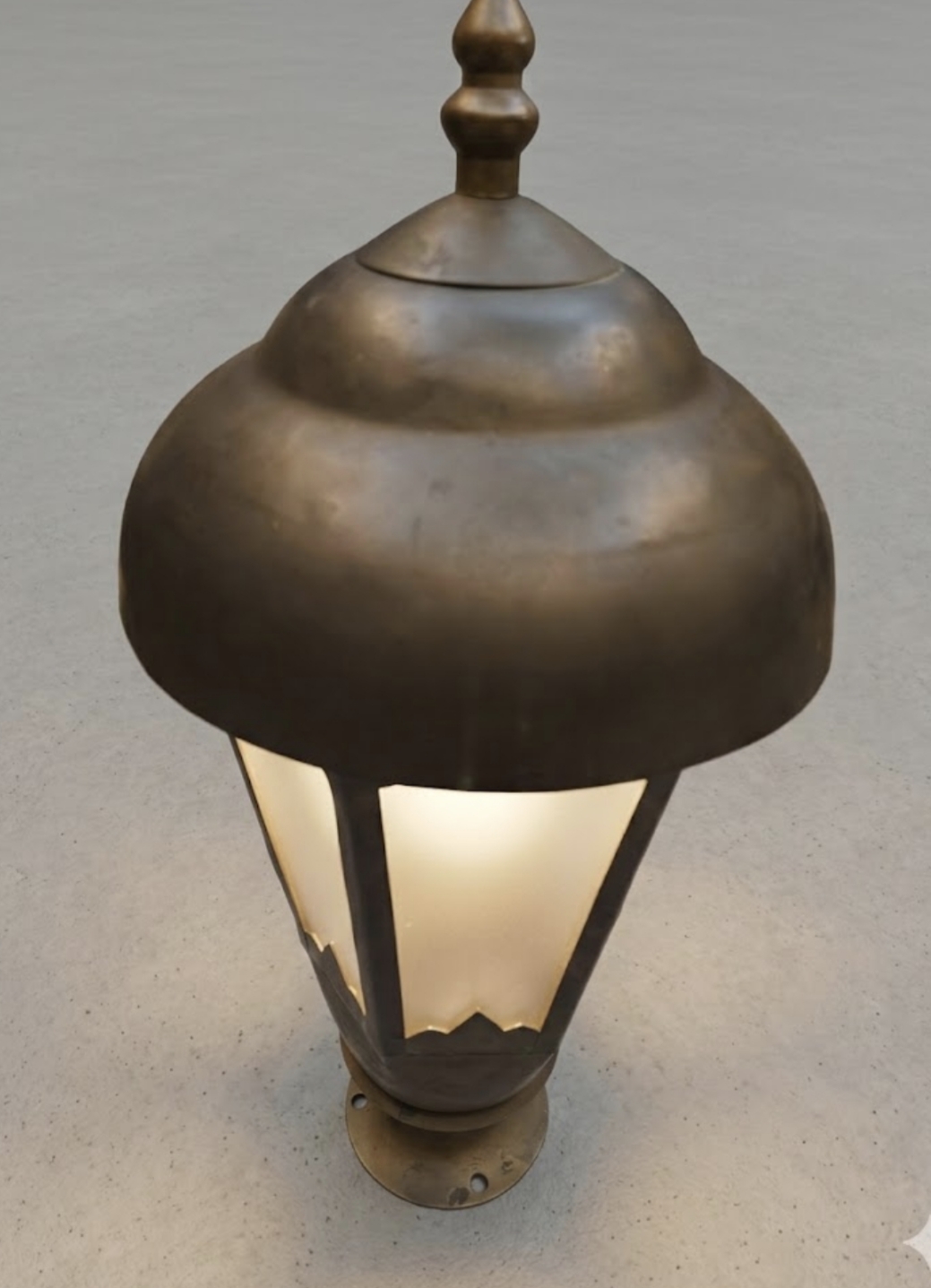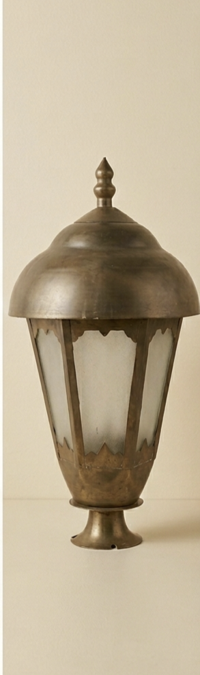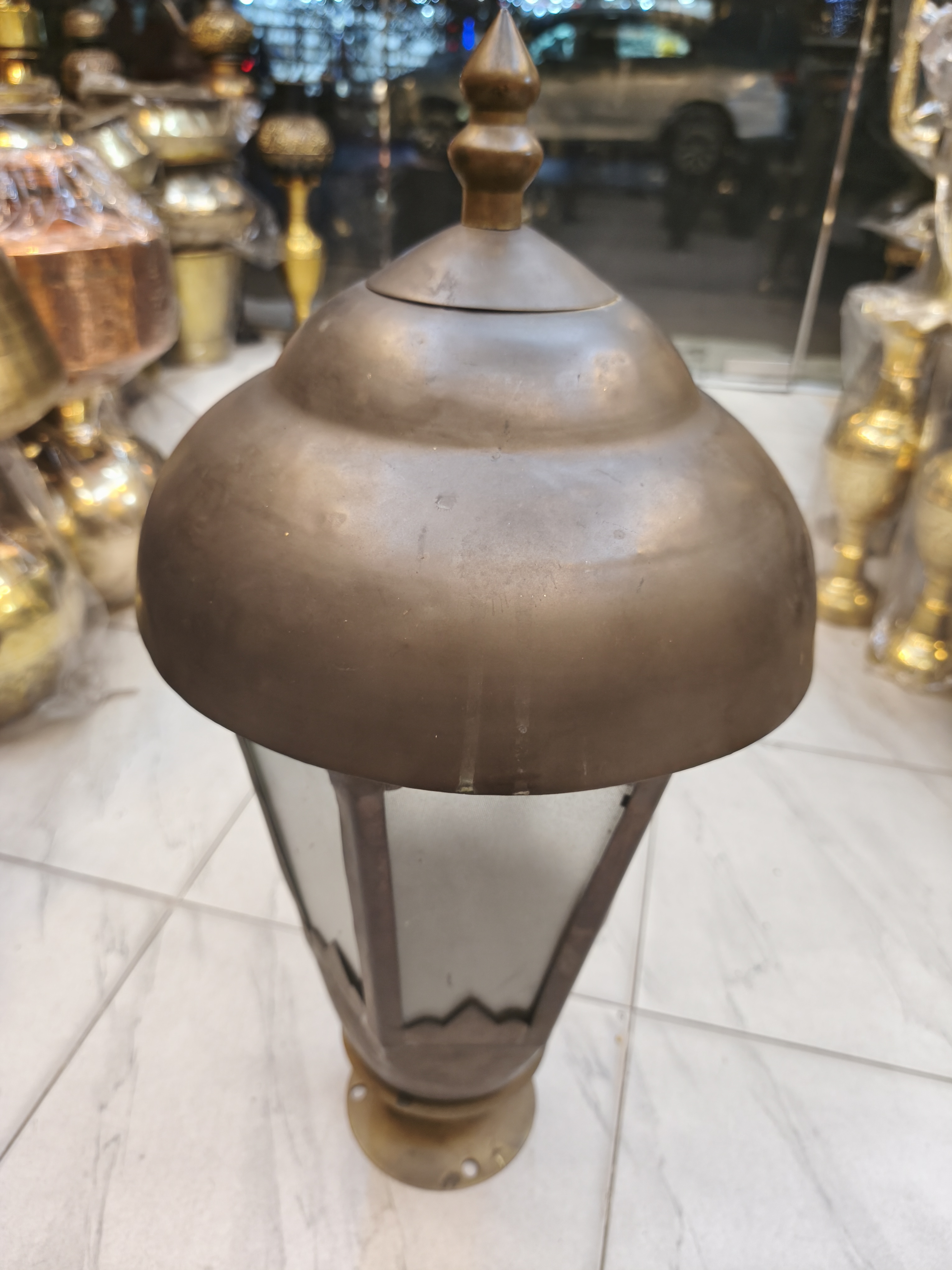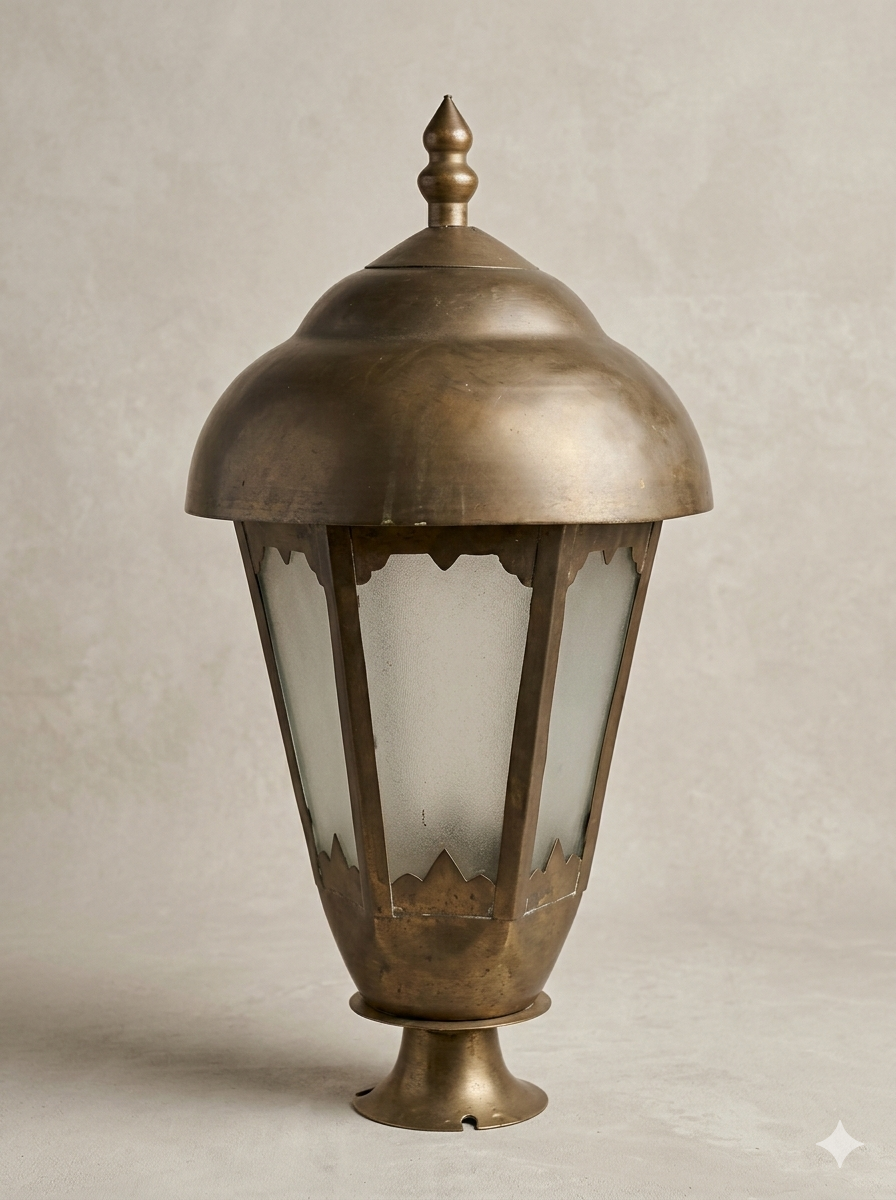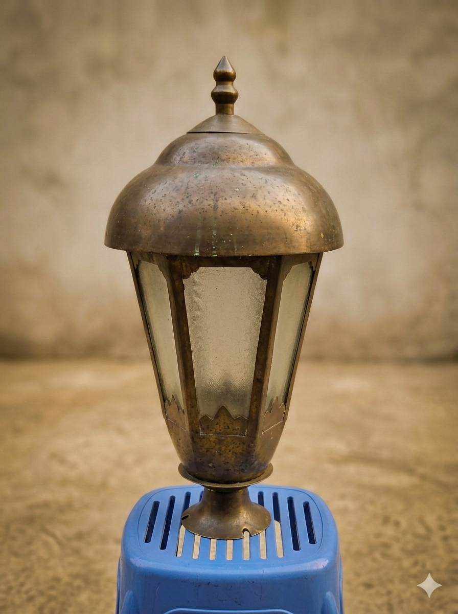 ছবিতে দেখা বস্তুটি একটি ধ পিতলের তৈরি লণ্ঠন। এর উপরের অংশটি গম্বুজ আকৃতির, মাথায় ছোট শিখার মতো নকশা আছে, যা একে রাজকীয় ও প্রাচীন লুক দিয়েছে। চারপাশে কাঁচের প্যানেল বসানো, যার ভেতরে আগে তেলবাতি বা মোমবাতি জ্বালানো হতো এখন লাইটিং সিস্টেম করা।