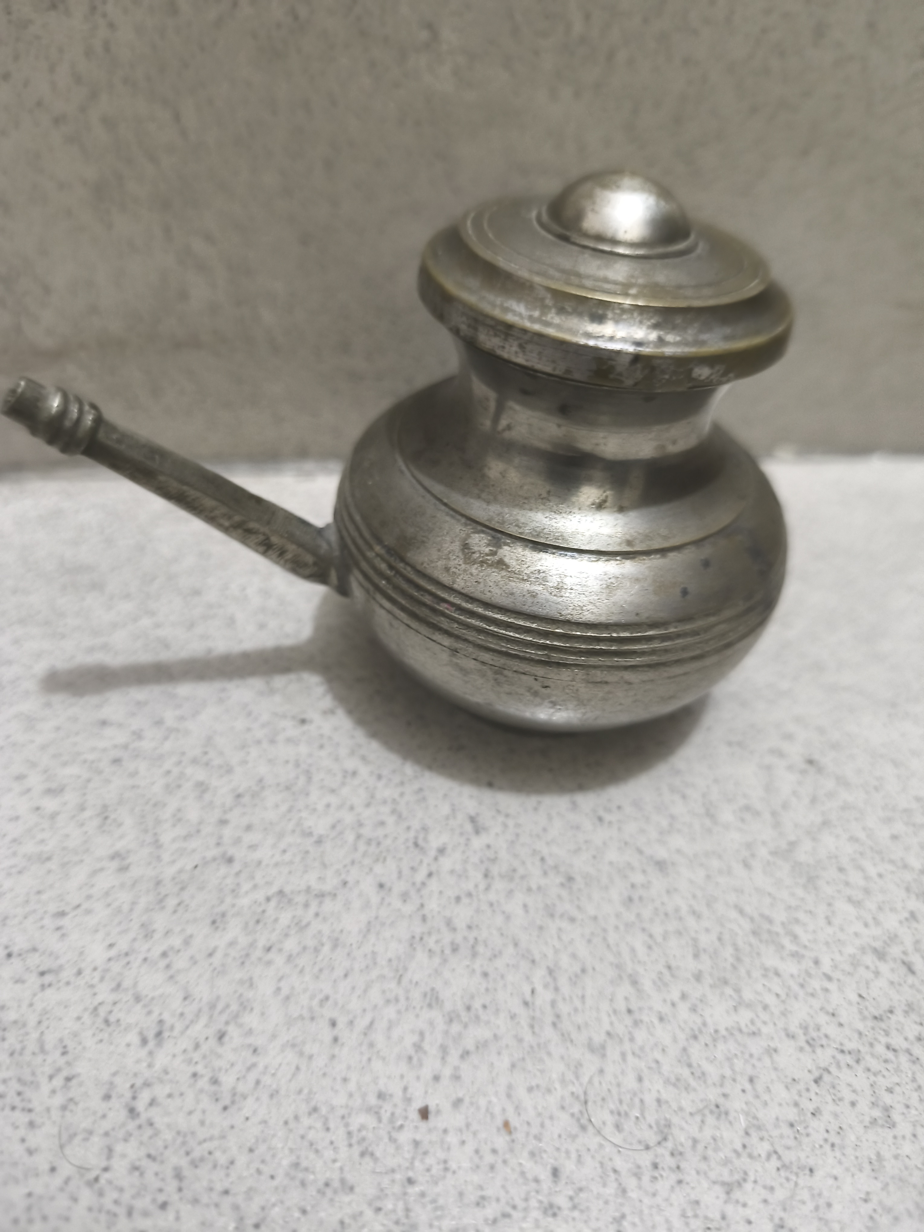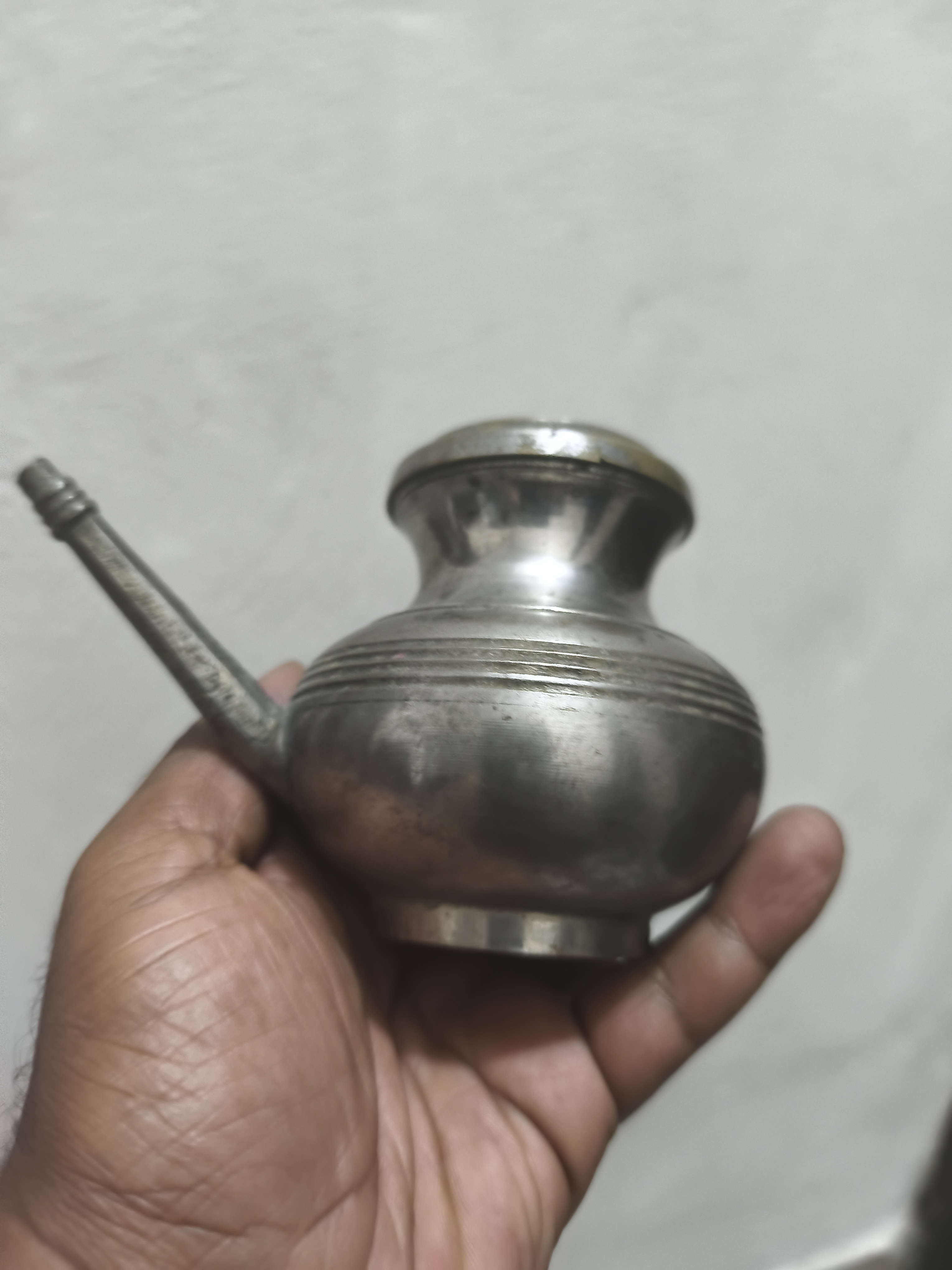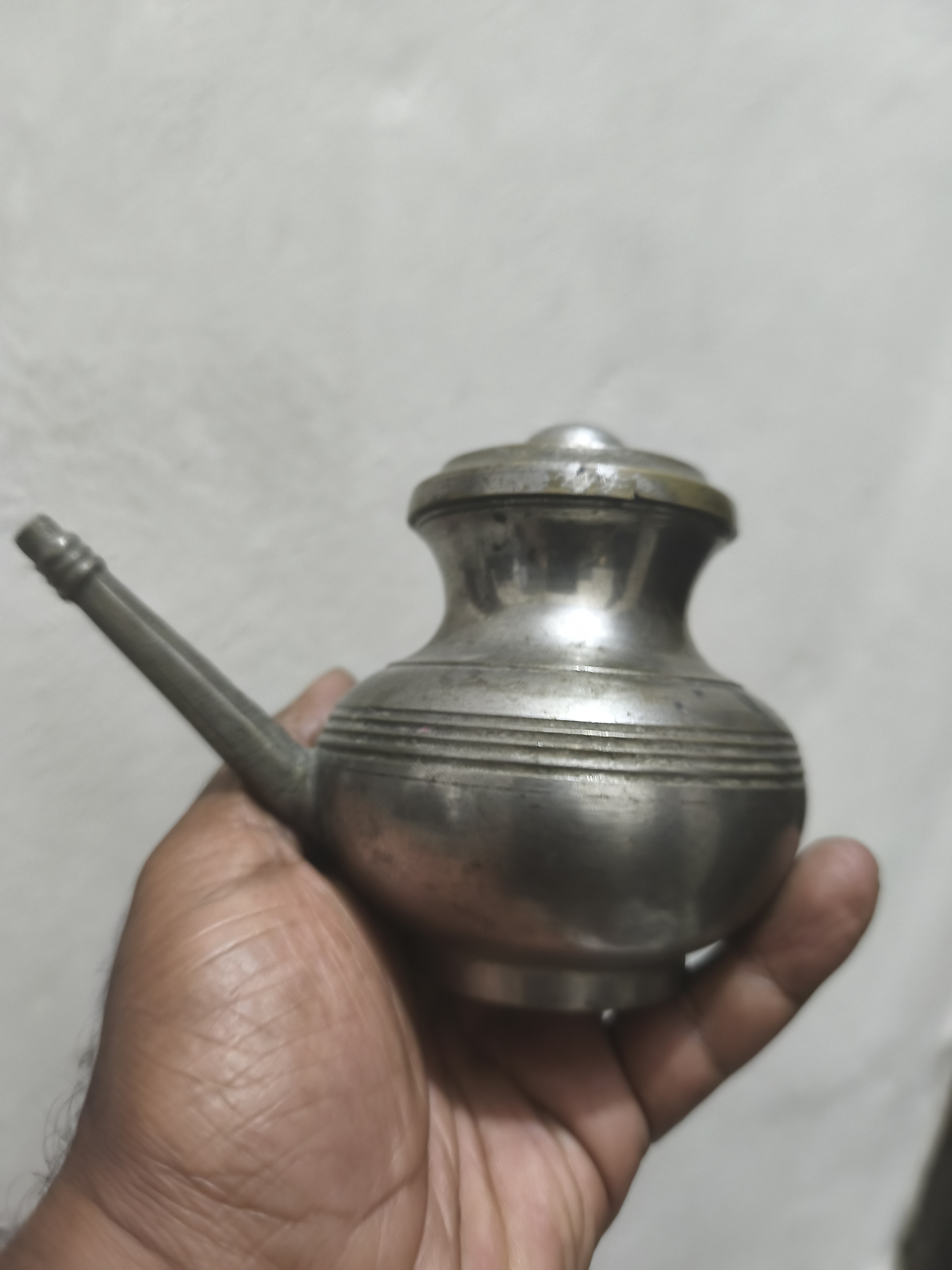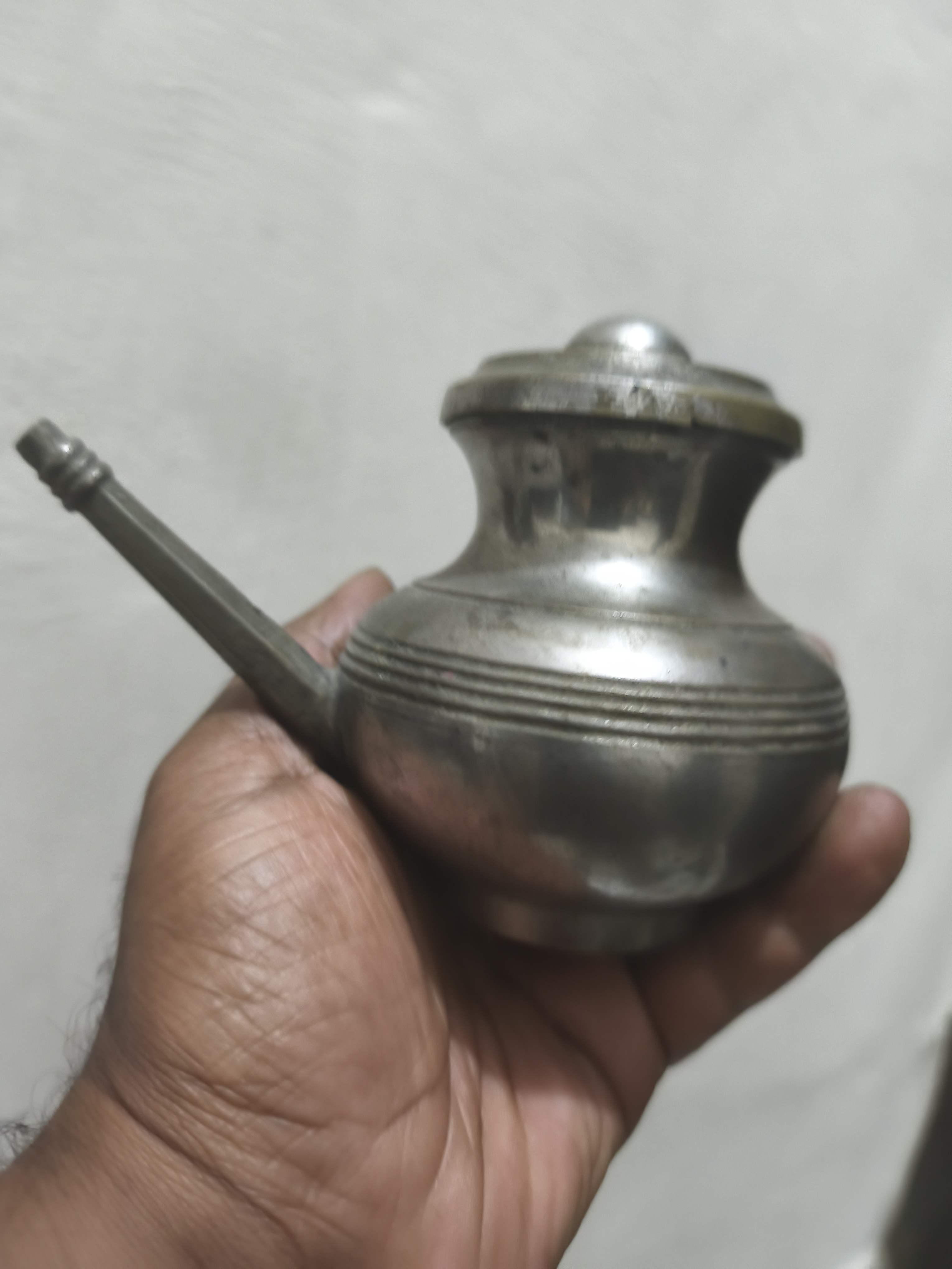 - পাত্রটি পিতলের তৈরি এবং তরল পদার্থ নির্গত করার জন্য এর একটি দীর্ঘ নালী রয়েছে।