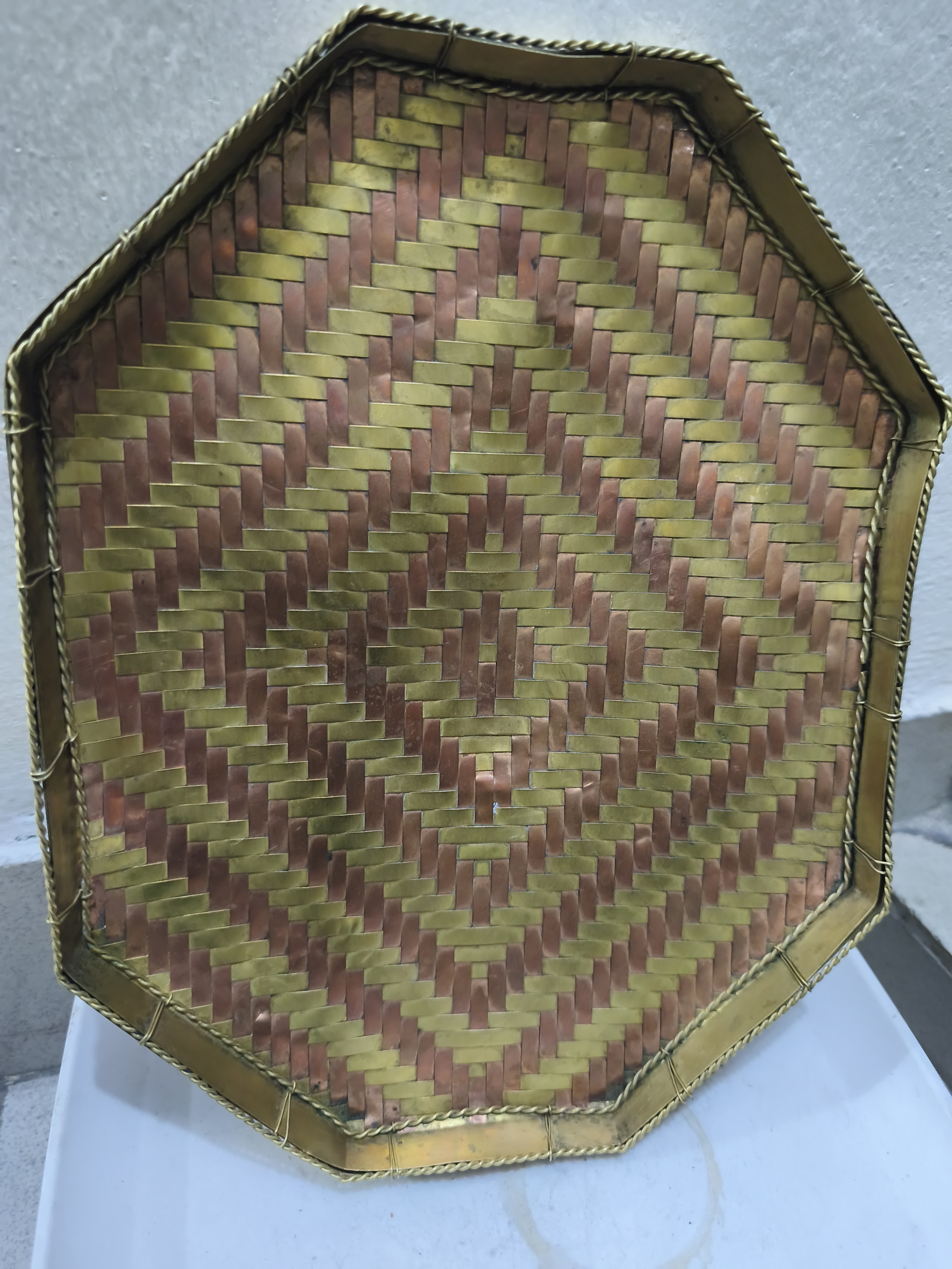 পিতল এবং তামার স্ট্রিপ দিয়ে তৈরি একটি বোনা ট্রে বা ঝুড়ি।