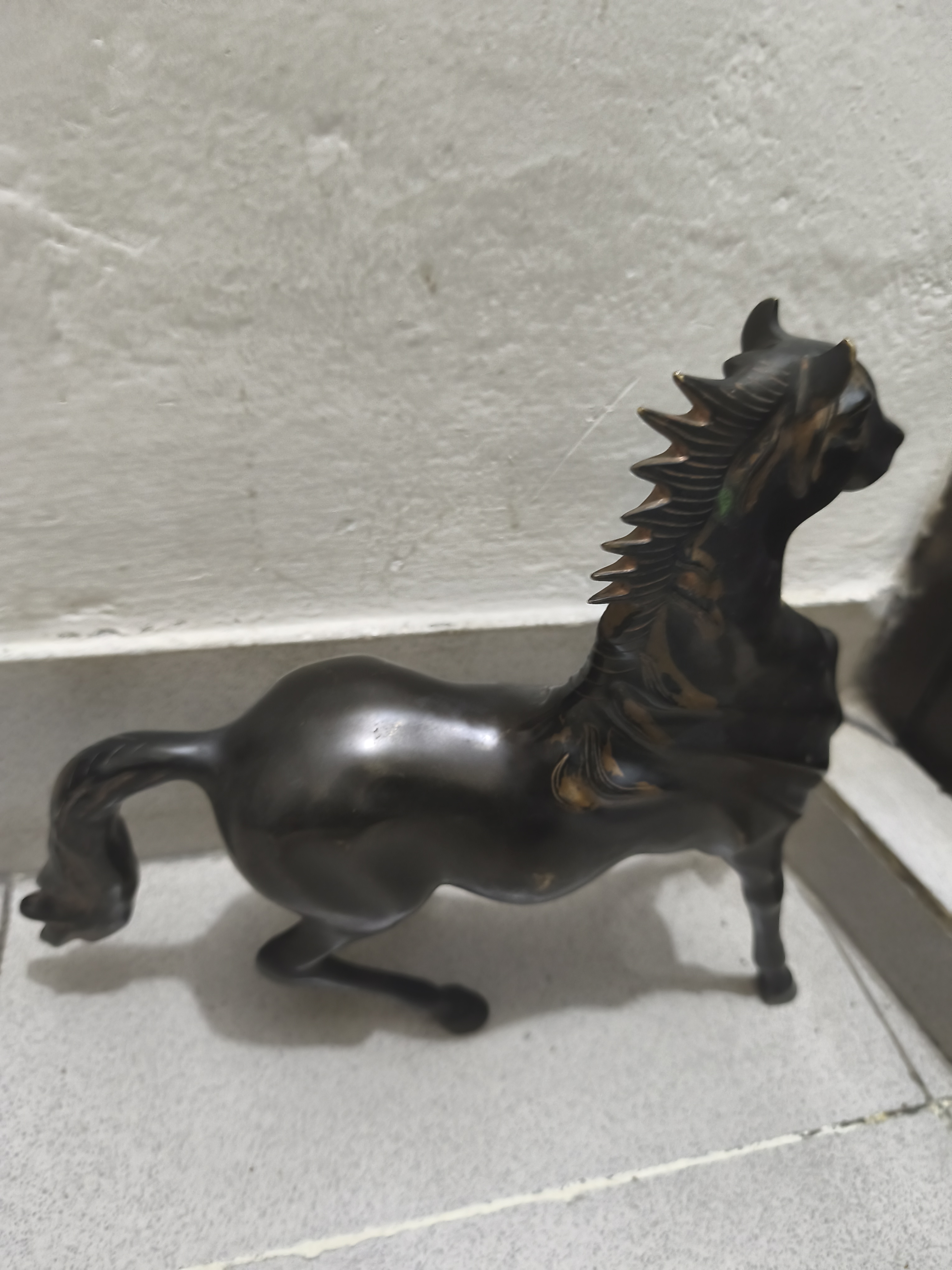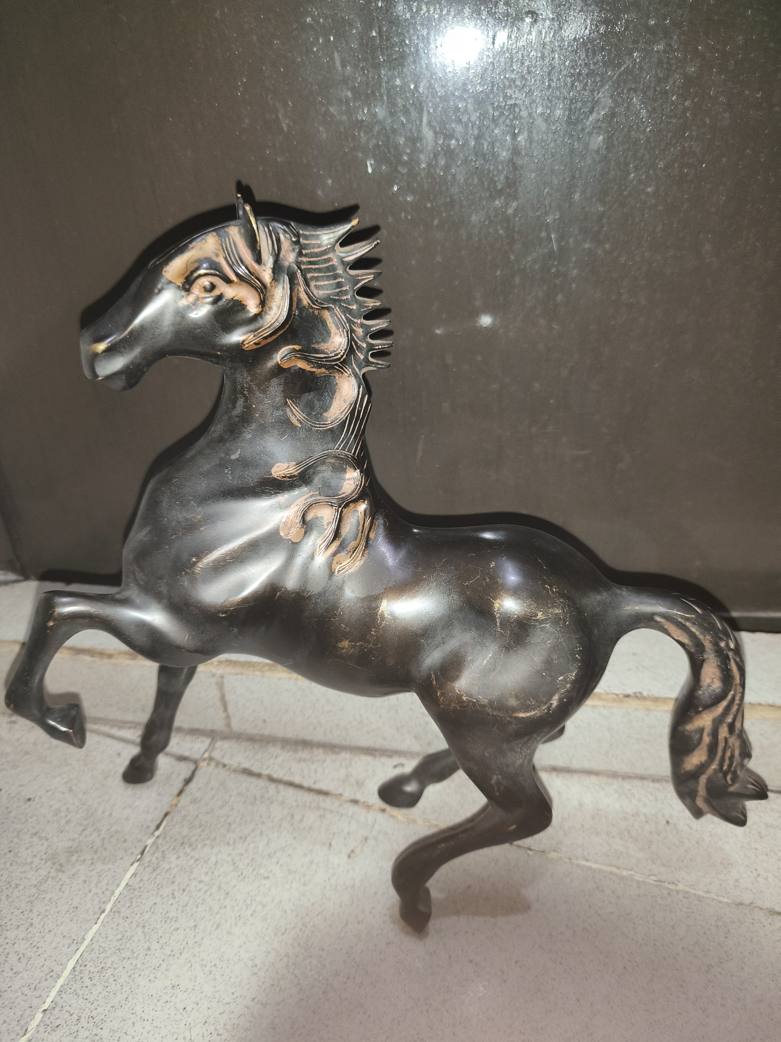 মূর্তিটির রং গাঢ় কালচে, তবে কিছু জায়গায় হালকা সোনালি বা তামাটে আভা দেখা যাচ্ছে, যা এটিকে আরও আকর্ষণীয় করে তুলেছে। এর কেশর (গলার চুল) খাড়া এবং স্টাইলিশভাবে ডিজাইন করা, আর শরীরের গঠনও বেশ মসৃণ ও নান্দনিক।