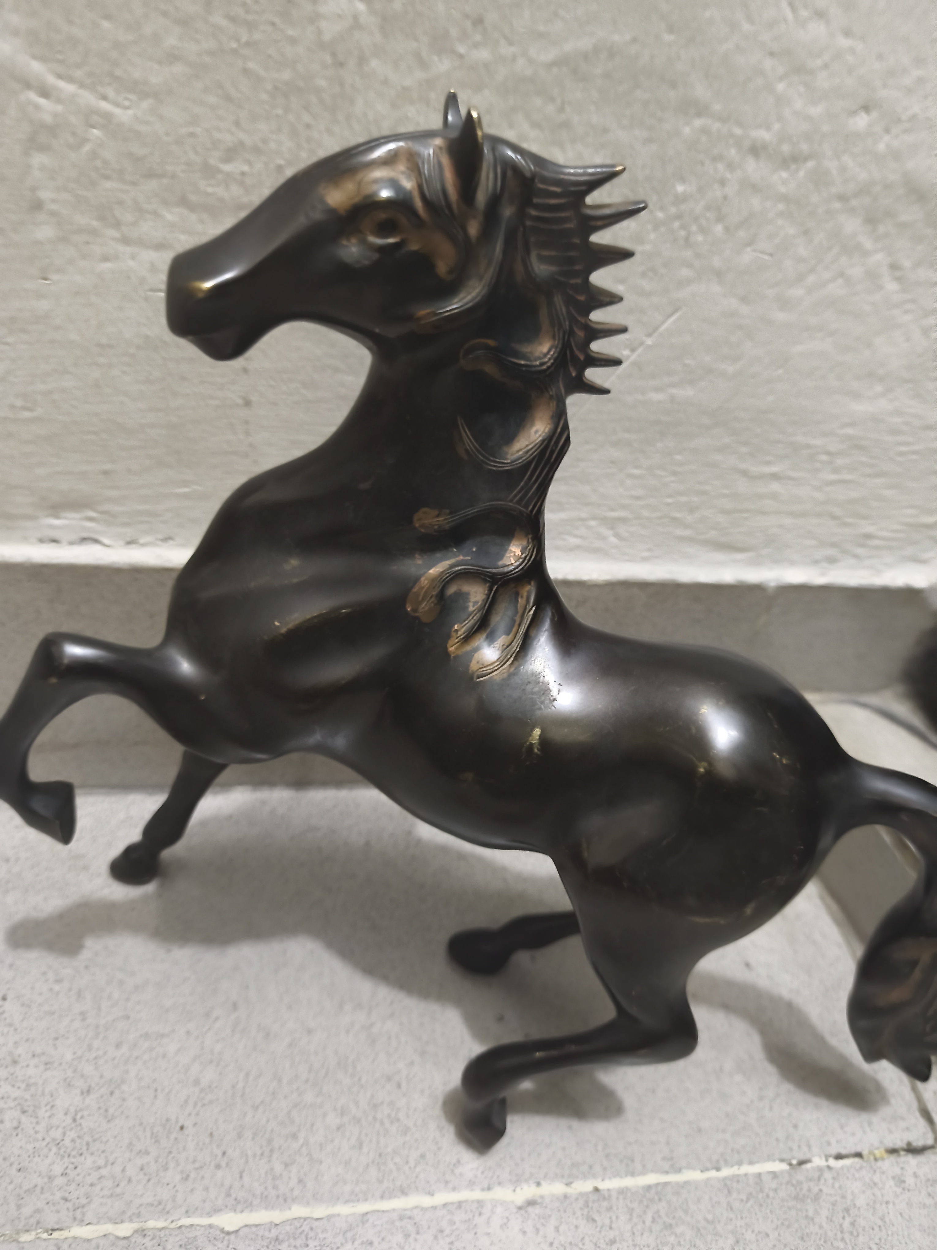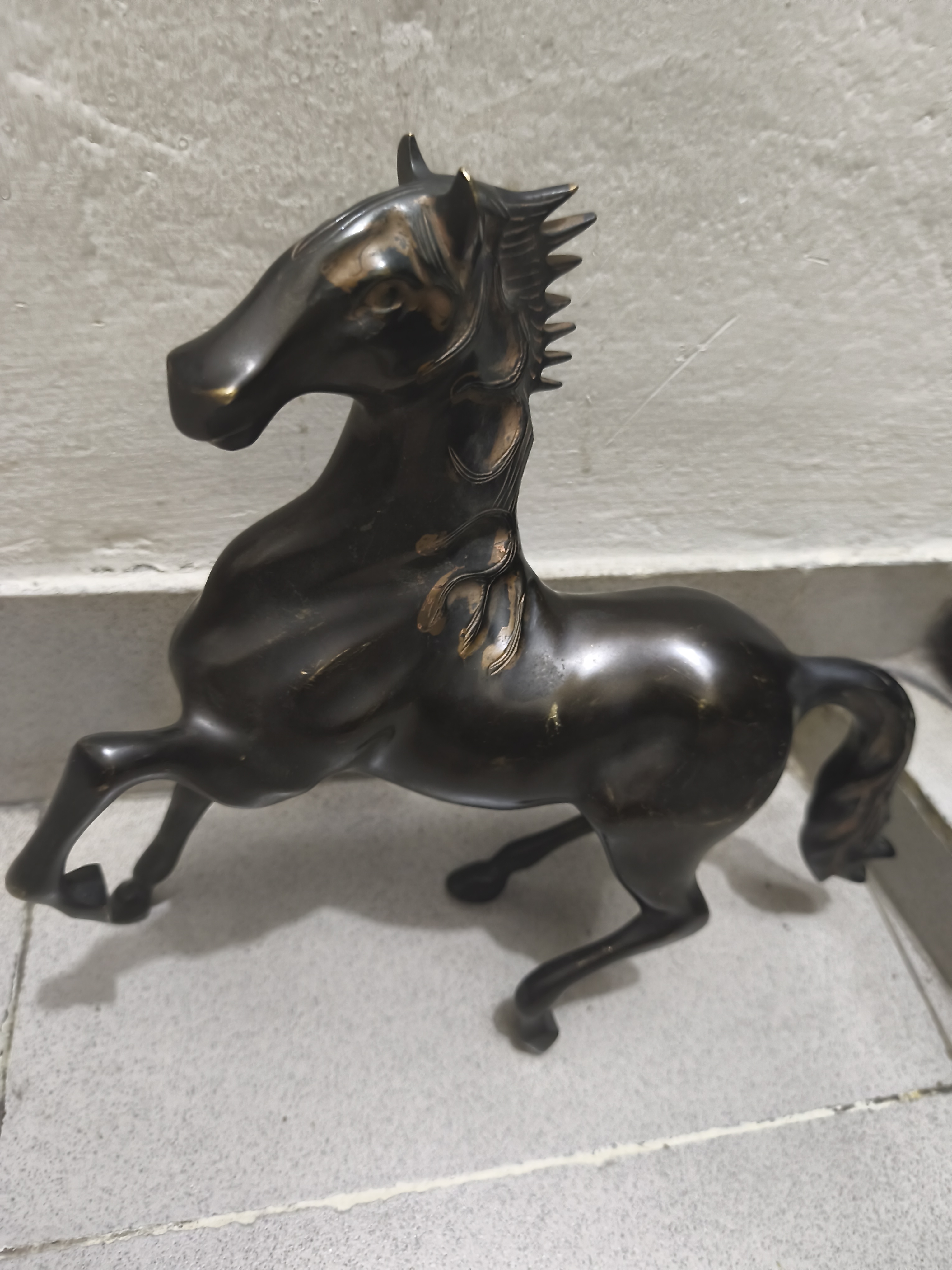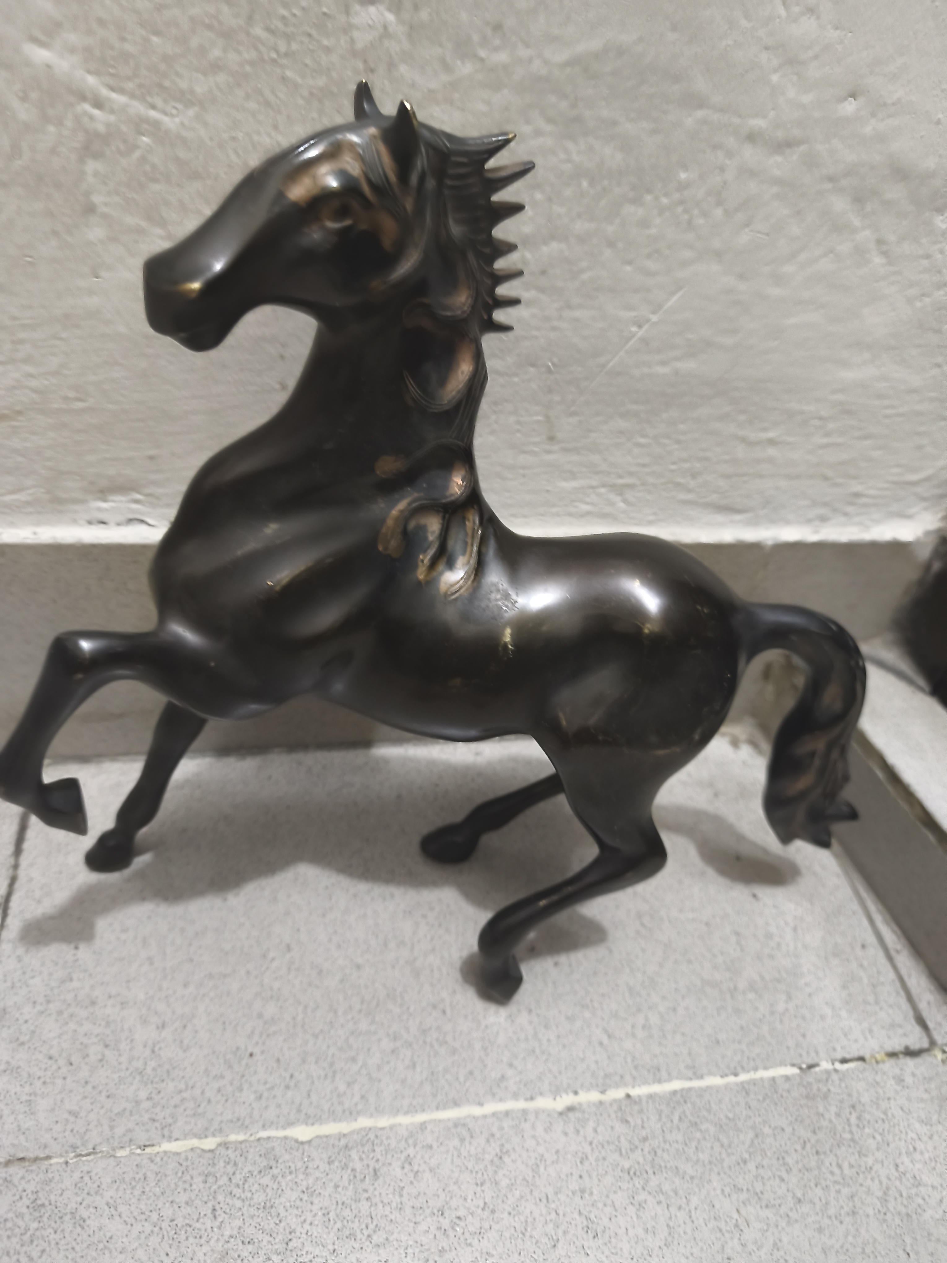 একটি ঘোড়ার মূর্তি দেখা যাচ্ছে। এটি সম্ভবত ধাতু (যেমন ব্রোঞ্জ বা পিতল) দিয়ে তৈরি। ঘোড়াটি সামনের দুই পা তুলে দাঁড়িয়ে আছে, যাকে “rearing horse” ভঙ্গি বলা হয়।