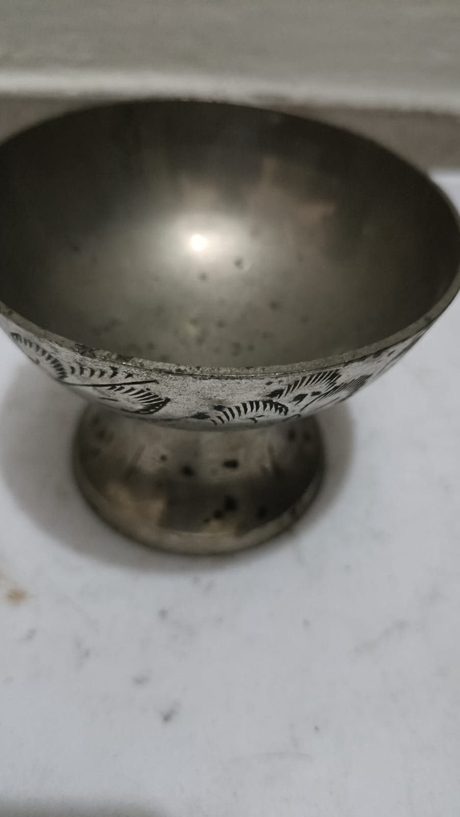 একটি ভিনটেজ বা অ্যান্টিক পেডেস্টাল বাটি, সম্ভবত রূপালী ধাতু, পিউটার বা স্টেইনলেস স্টিল দিয়ে তৈরি।