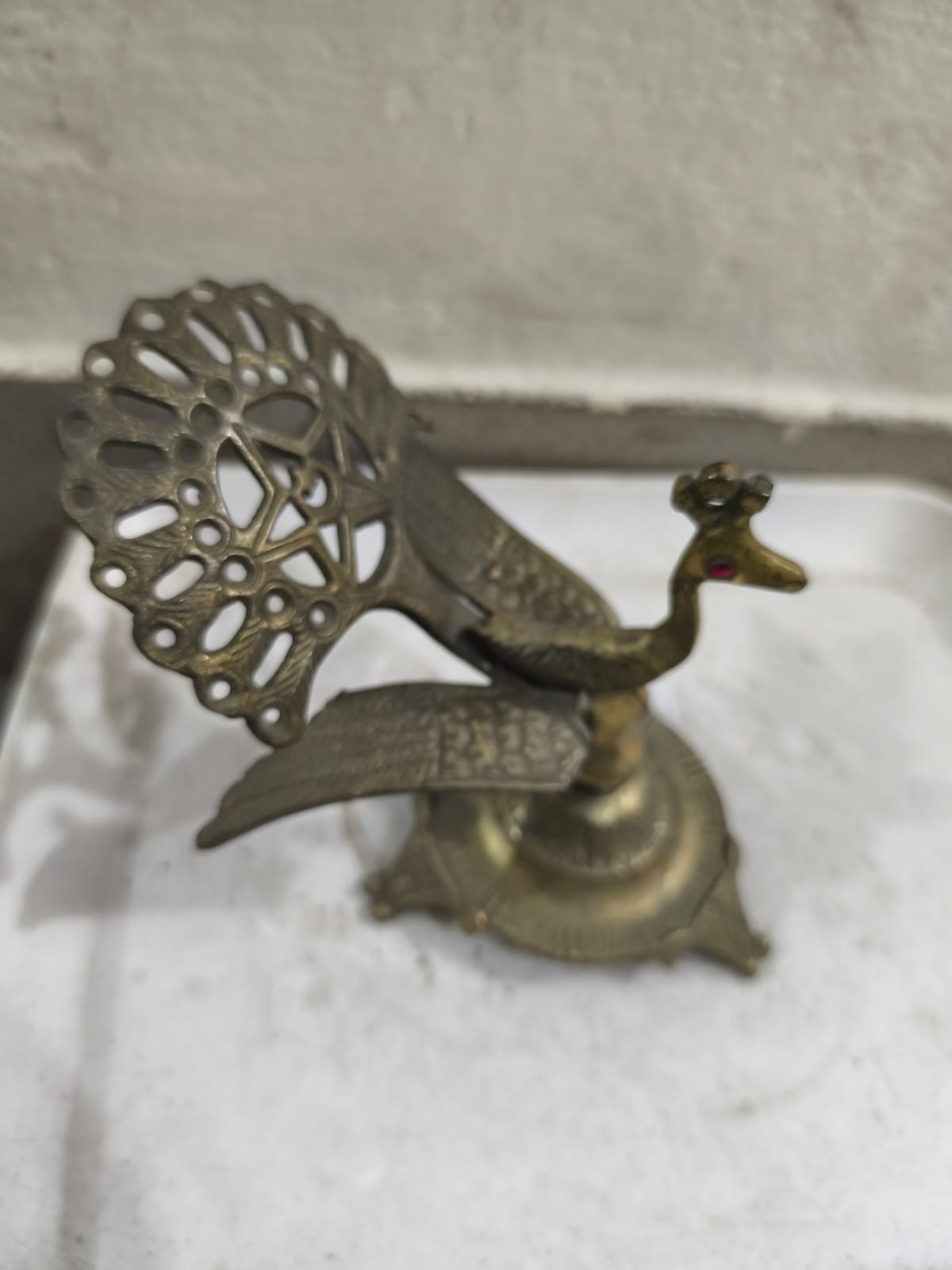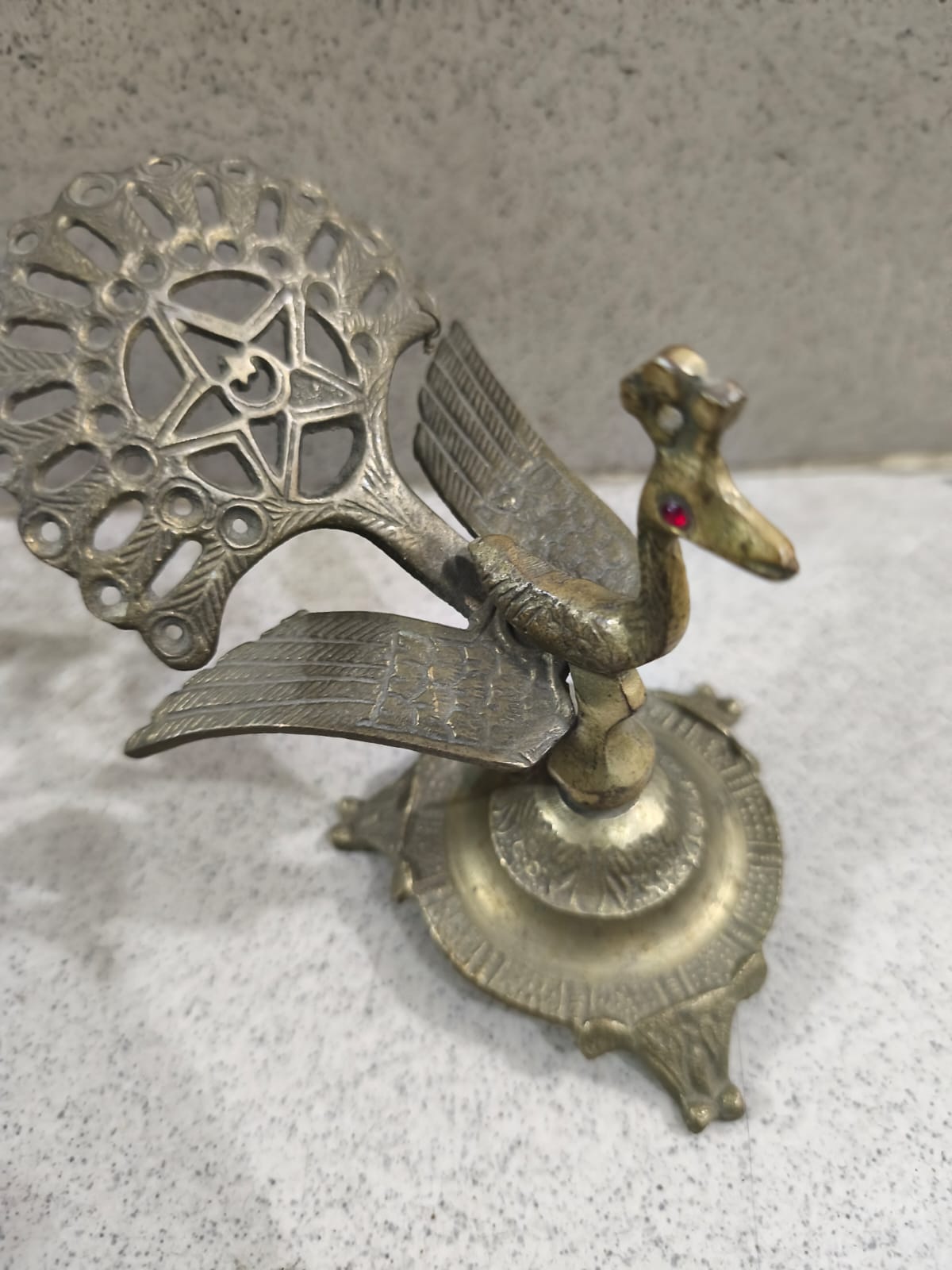 - নকশা: এতে একটি ময়ূর বা পাখির মূর্তি রয়েছে যার চোখে একটি লাল পাথর বসানো আছে। পেছনের অংশটি একটি সূক্ষ্ম নকশা করা পাখা বা ঝুড়ির মতো দেখতে।
