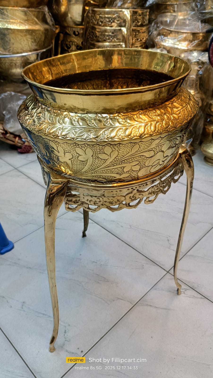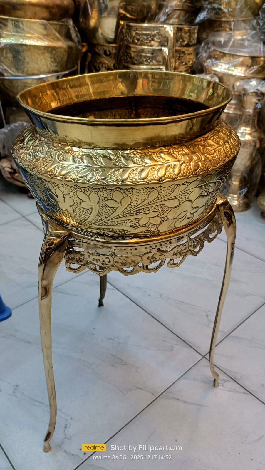 11" হাতখোদাই নকশাযুক্ত পিতলের ফুলদানি স্ট্যানসহ