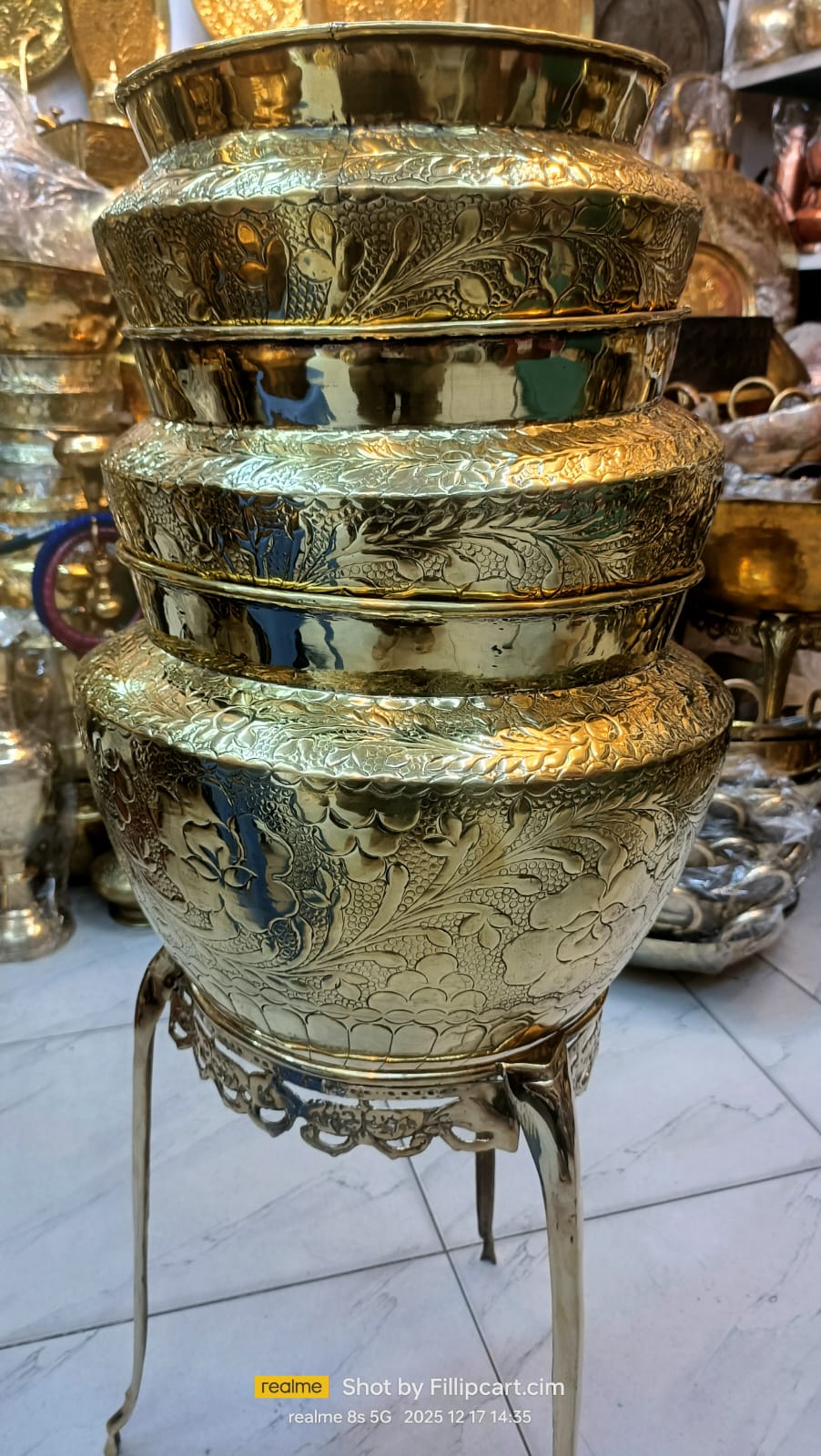 উন্নত মানের পিতল দিয়ে তৈরি এই ফুলদানিটি সম্পূর্ণ হাতে খোদাই করা। ফুল ও লতাপাতার নকশা এবং উজ্জ্বল গোল্ডেন ফিনিশিং একে ঘরের জন্য আভিজাত্যপূর্ণ ডেকোর আইটেমে পরিণত করেছে।
