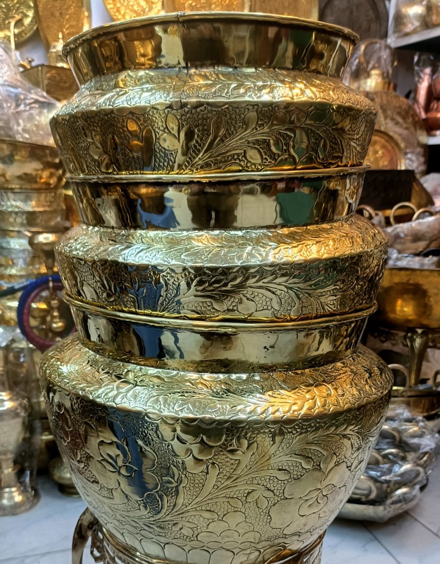 উন্নত মানের পিতল দিয়ে তৈরি এই ফুলদানিটি সম্পূর্ণ হাতে খোদাই করা। ফুল ও লতাপাতার নকশা এবং উজ্জ্বল গোল্ডেন ফিনিশিং একে ঘরের জন্য আভিজাত্যপূর্ণ ডেকোর আইটেমে পরিণত করেছে।