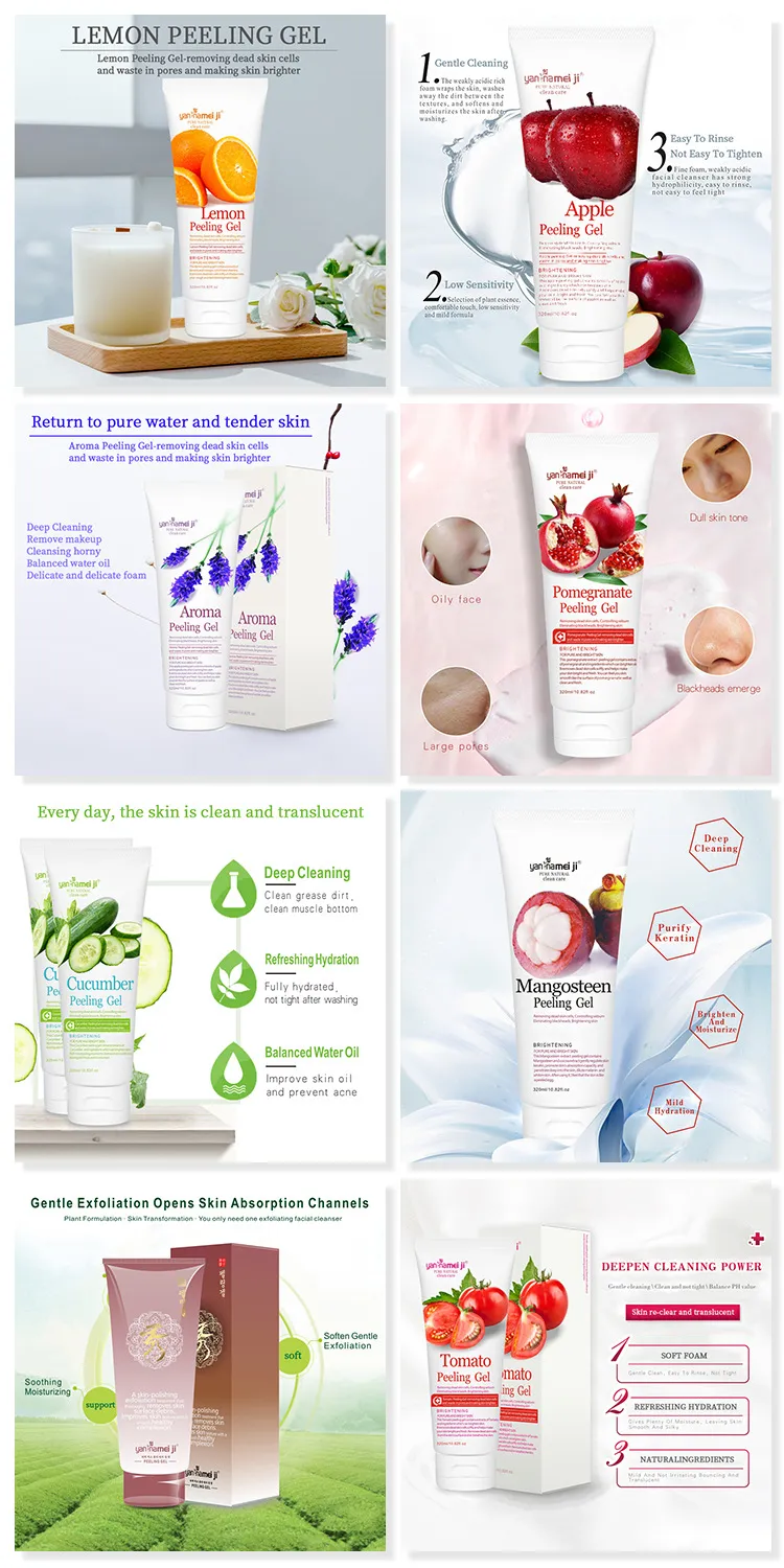 Exfoliating gels are available in seven different flavors: apple, pomegranate, cucumber, lemon, mangosteen, tomato, and aromatic.