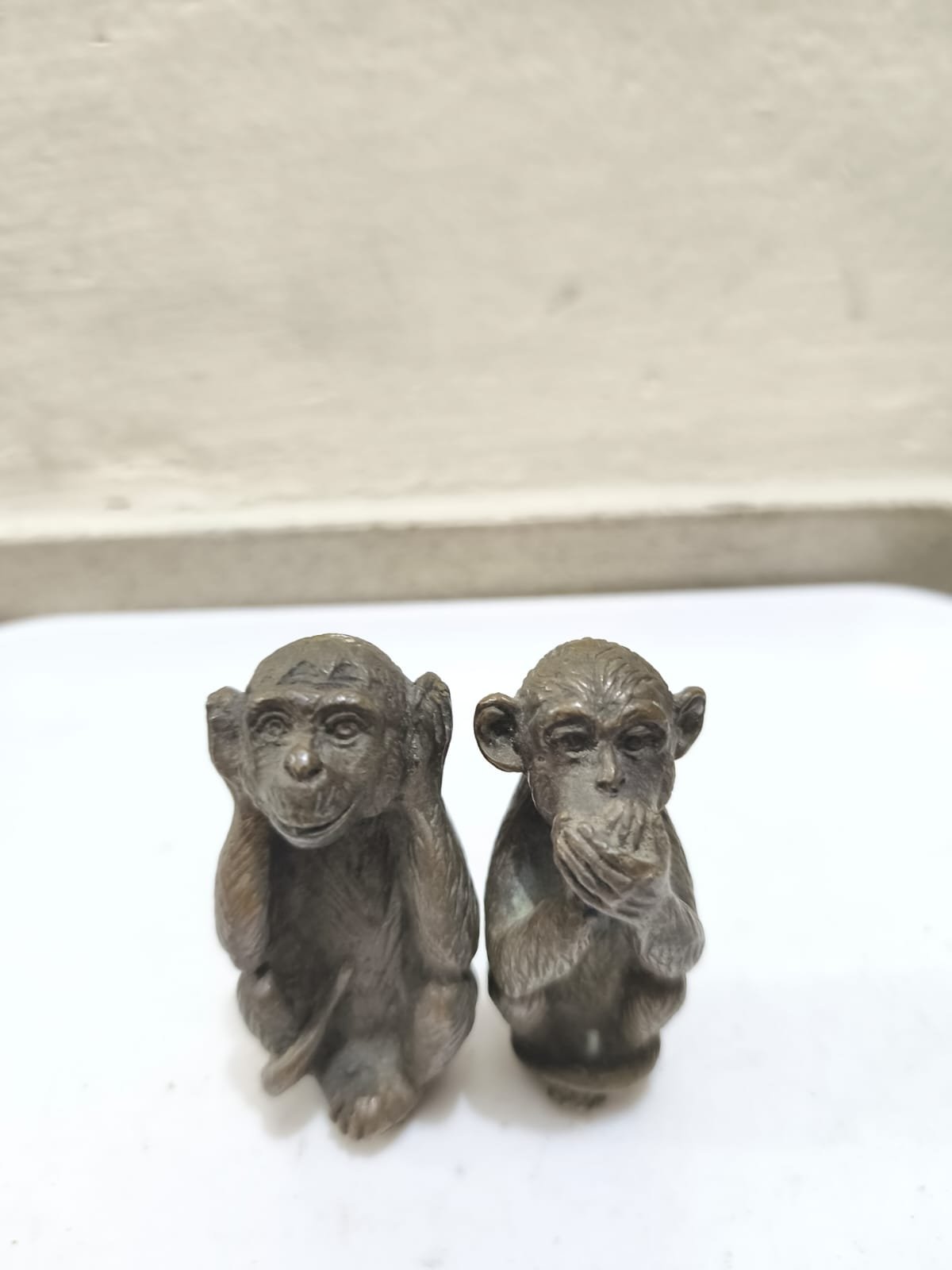 দুটি বানরের ছোট ধাতব মূর্তি, যেগুলো বিখ্যাত “Three Wise Monkeys” ধারণার অংশ বলে মনে হচ্ছে।